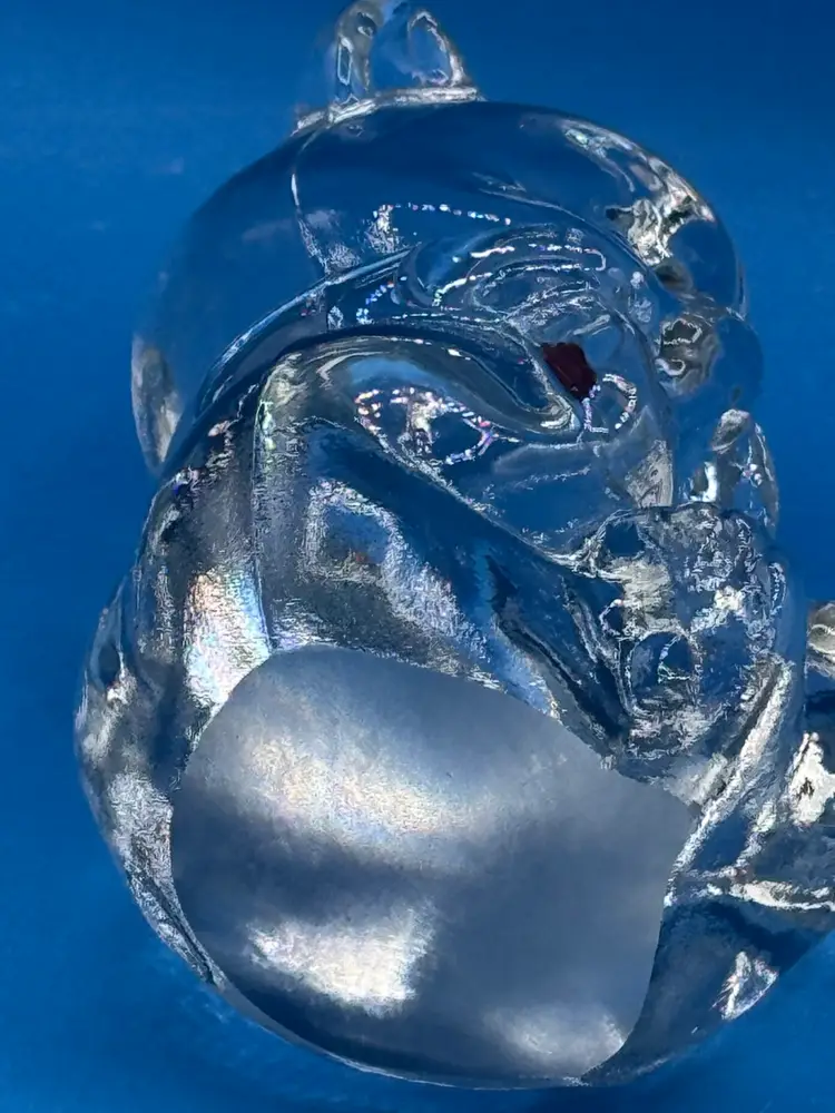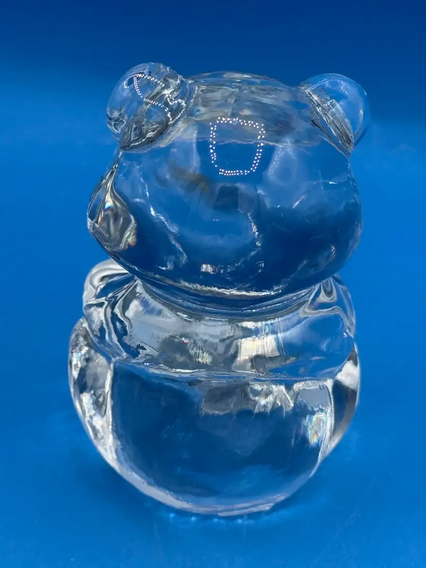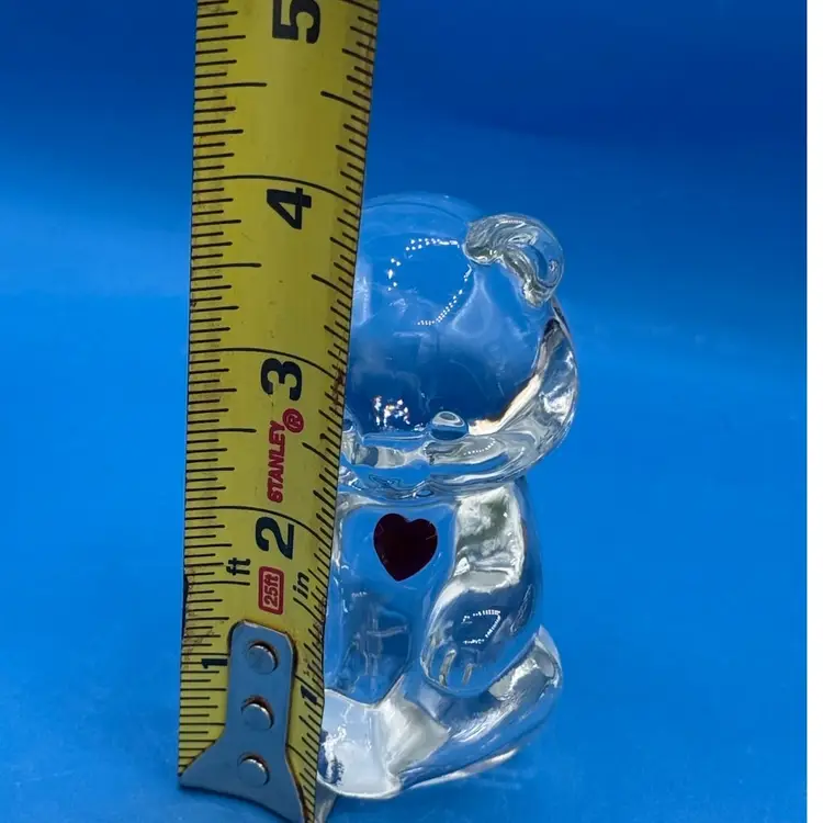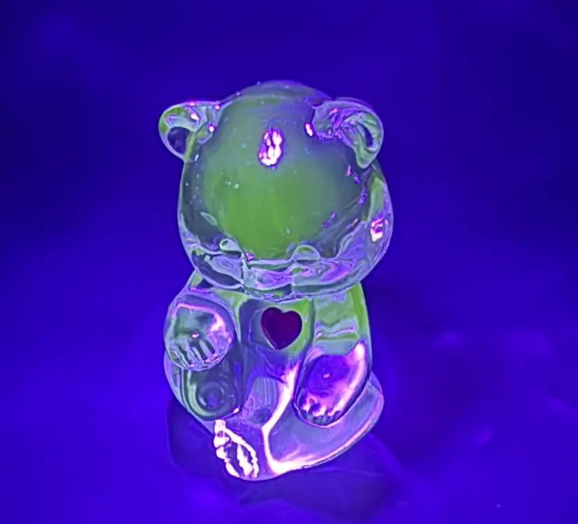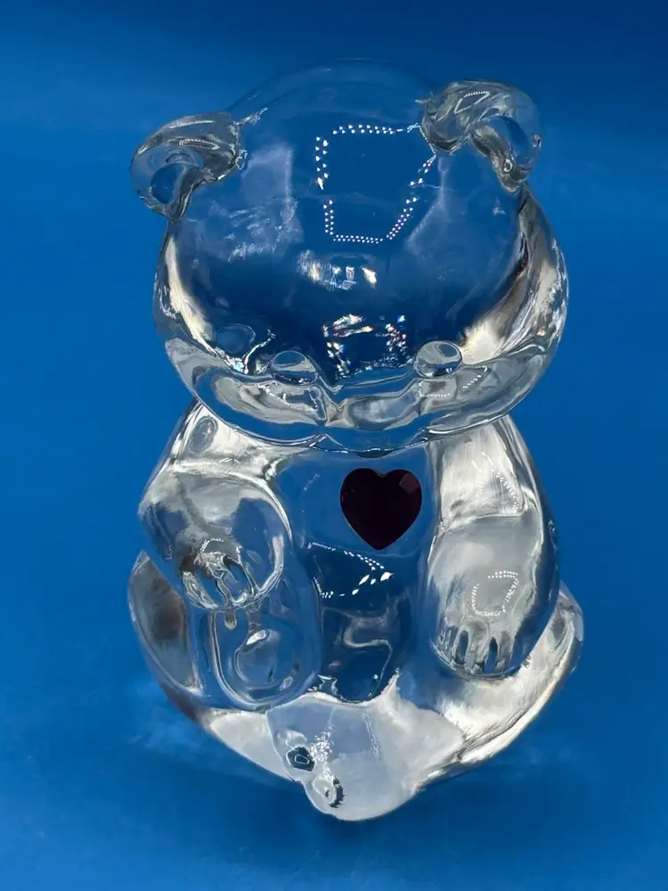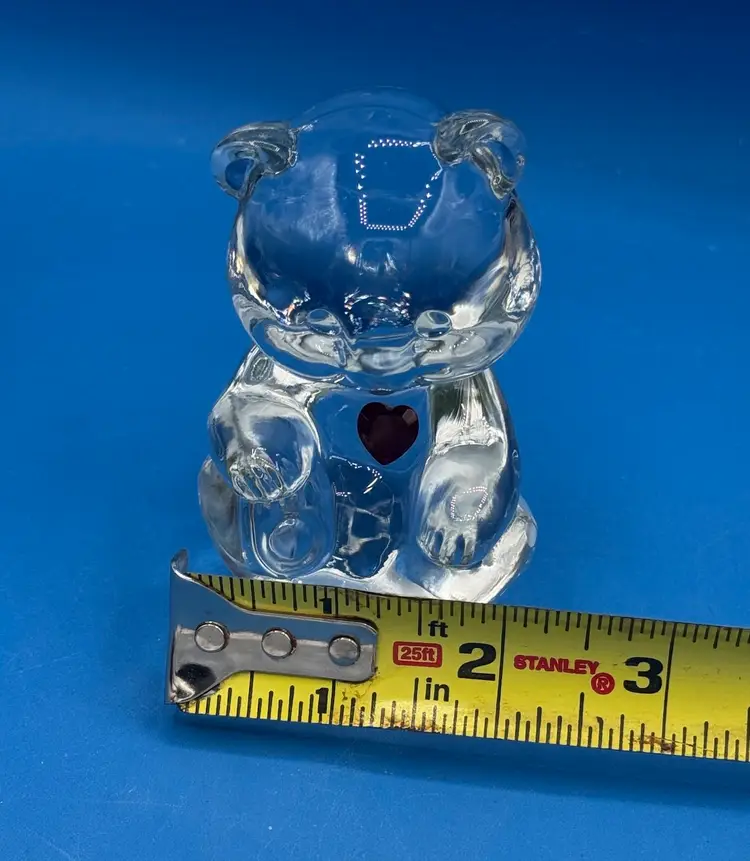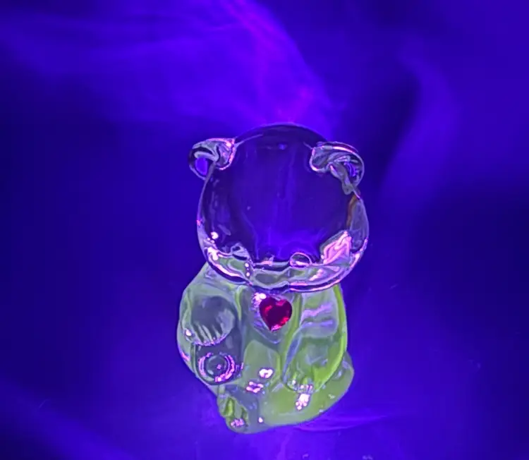 A sweet teddy bear celebrating the January birthdays with a red faceted heart detail. Measures around 4” tall and 2 “ wide. Good condition with no chips, cracks or bruising noted. Glows under UV.