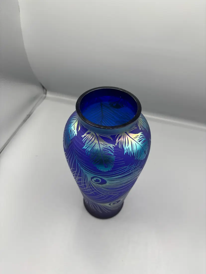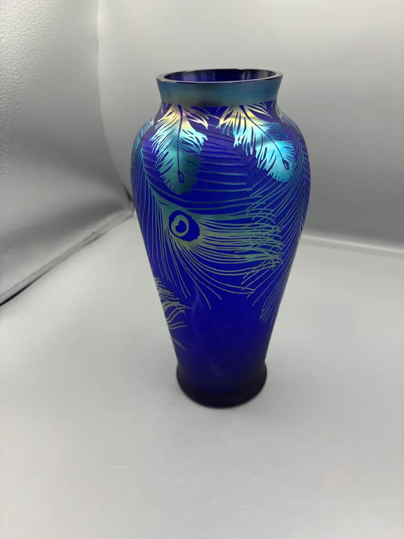 This striking peacock vase by Fenton, designed by Kelsey Murphy, showcases exquisite artistry in a compact 10 x 5 inch format. The piece captures the elegance of peacock imagery with refined craftsmanship, making it an ideal accent for collectors and design enthusiasts seeking distinctive glasswork.
