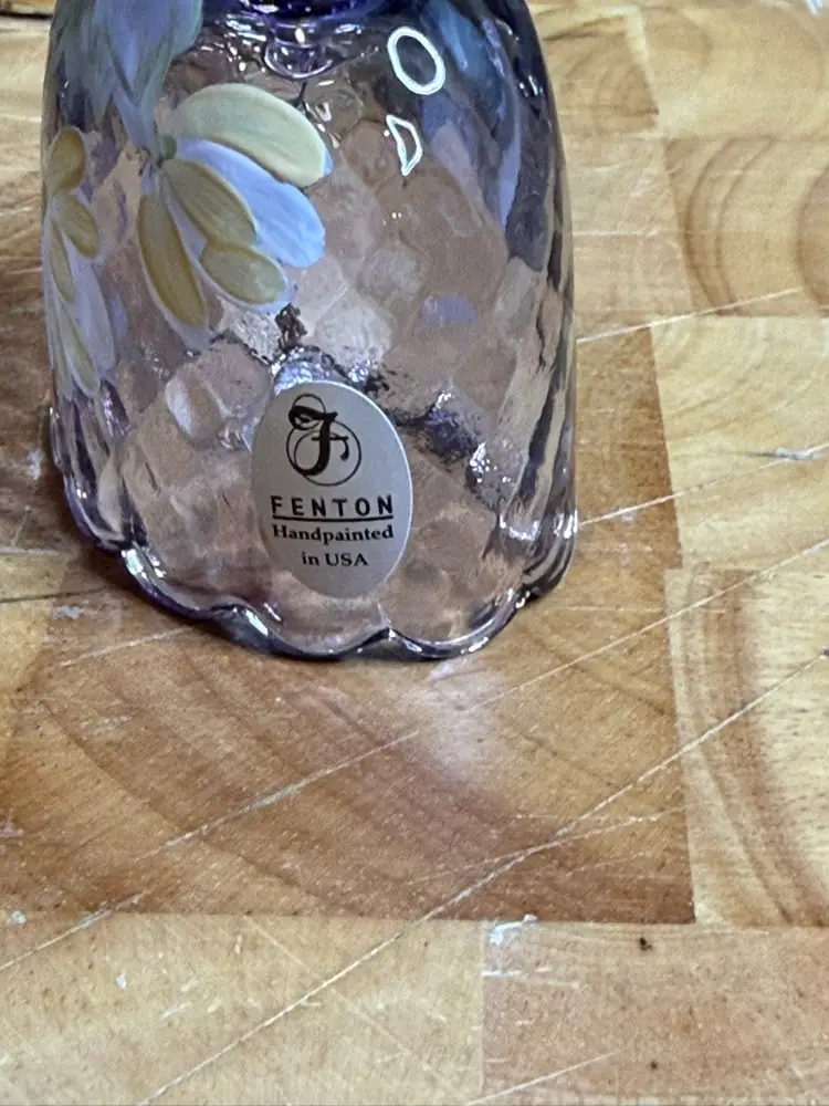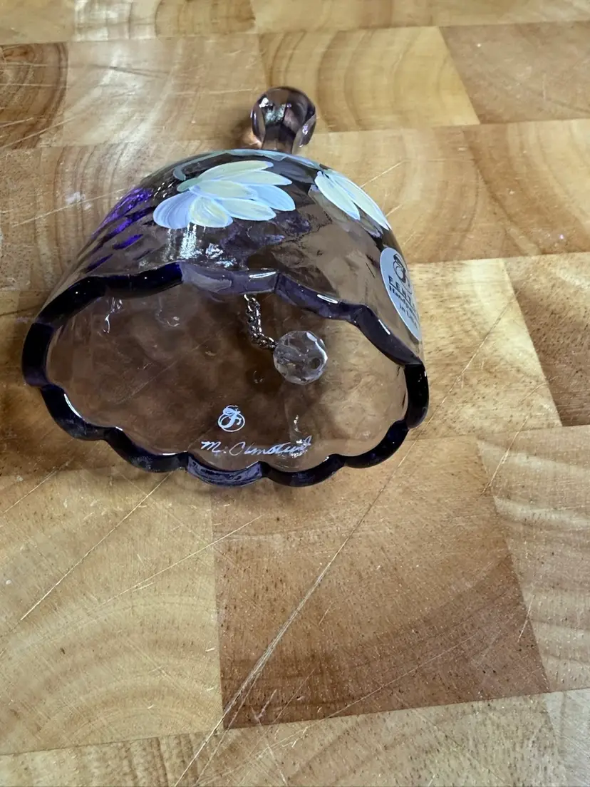 This Fenton handpainted glass bell, signed by the artist M. Olszewski and made in the USA, carries that gentle enchantment. Its amethyst-toned glass, softly scalloped edge, and delicate hand-painted florals wrap the piece in a feeling of calm, like flowers swaying just before nightfall.
