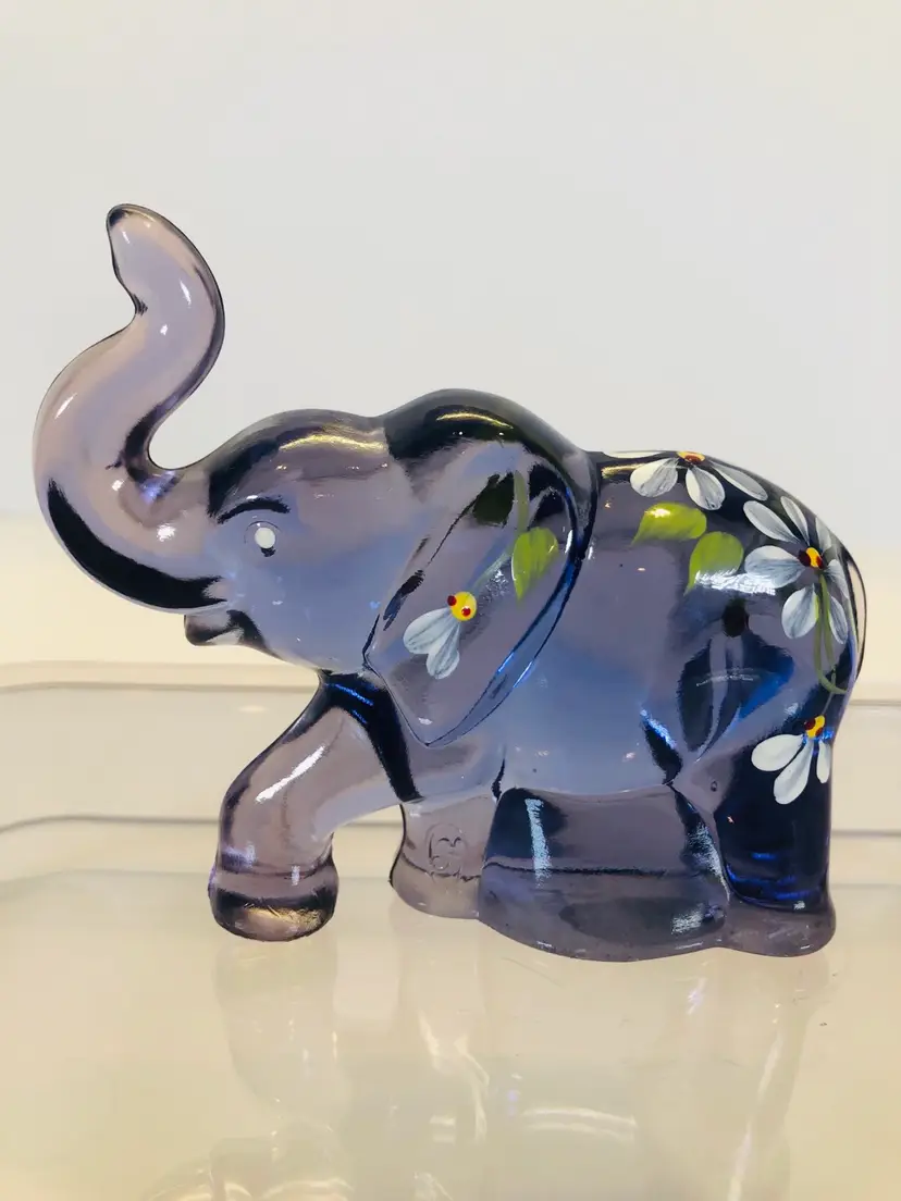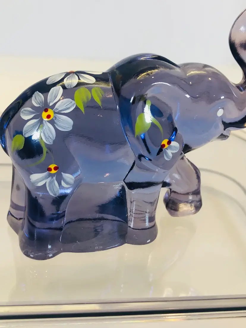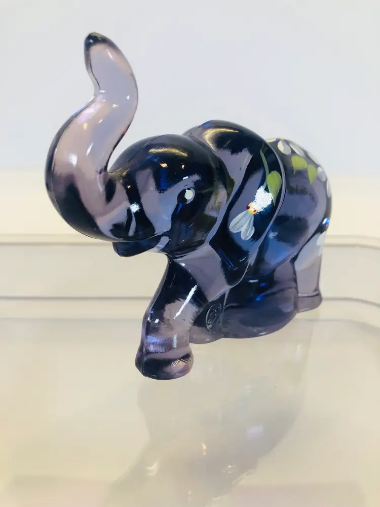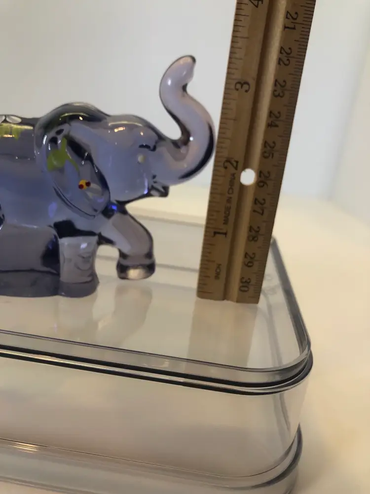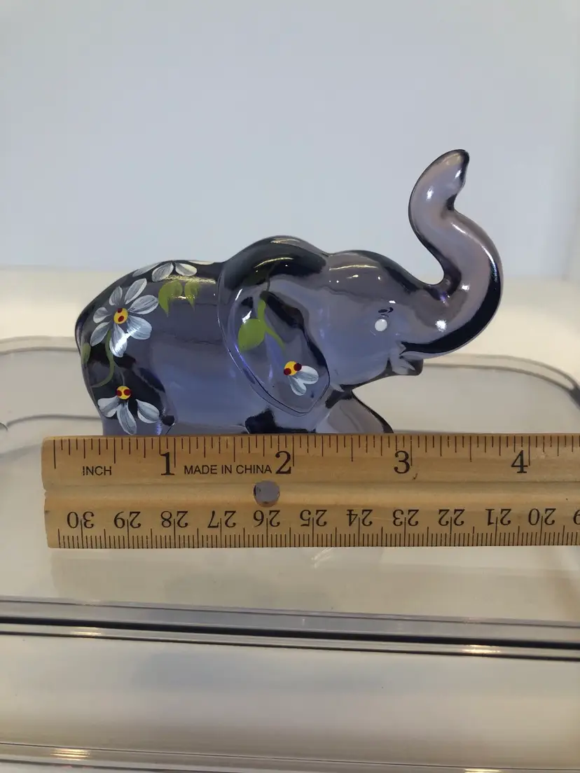 This purple elephant is 3 1/4” tall and 3 3/4” wide. No chips or cracks. It is hand painted and signed by the artist.