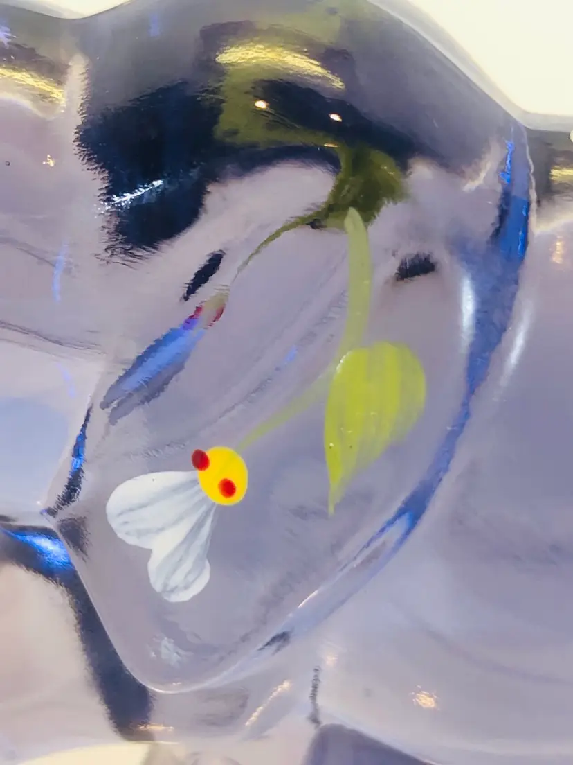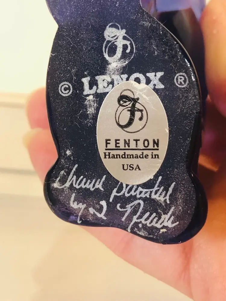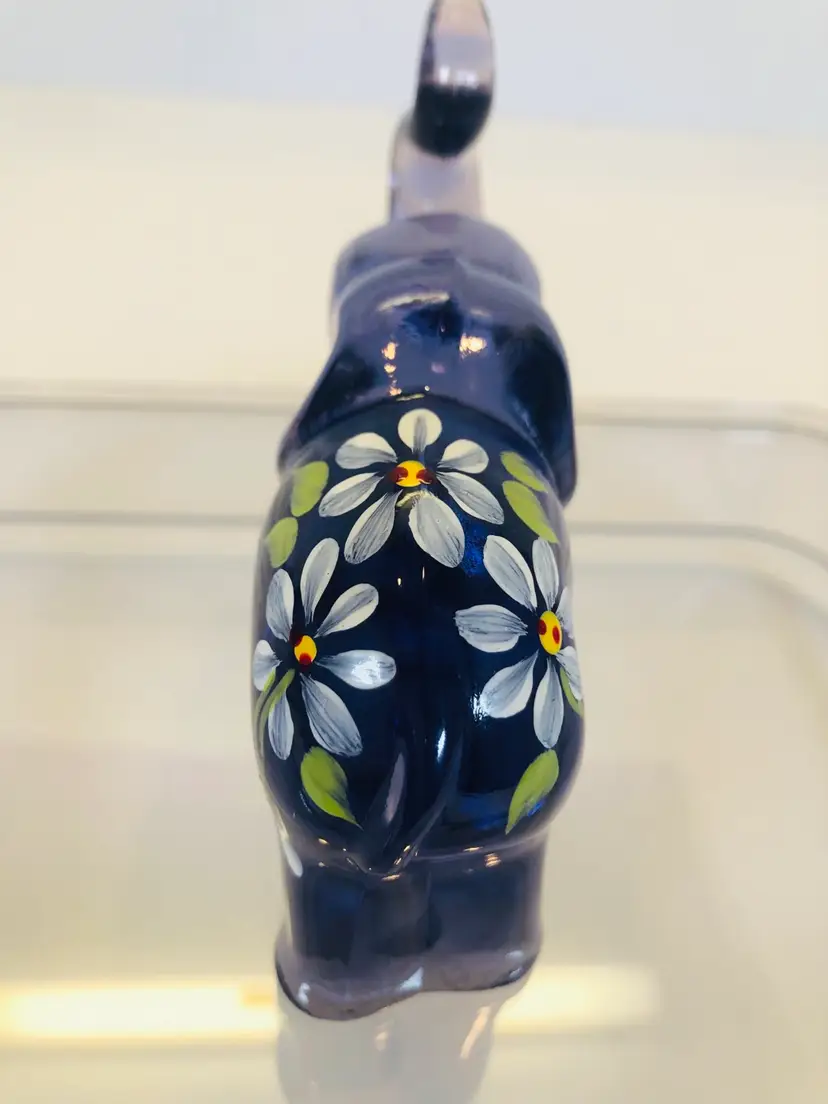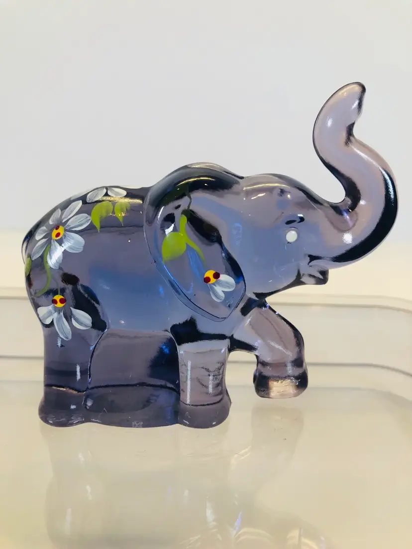 This purple elephant is 3 1/4” tall and 3 3/4” wide. No chips or cracks. It is hand painted and signed by the artist.