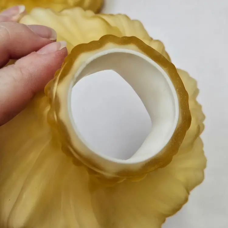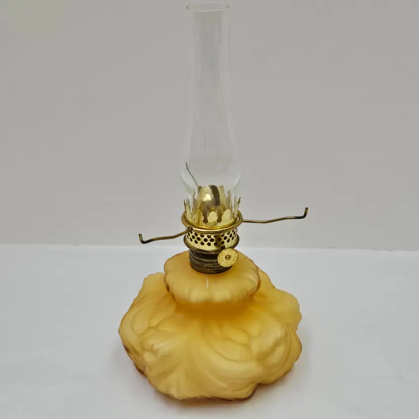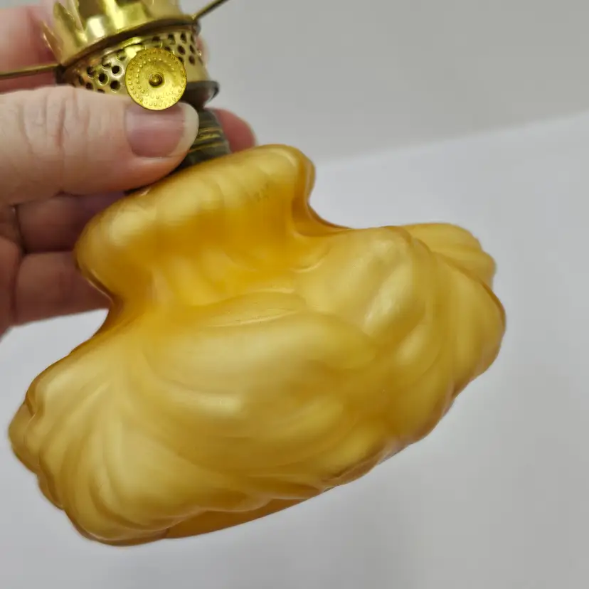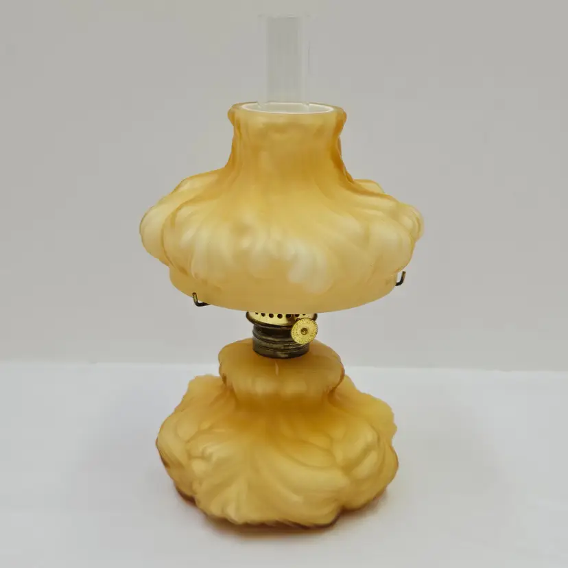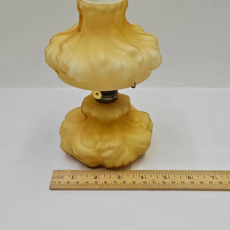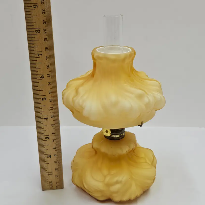 Fenton miniature oil lamp, no chips or cracks, normal roughness around cased edge, some light transfer marks, 7" to top of shade, 8.5" to top of chimney, 5" at widest point.