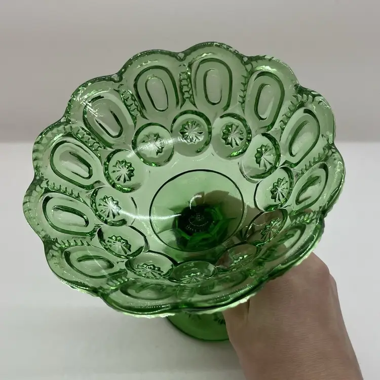 This is an open jelly pedestal compote made by Fenton for LG Wright. Features the moon and star pattern in a green glass. No chips or cracks, measures about 5.5" tall and 5.5" across the top.