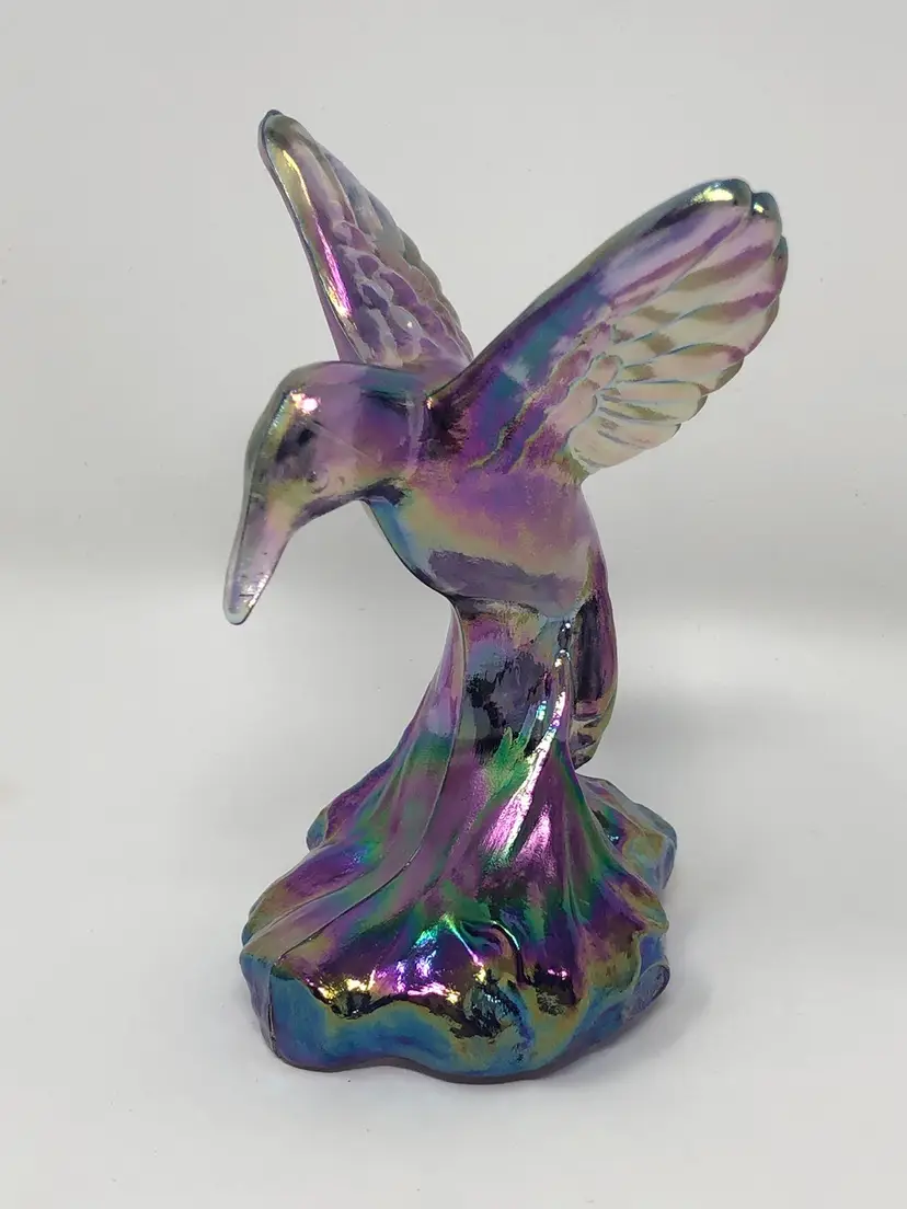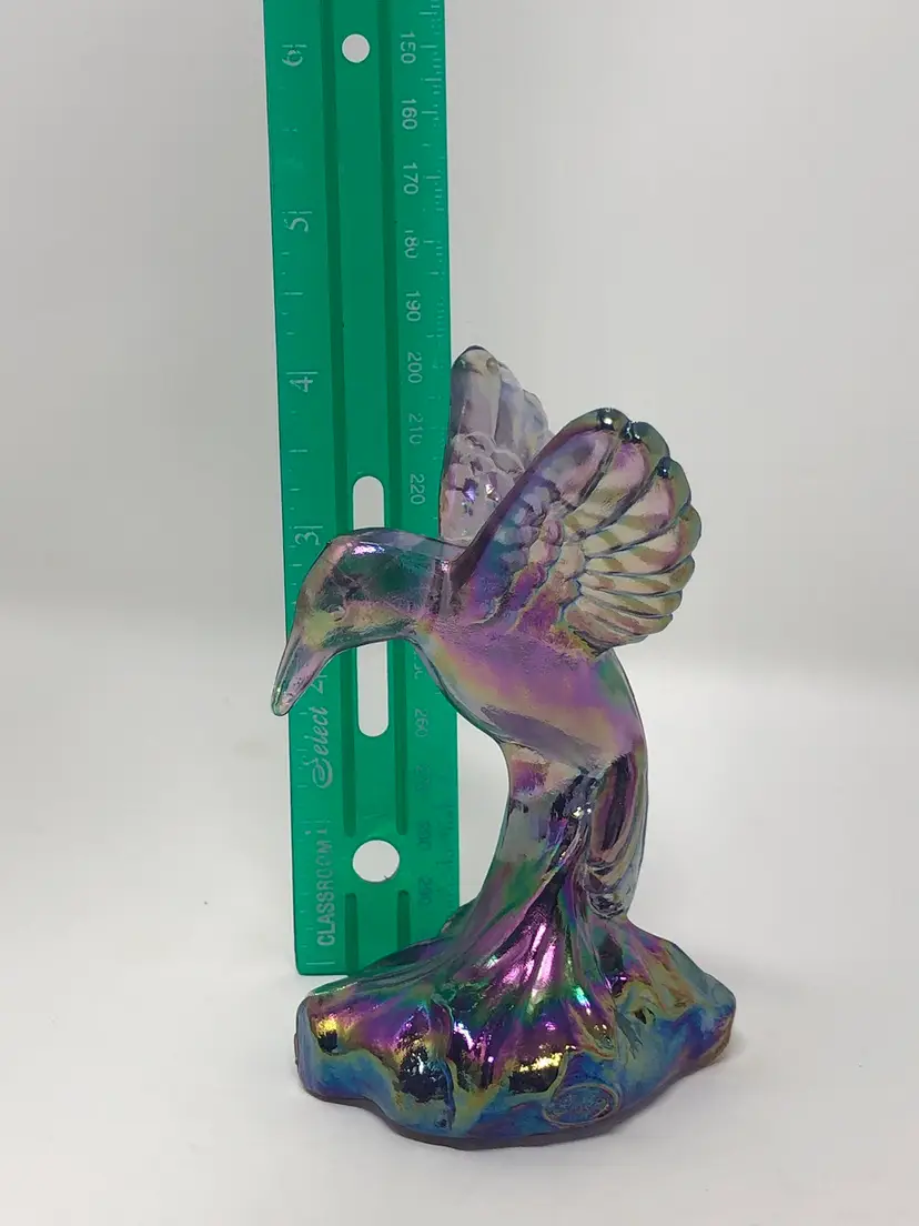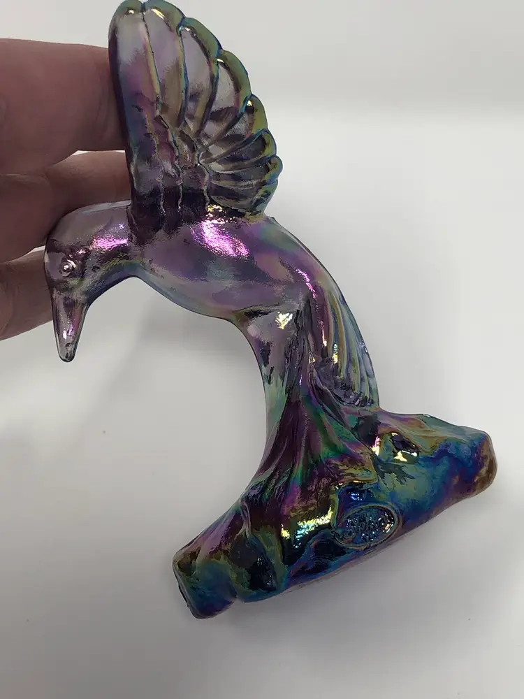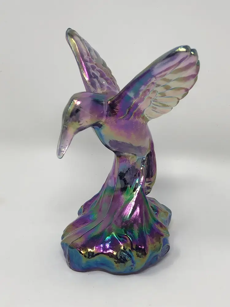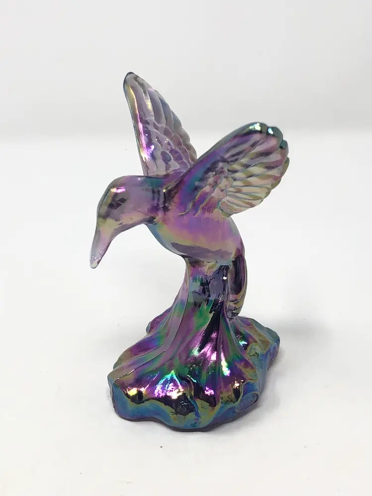 4" hummingbird figurine in a gorgeous iridized purple. No labels or stickers, Fenton oval on the base. Excellent condition