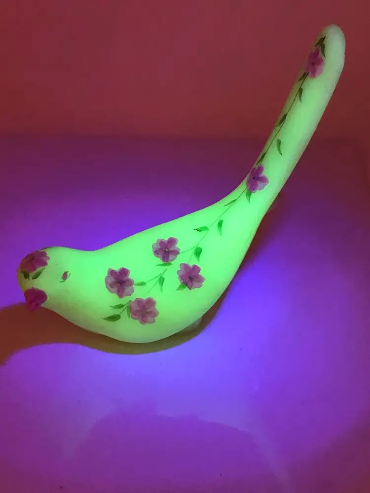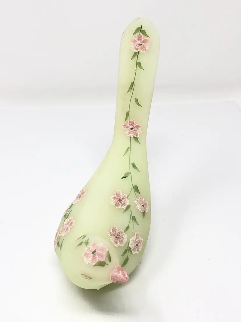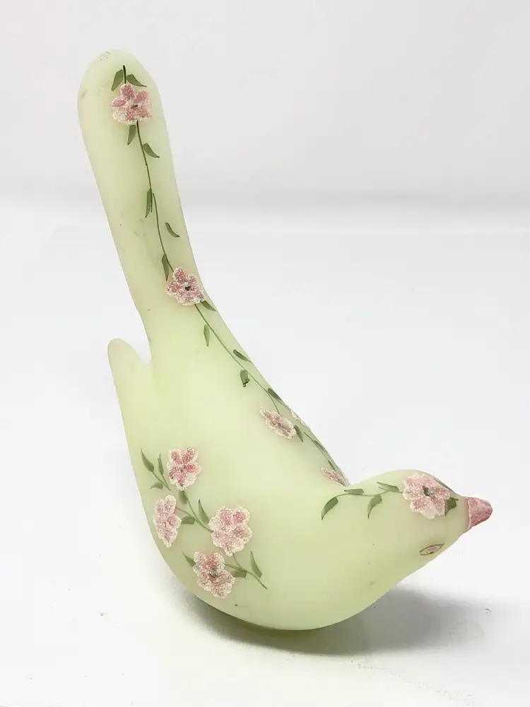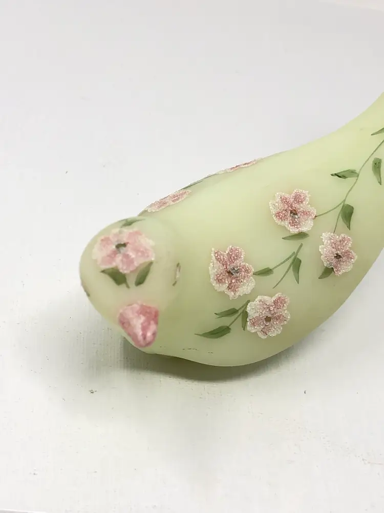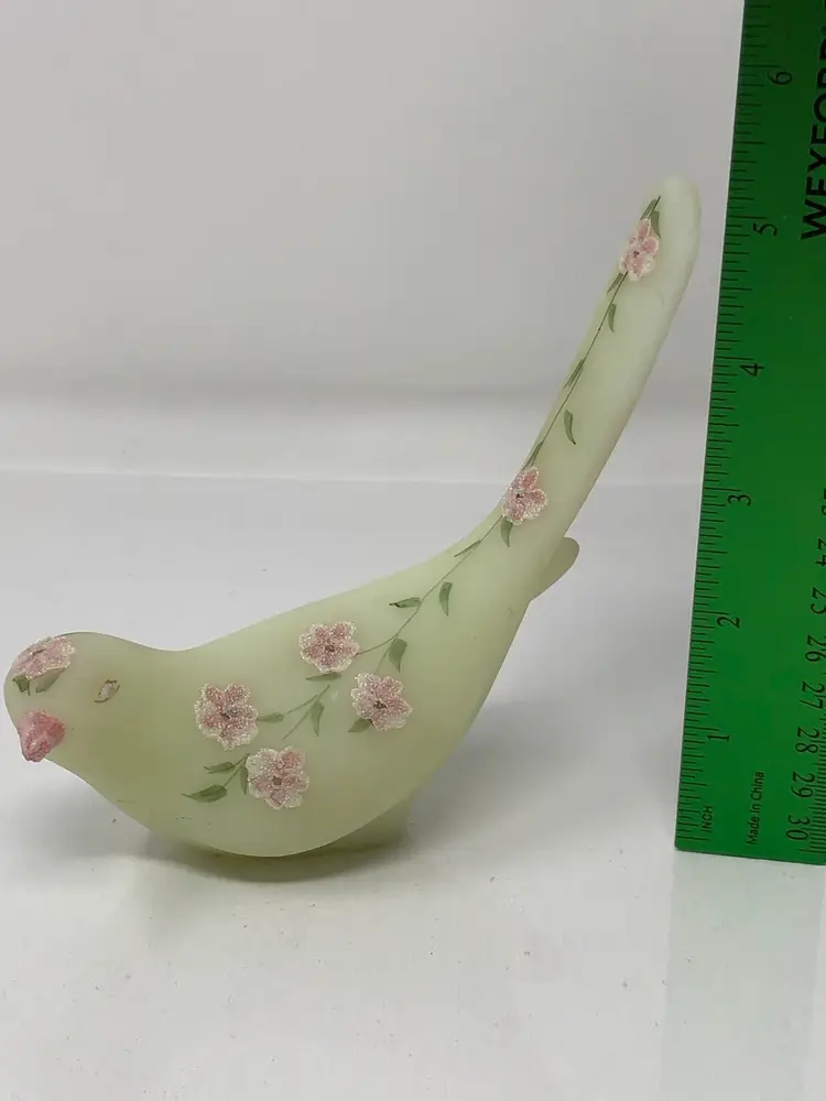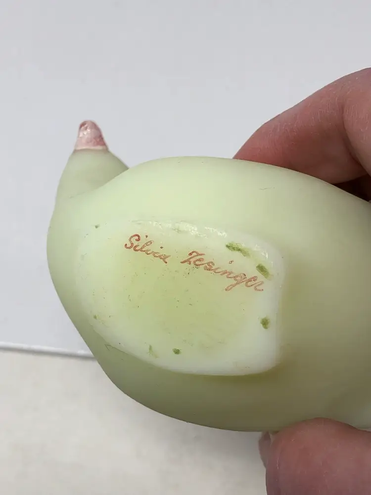 7" glowy glass bird hand painted by Silvia Zesinger. No chips or cracks.