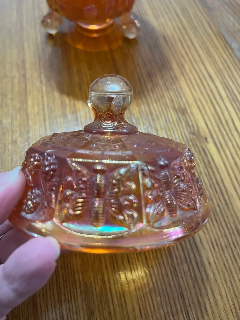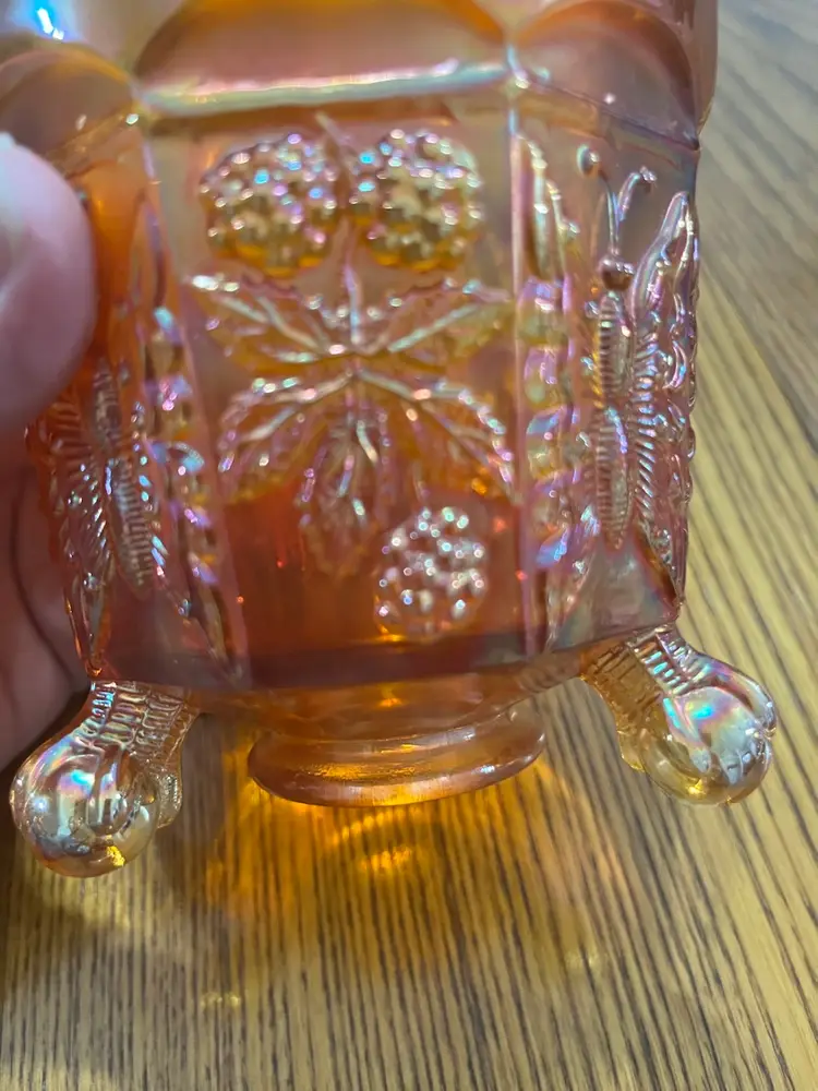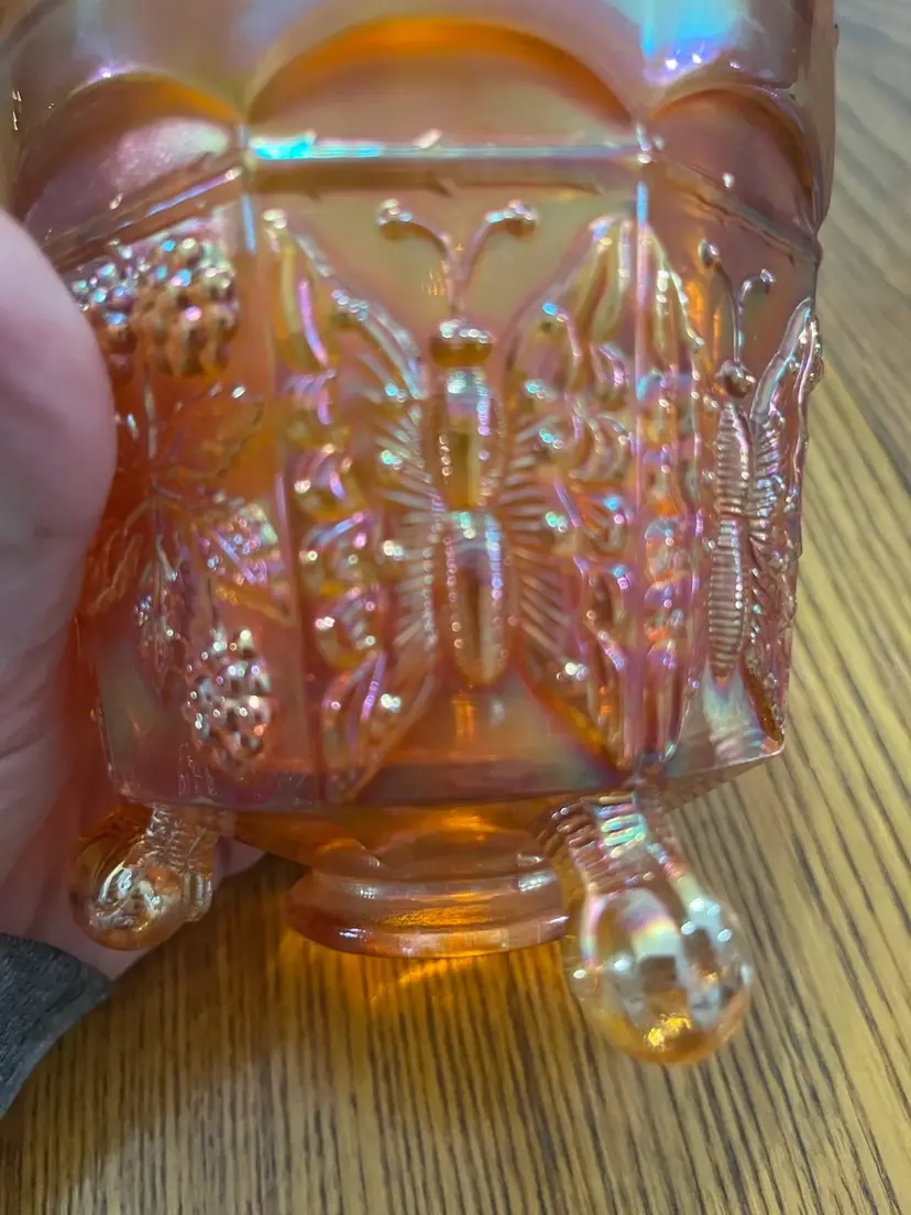 The 'Butterfly and Berry' pattern is a classic example of Fenton's carnival glass output, featuring detailed motifs of butterflies and clusters of berries, often set against a background of leaves. This particular marigold color, with its warm, golden-orange iridescence, is one of the most sought-after hues. Covered sugar bowls like this were common household items, prized for both their utility and their decorative appeal.