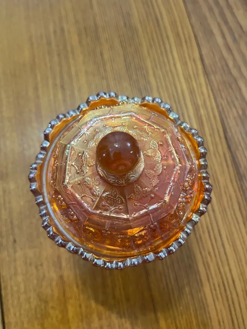 Carnival glass, also known as iridescent glass, was produced from the early 1900s to the 1930s, with Fenton being one of its most prolific and well-known manufacturers. It was made by applying metallic salts to molten glass, which then produced a shimmering, iridescent effect when fired. This technique created vibrant colors and patterns that were highly popular during the era, often used for decorative tableware and gift items.