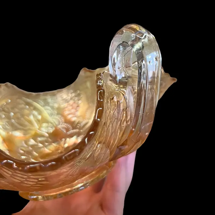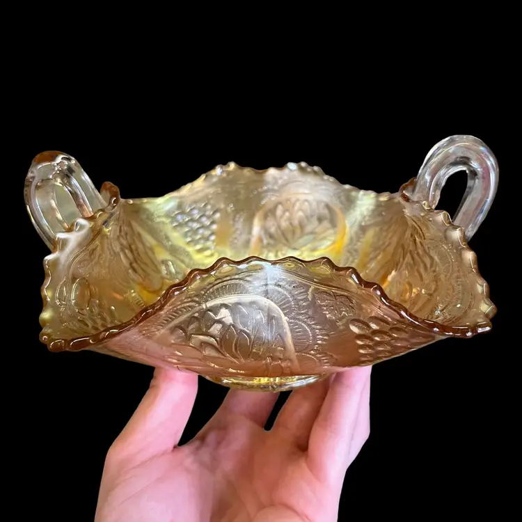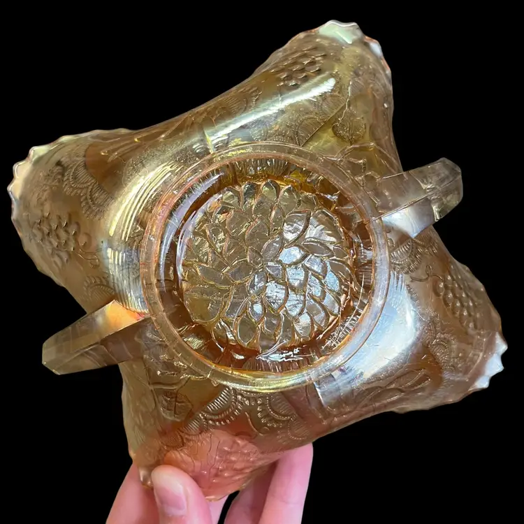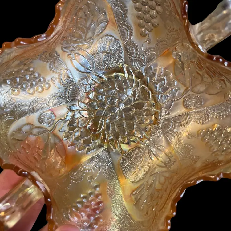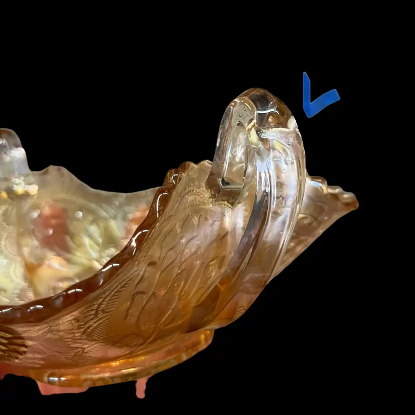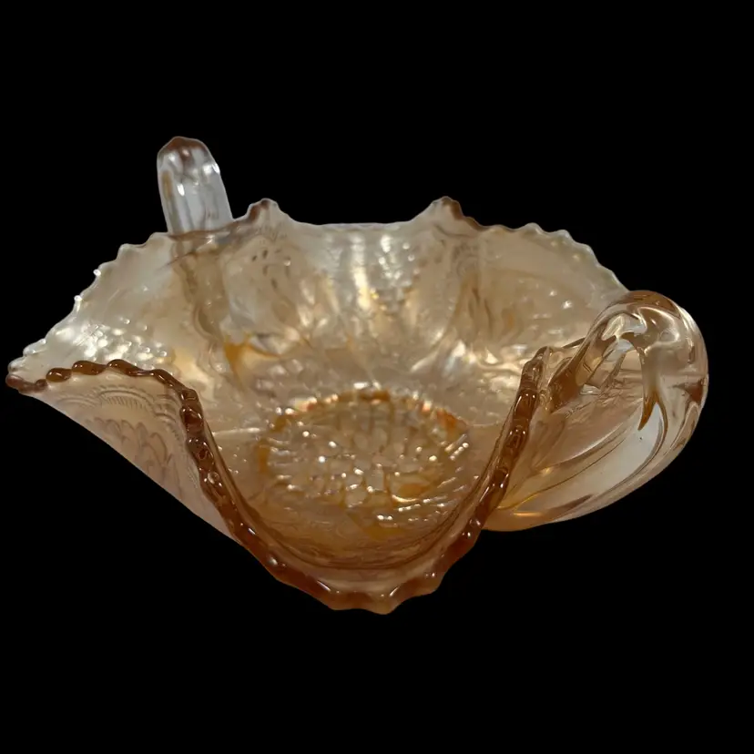 No chips or cracks. One handle looks like it was pinched during manufacturing, while the glass was hot (see 6th photo). Approximately 3.5” x 7” x 5”.