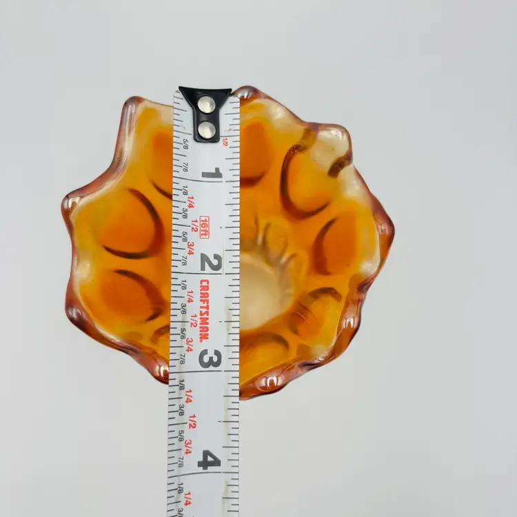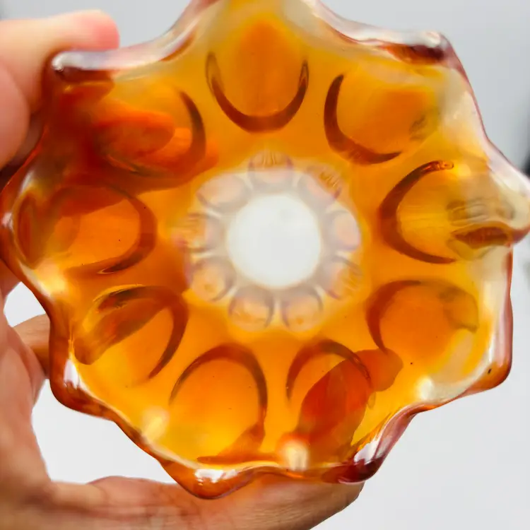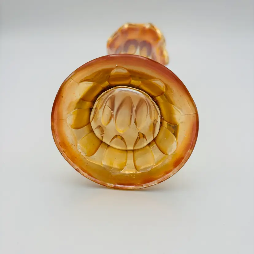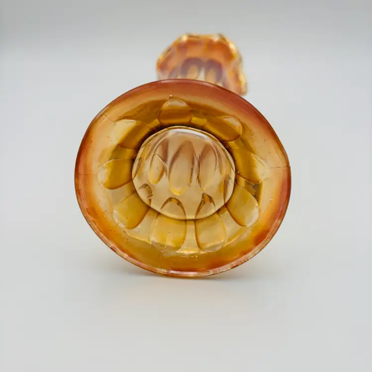 Features: the pattern is long thumbprint and is attributed to Fenton. The color is marigold to an almost clear in the bottom. Som straw marks on the bottom and has a mold line.