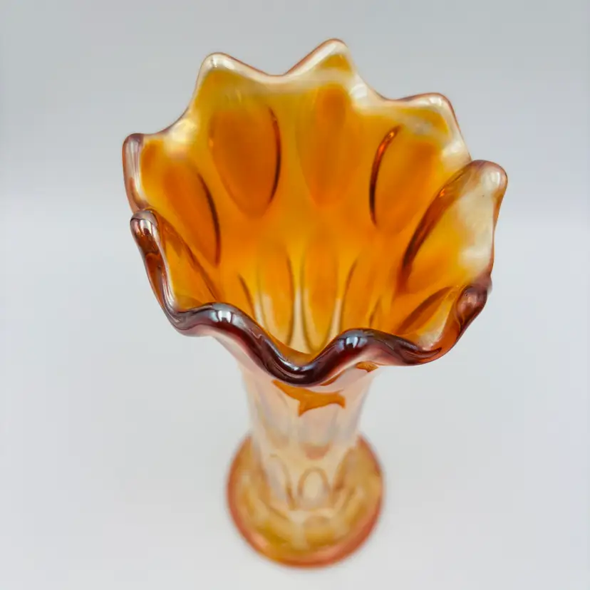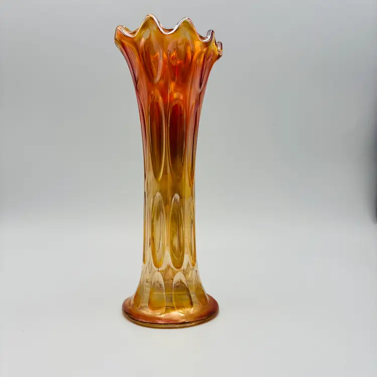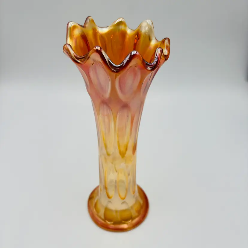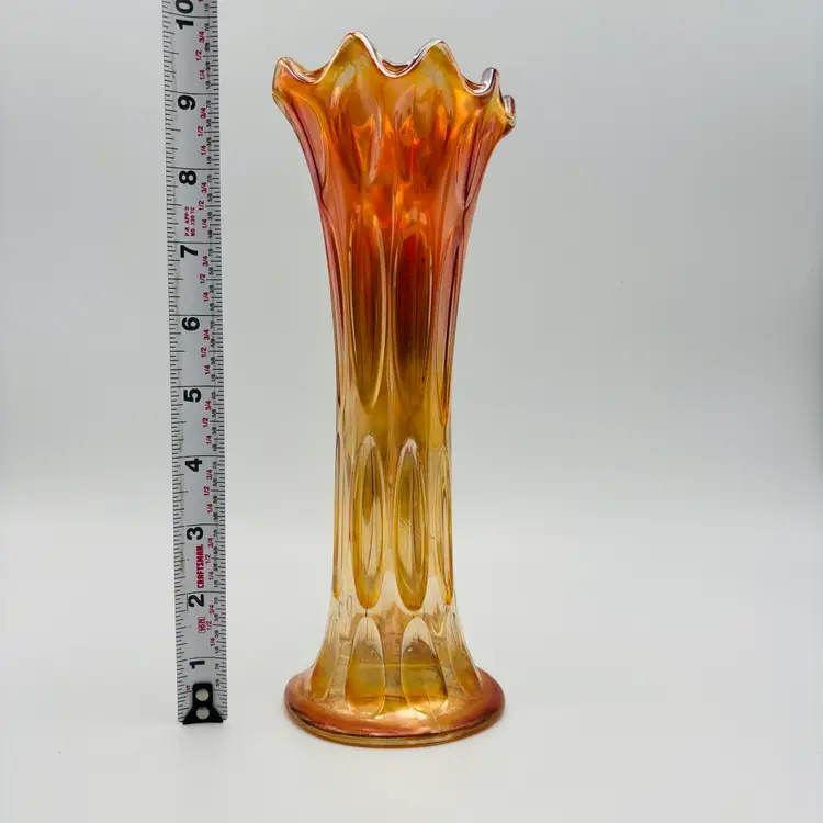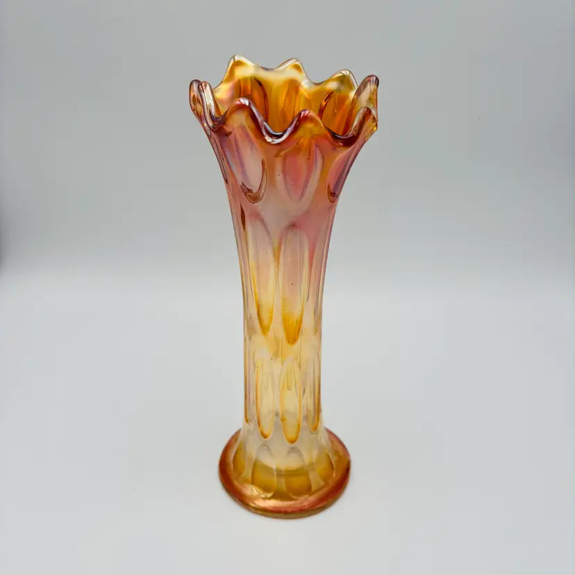 For sale is a Fenton Marigold Iridescent Carnival Glass Swung Vase 9 Point Long Thumbprint