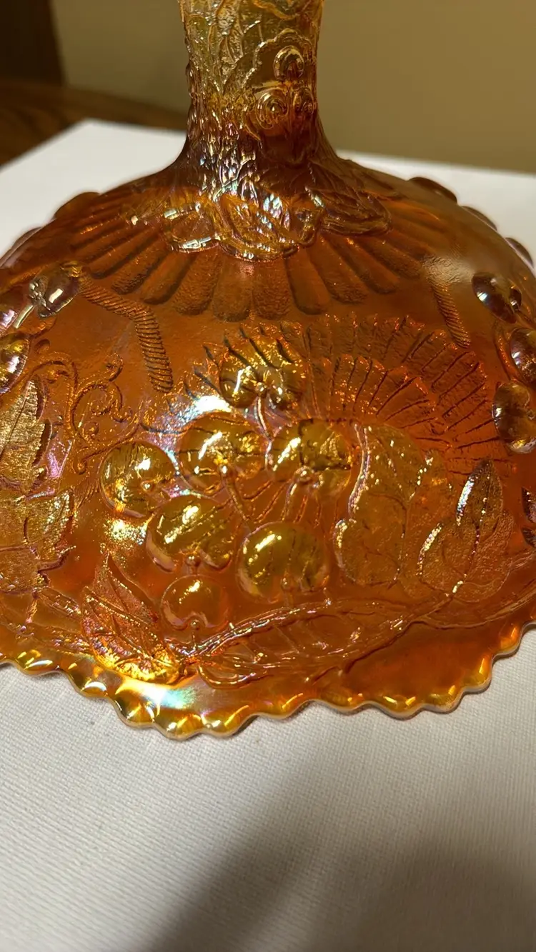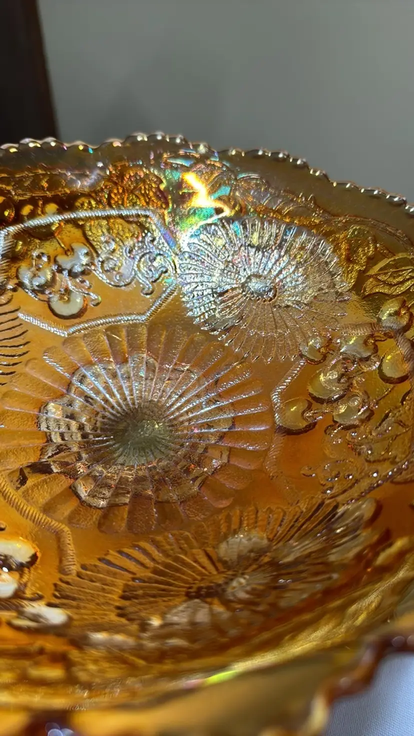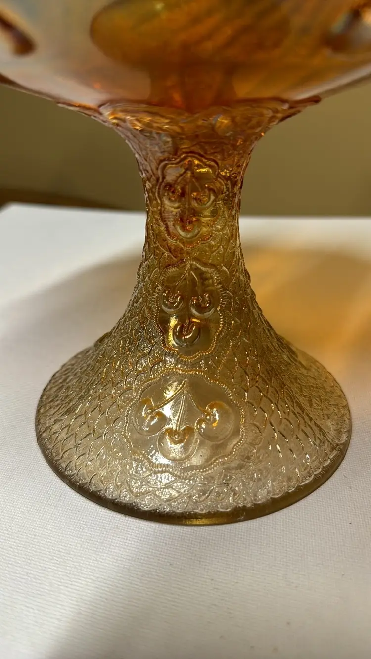 Fenton Marigold Mikado Carnival Glass Round Fruit Compote LARGE, HEAVY FRUIT BOWL This is a real nice Fenton MIKADO Round Fruit Compote. This pattern has the Fenton CHERRIES pattern on the exterior of the Compote. This is a large and heavy piece of glass. The iridescence is very nice and even all over. Circa 1920-21. ~NO CHIPS OR CRACKS~ Approximate dimensions: 7 1/4 inches high. 9 3/4 inches top. 5 inch base. (278222410)