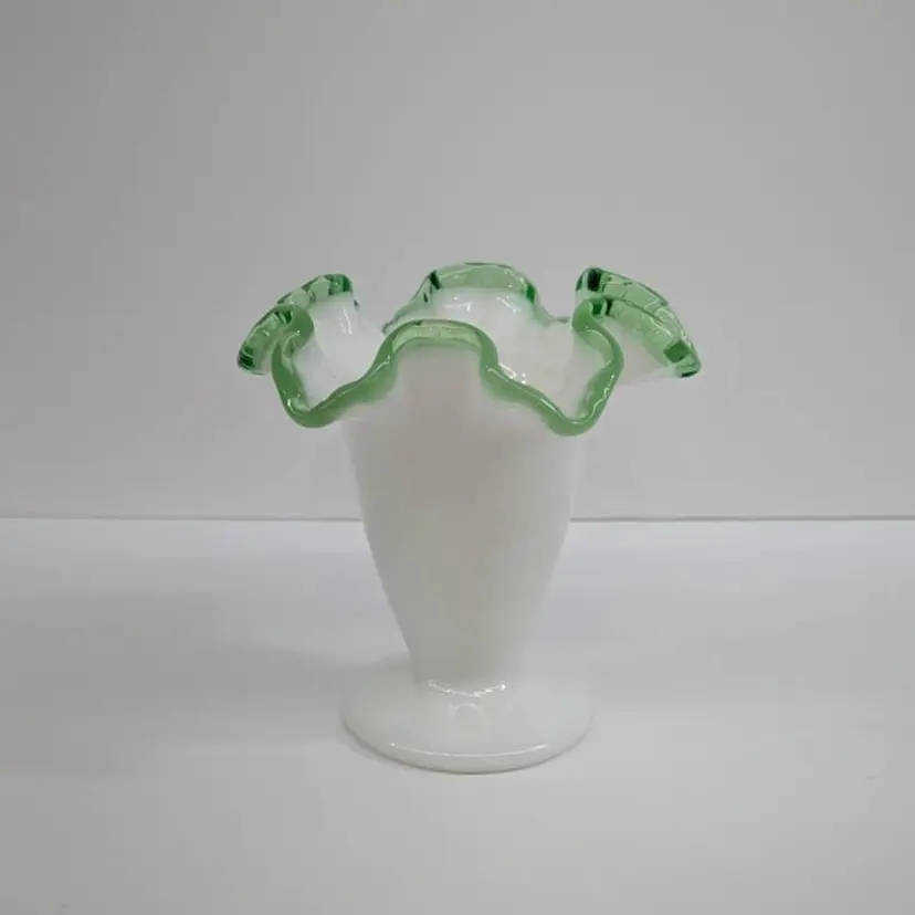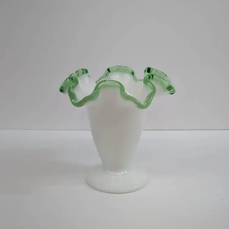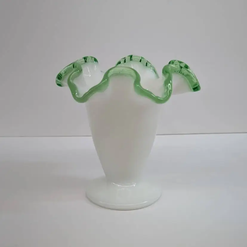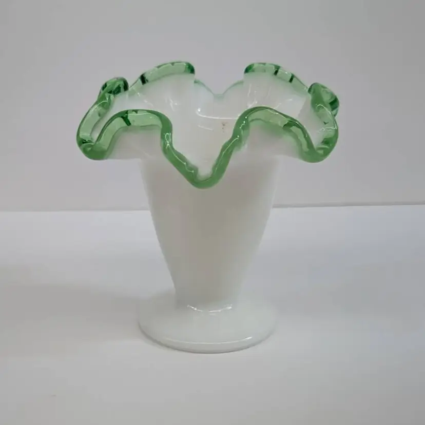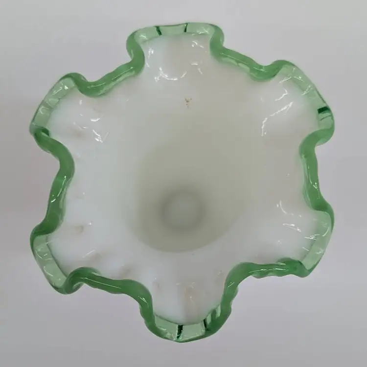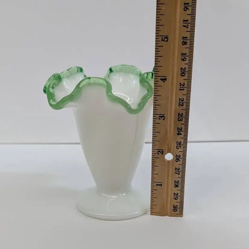 Adorable, trumpet vase with a ruffled rim and emerald green crest. In nice, used condition with one spot of discoloration on the inside (see picture). Measurements ~ 2.5 x 4 x 4"