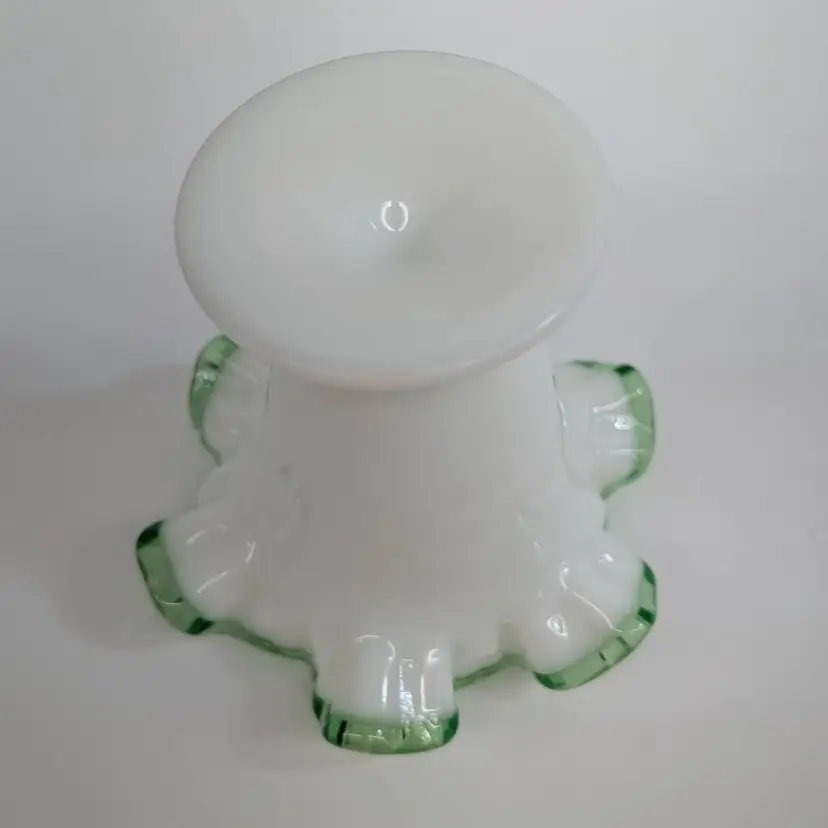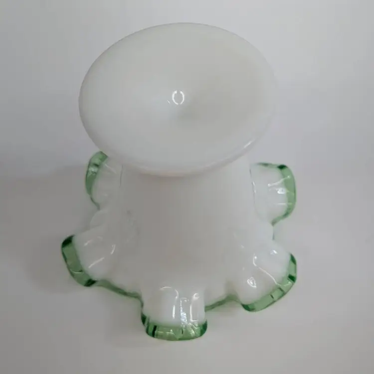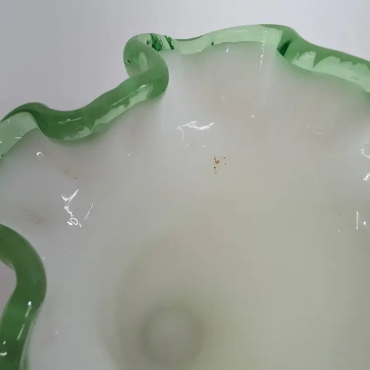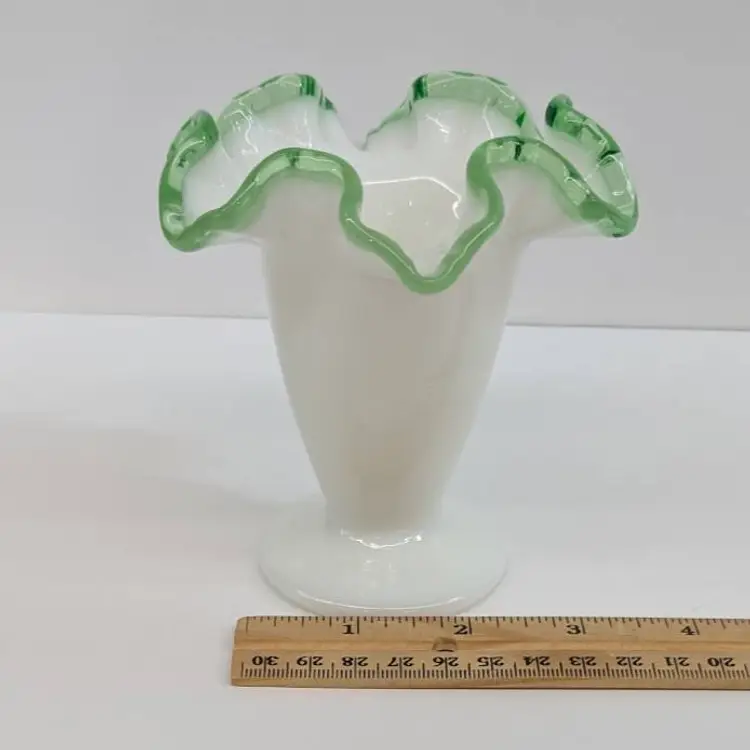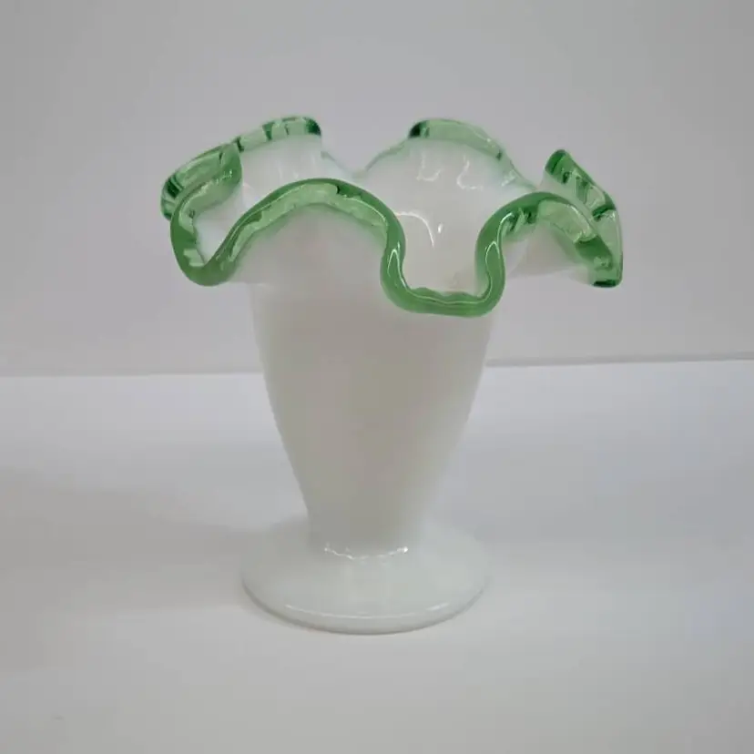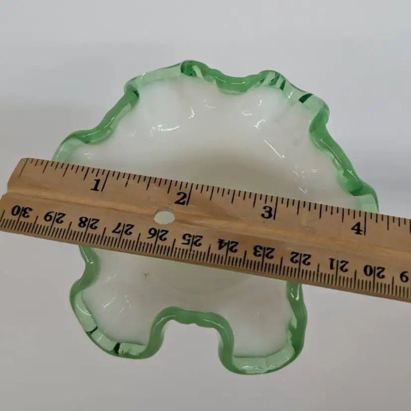 Adorable, trumpet vase with a ruffled rim and emerald green crest. In nice, used condition with one spot of discoloration on the inside (see picture). Measurements ~ 2.5 x 4 x 4"