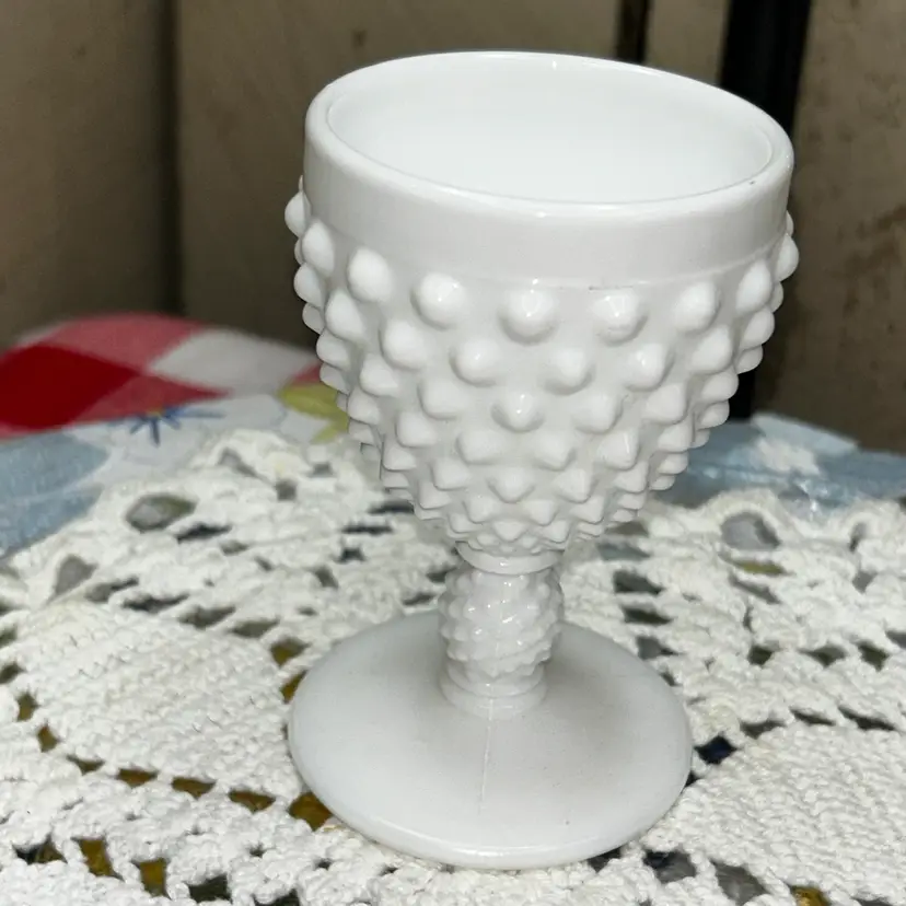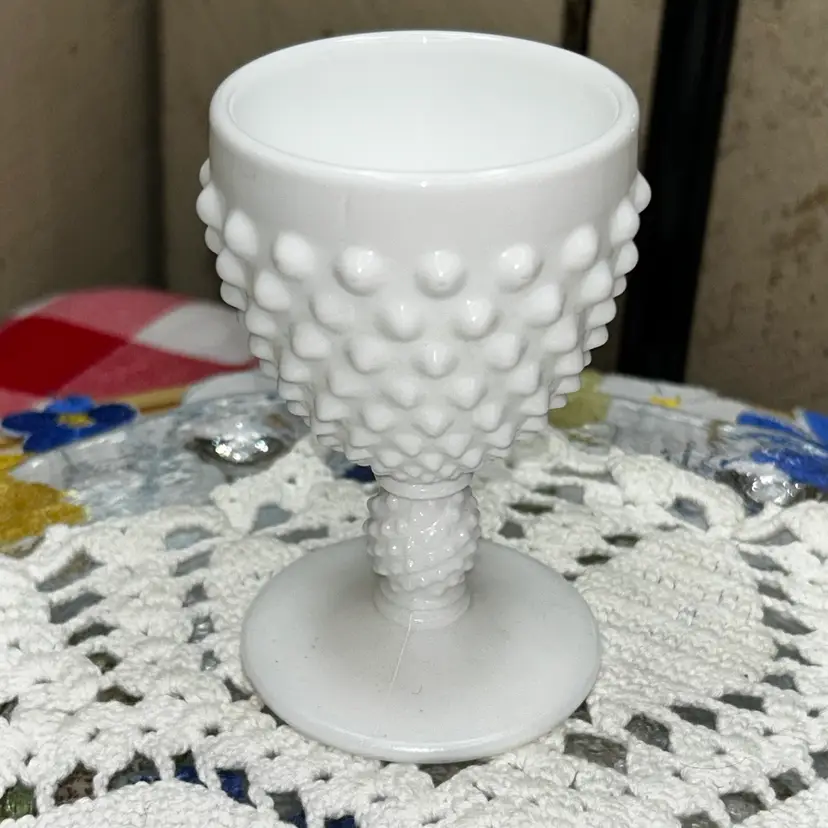 3.75” tall, 2.25” diameter opening, 2 3/8” diameter base. Cordial or small wine glass single. Excellent shape. Pre 1971.