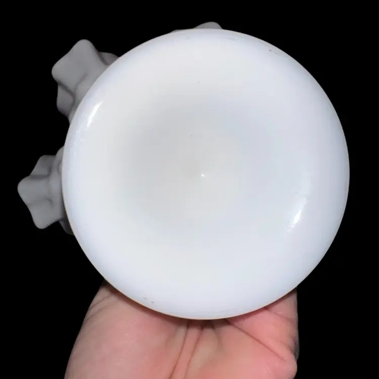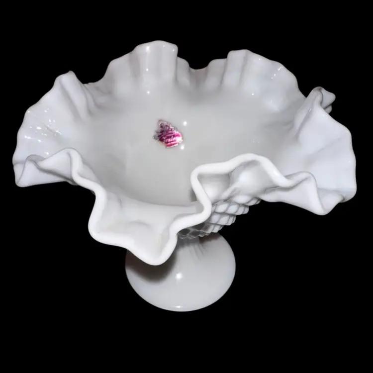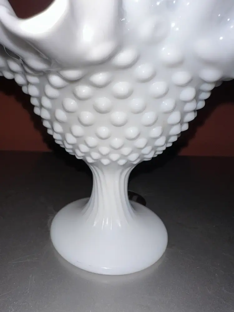 Fenton Milk Glass Hobnail Footed Compote / Candy Dish - Ruffled Top, Ribbed Foot Partial sticker still attached 5 1/2 inches tall by 7” diameter No issues