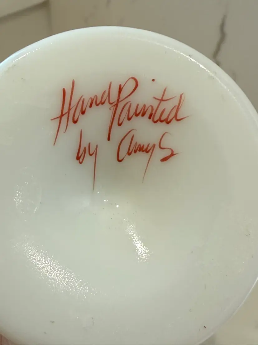 It's a white milk glass bud vase with a scalloped rim and a hand-painted rose design. Signed by the artist, Amy S.