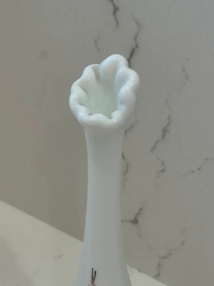 Fenton Milk Glass Swung Bud Vase, hand-painted with roses.