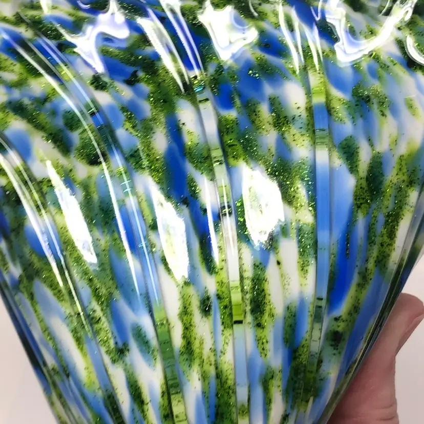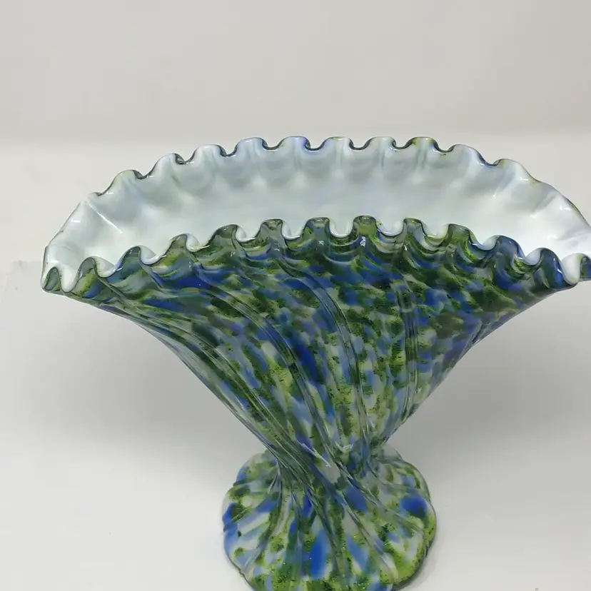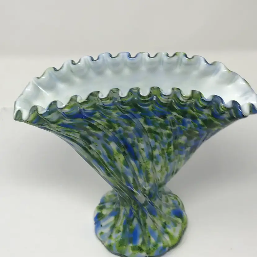 7" flat profile fan vase from Fenton. White inside with blue and green glittery glass outside. No markings or labels, no chips or cracks