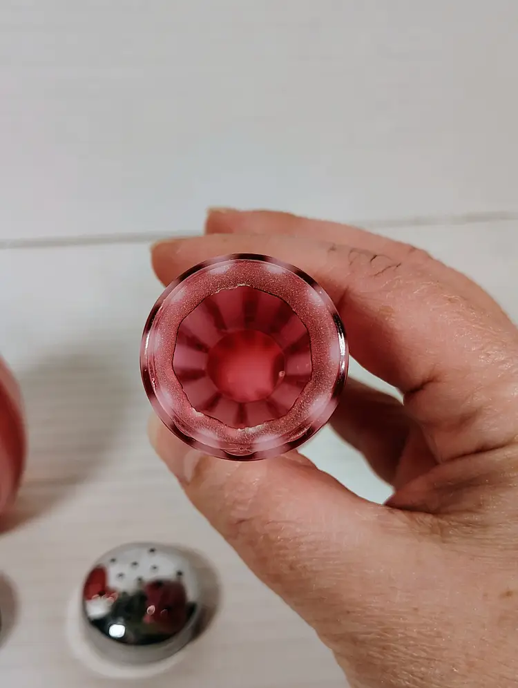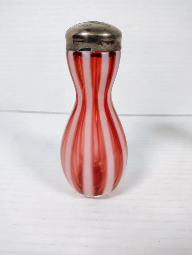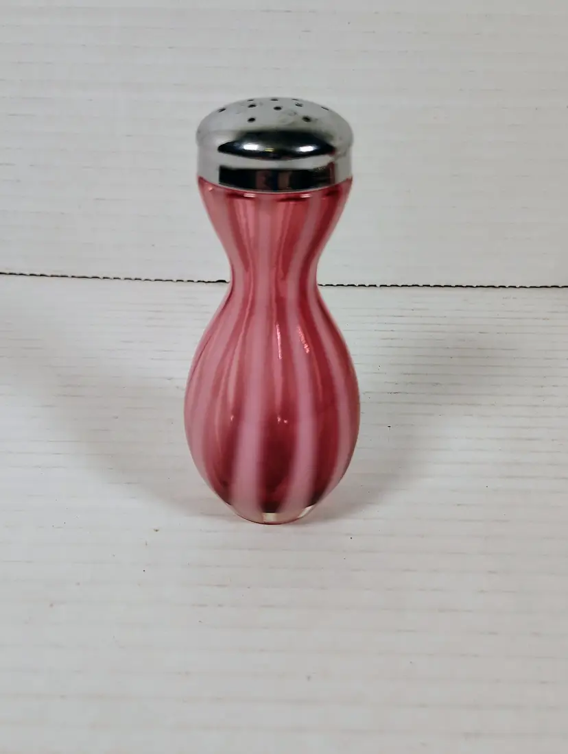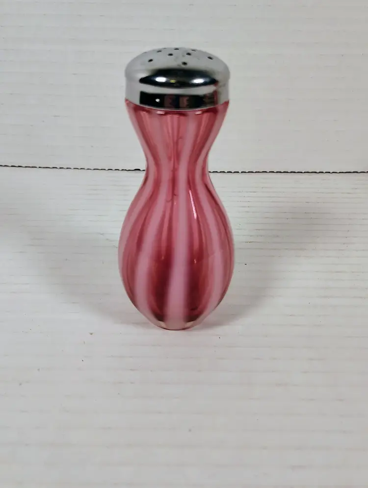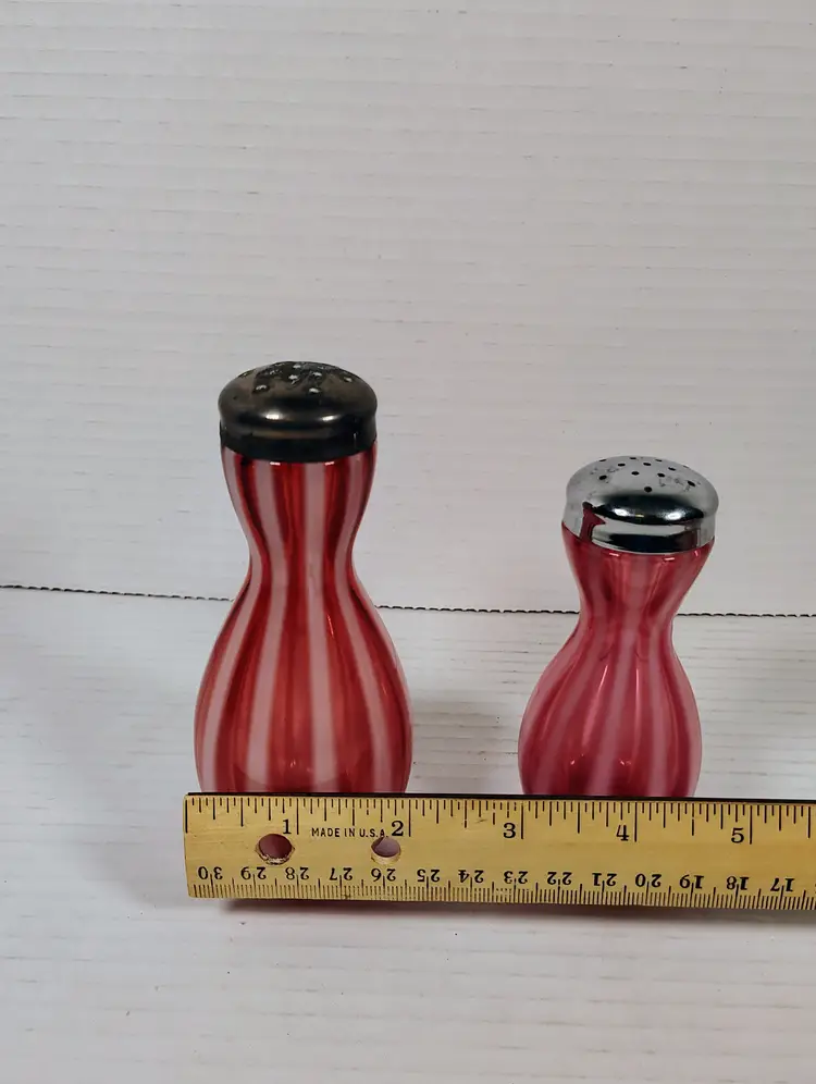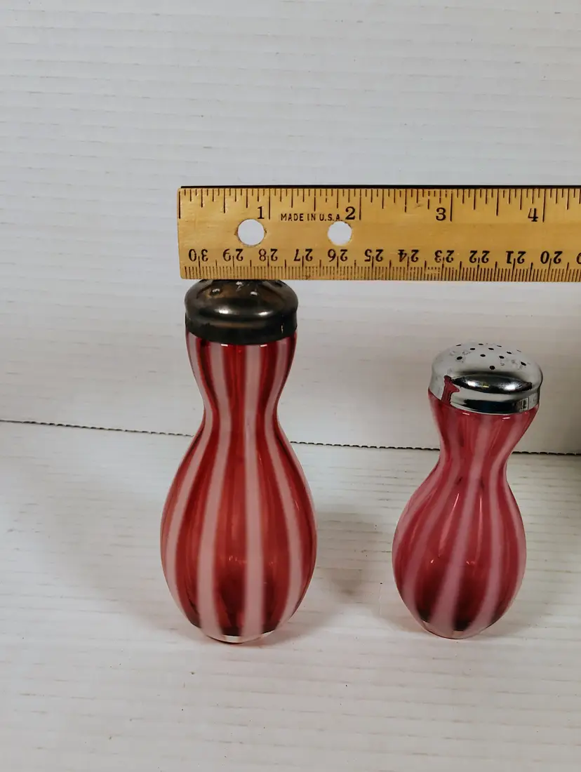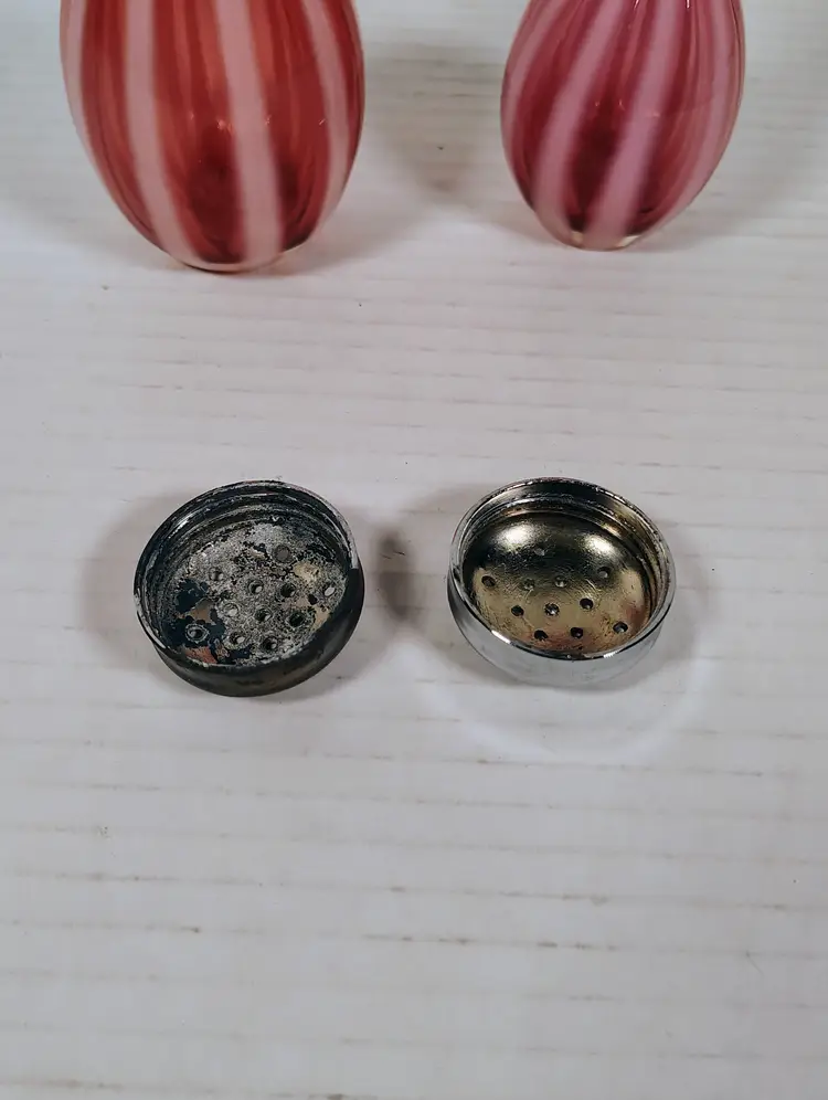 The shakers are in good used condition. The salt top has more wear and oxidation as would be expected with salt. There are no chips or cracks. The pepper has a couple of small manufacturers marks on the inside edges. It looks like extra glass at the top of 2 white stripes. The salt is a bit over 5" tall, the pepper is a little over 4" tall. Please see pictures for details.
