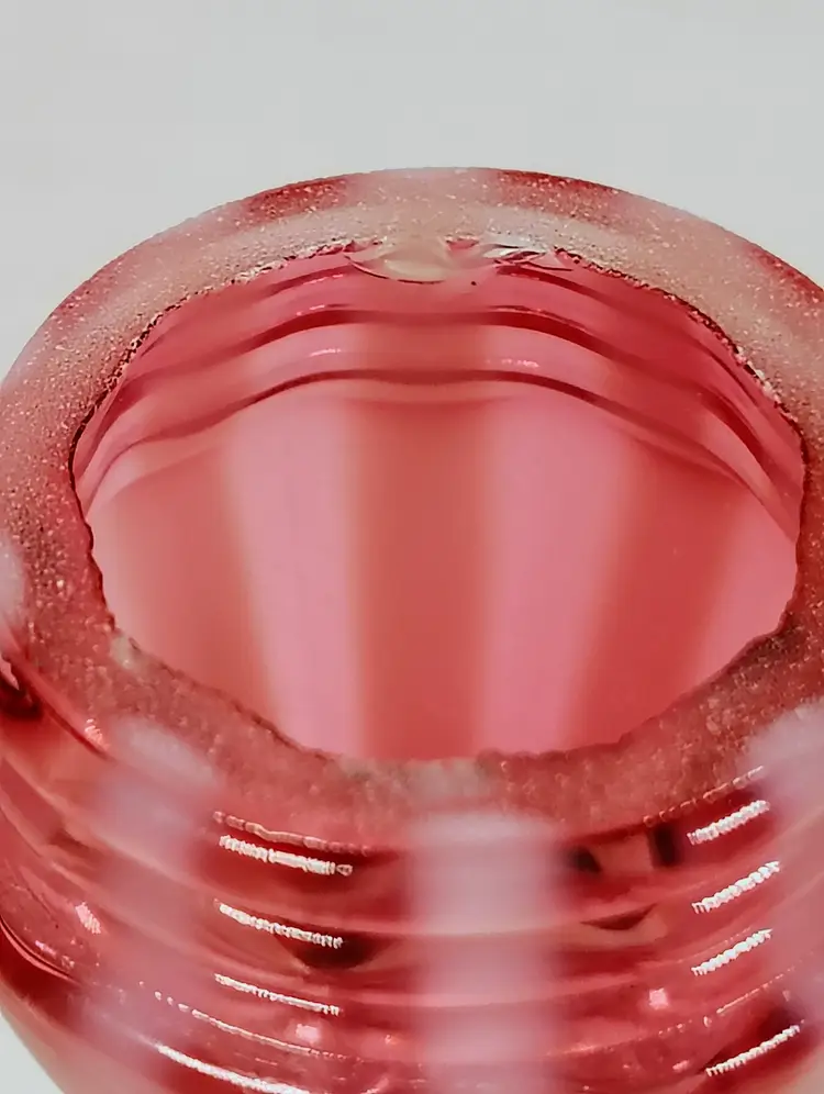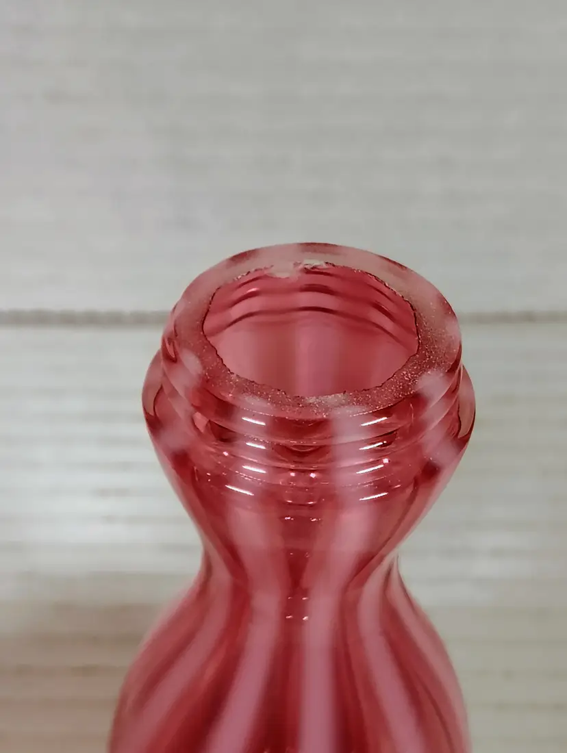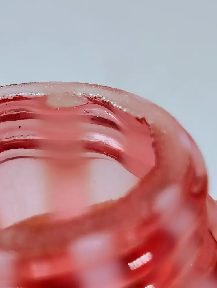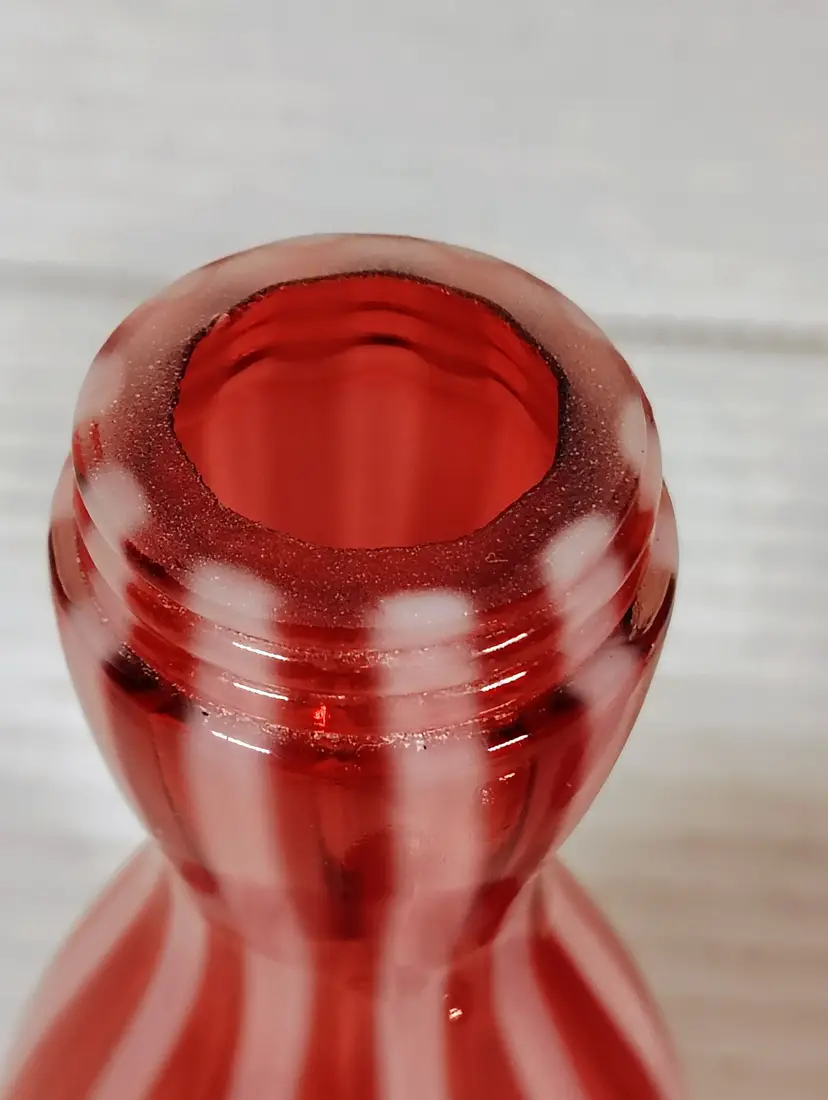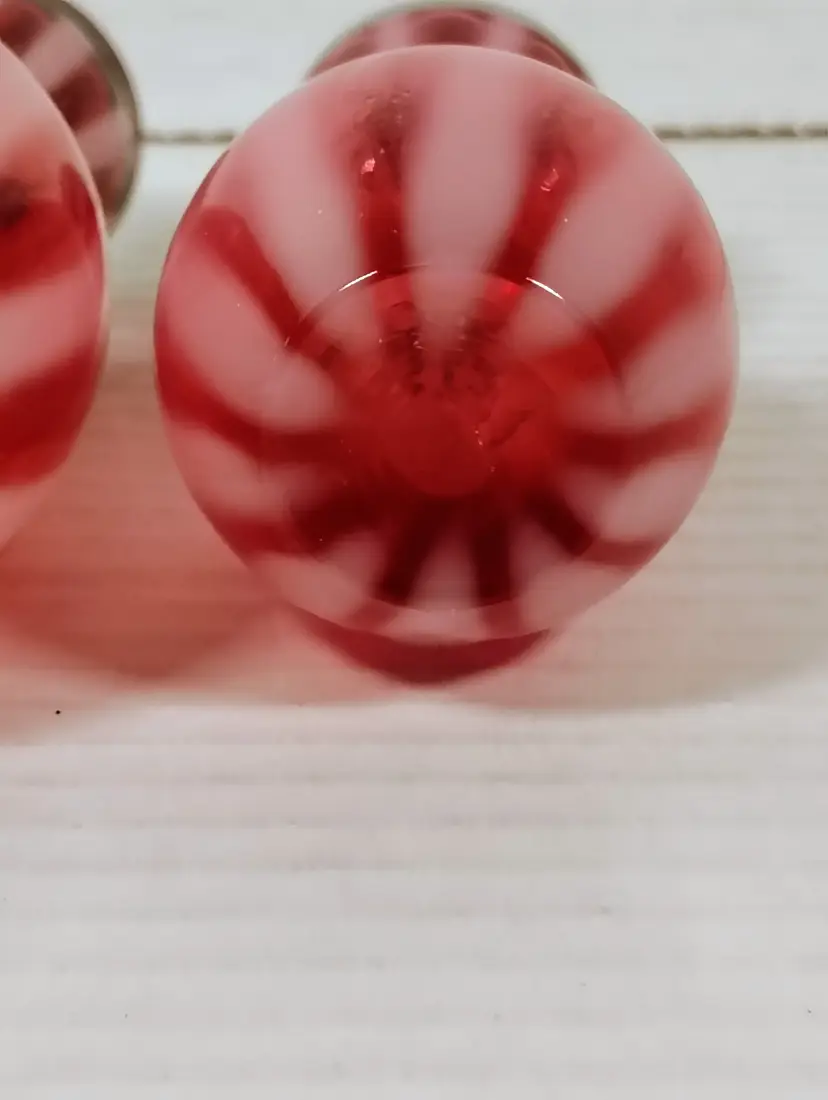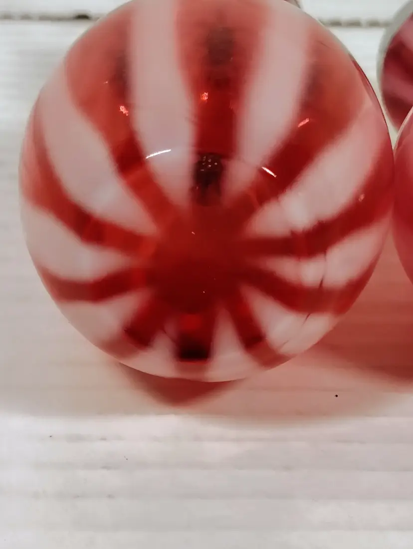The shakers are in good used condition. The salt top has more wear and oxidation as would be expected with salt. There are no chips or cracks. The pepper has a couple of small manufacturers marks on the inside edges. It looks like extra glass at the top of 2 white stripes. The salt is a bit over 5" tall, the pepper is a little over 4" tall. Please see pictures for details.