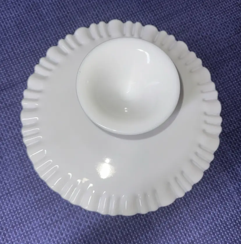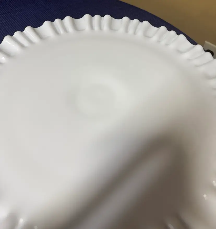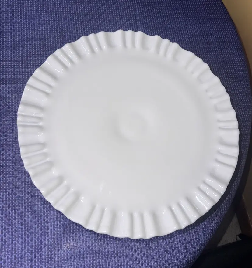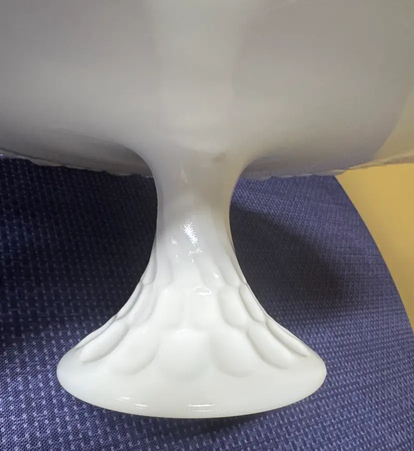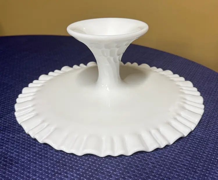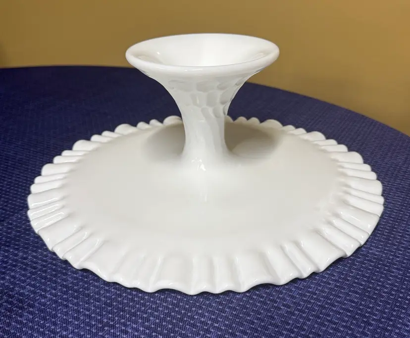 Showcase your desserts with this elegant white cake stand. Perfect for any occasion, its classic design adds a touch of sophistication to your table setting. Fenton Art Glass Olde Old Virginia Thumbprint Milk Glass Wedding Cake Stand Plate Pre 1940 12.5” diameter 5” tall Excellent condition with no breaks or chips (126511112515)