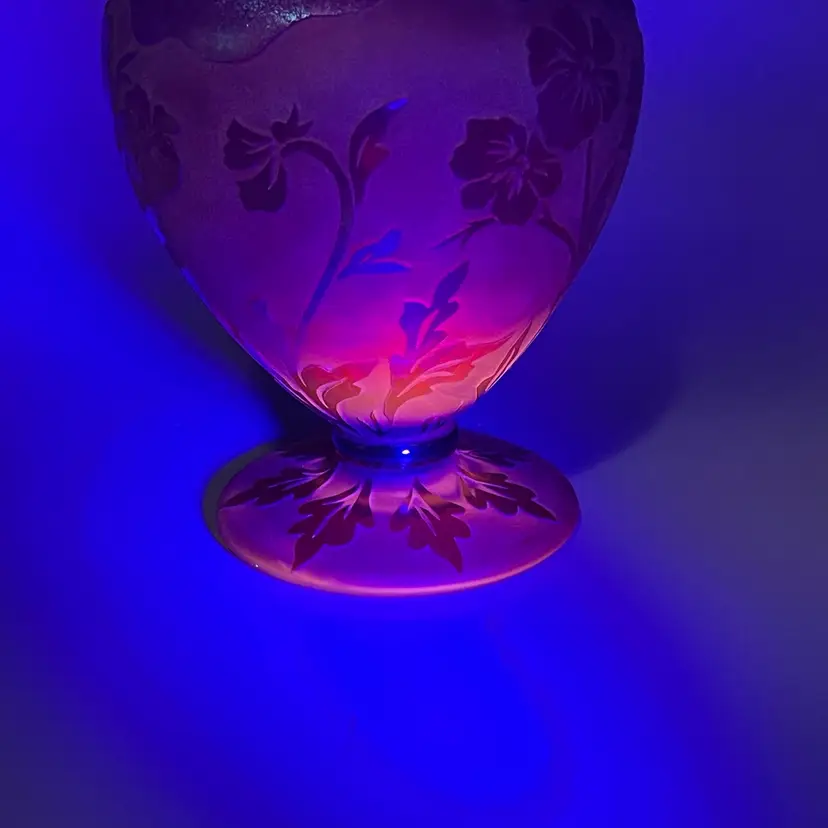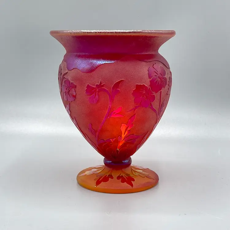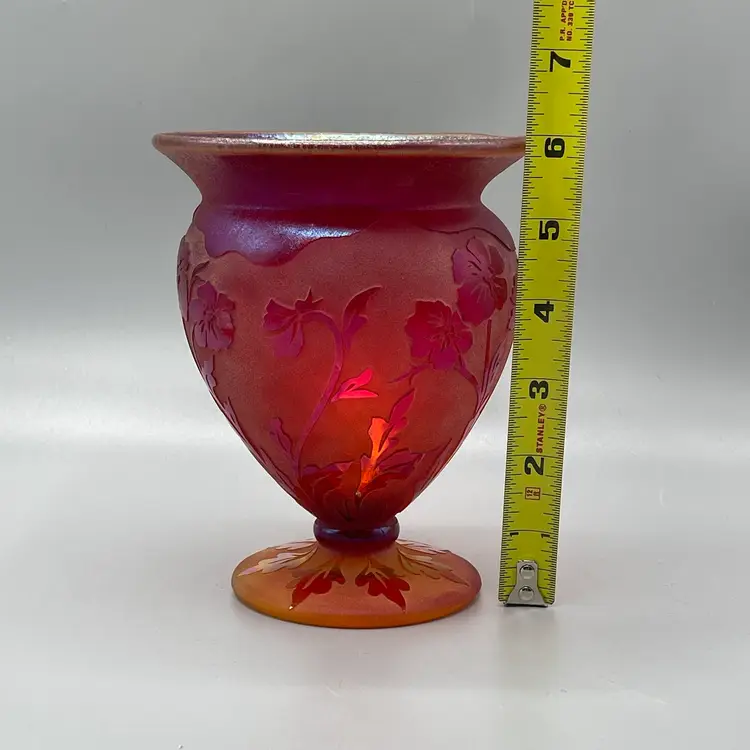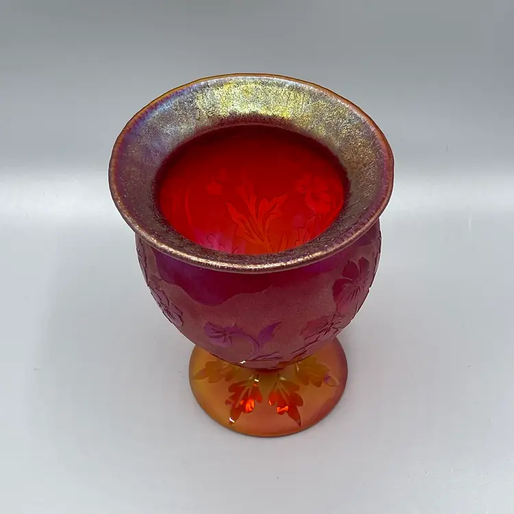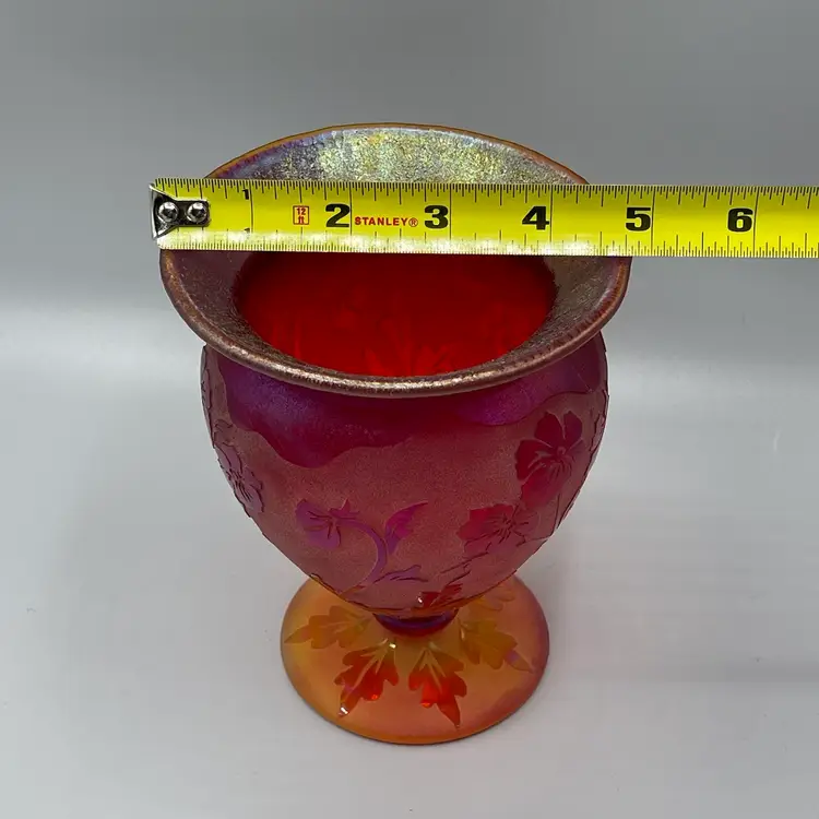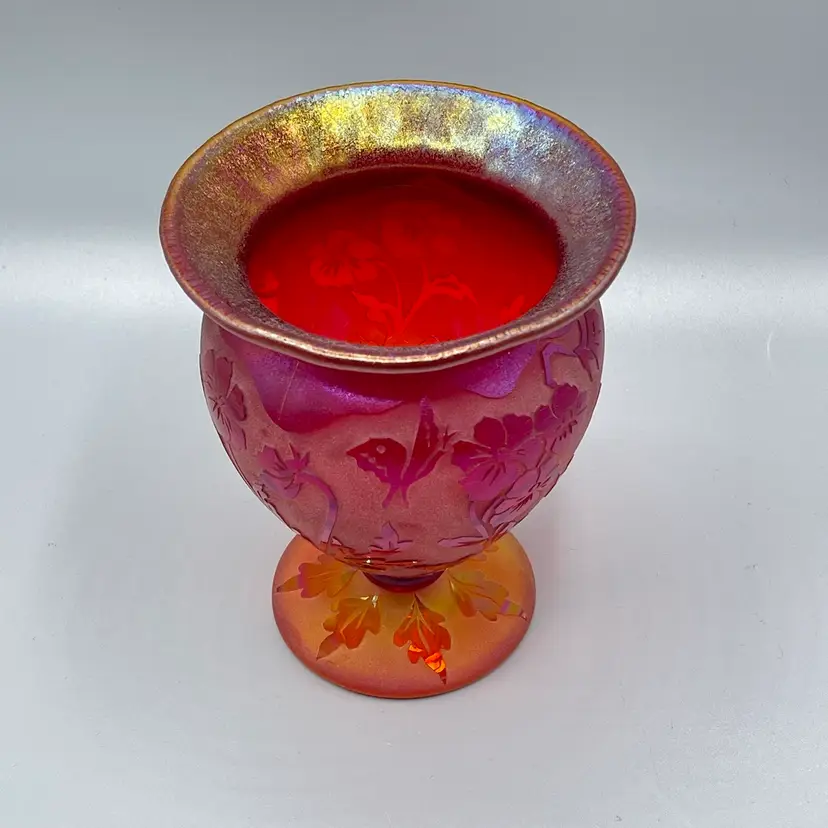 This amazing piece is hand signed 1 of 1 that was designed and carved by Martha Reynolds. The base piece is a Ruby Amberina Stretch 6” Footed Vase. Reynolds was a decorator with Fenton for over a decade and she was known to “experiment with new materials and styles” and she can be attributed to numerous painted pieces. She also worked on several different sand carved designs that were limited edition catalog items and her one of a kind pieces are amazing works of art. There are no chips or crack, there are no major scuffs but some very minor on the base where it touches a tabletop.