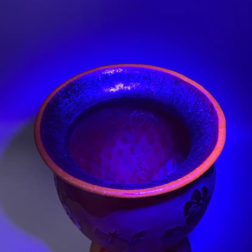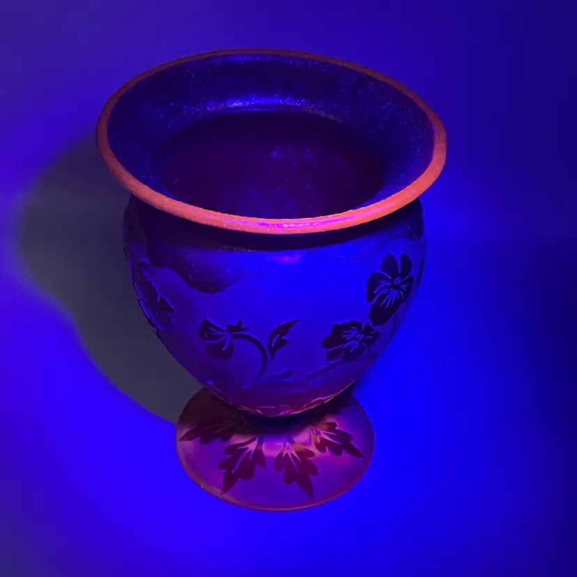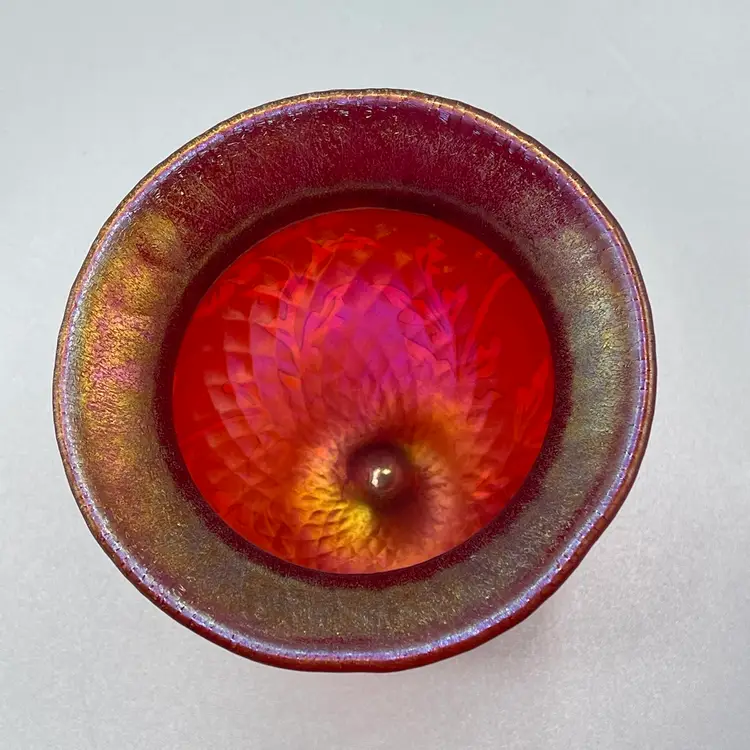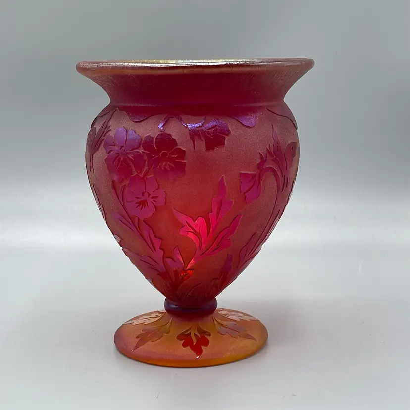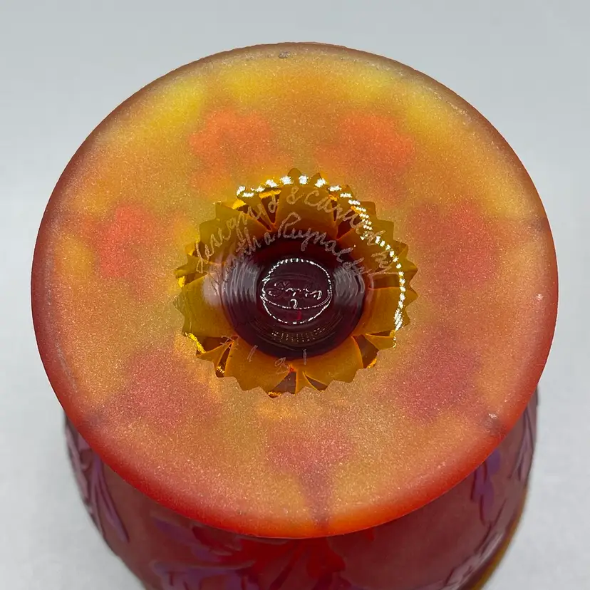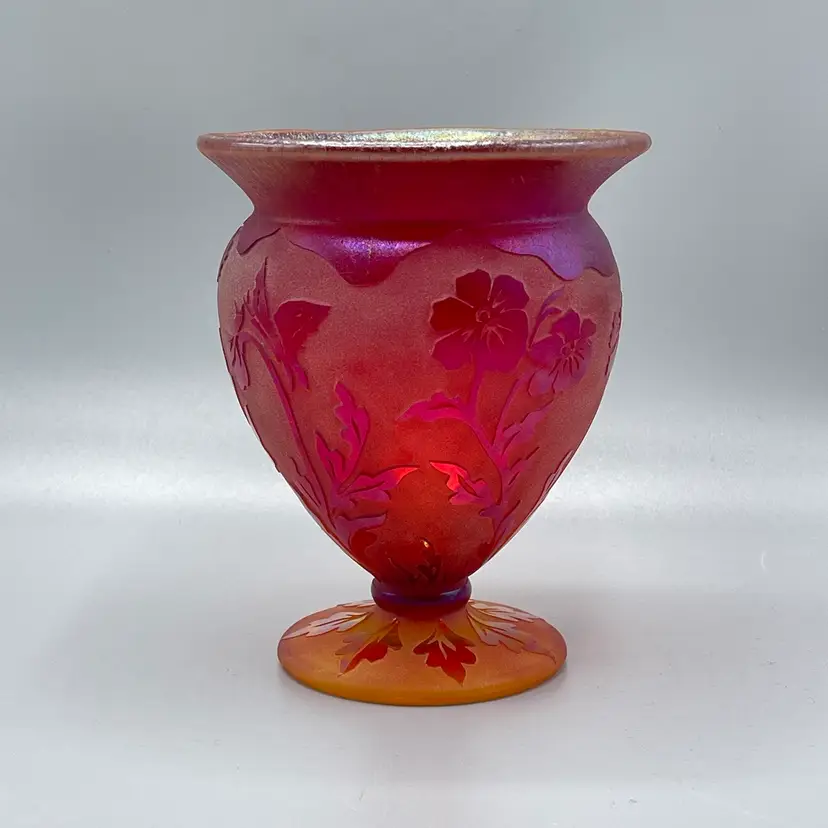 This amazing piece is hand signed 1 of 1 that was designed and carved by Martha Reynolds. The base piece is a Ruby Amberina Stretch 6” Footed Vase. Reynolds was a decorator with Fenton for over a decade and she was known to “experiment with new materials and styles” and she can be attributed to numerous painted pieces. She also worked on several different sand carved designs that were limited edition catalog items and her one of a kind pieces are amazing works of art. There are no chips or crack, there are no major scuffs but some very minor on the base where it touches a tabletop.