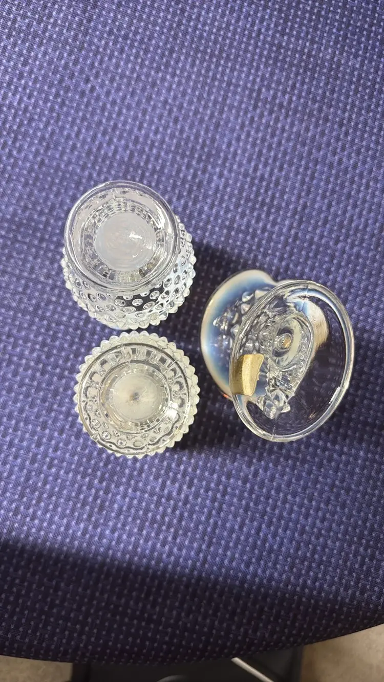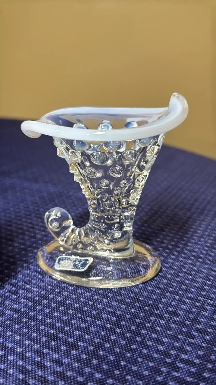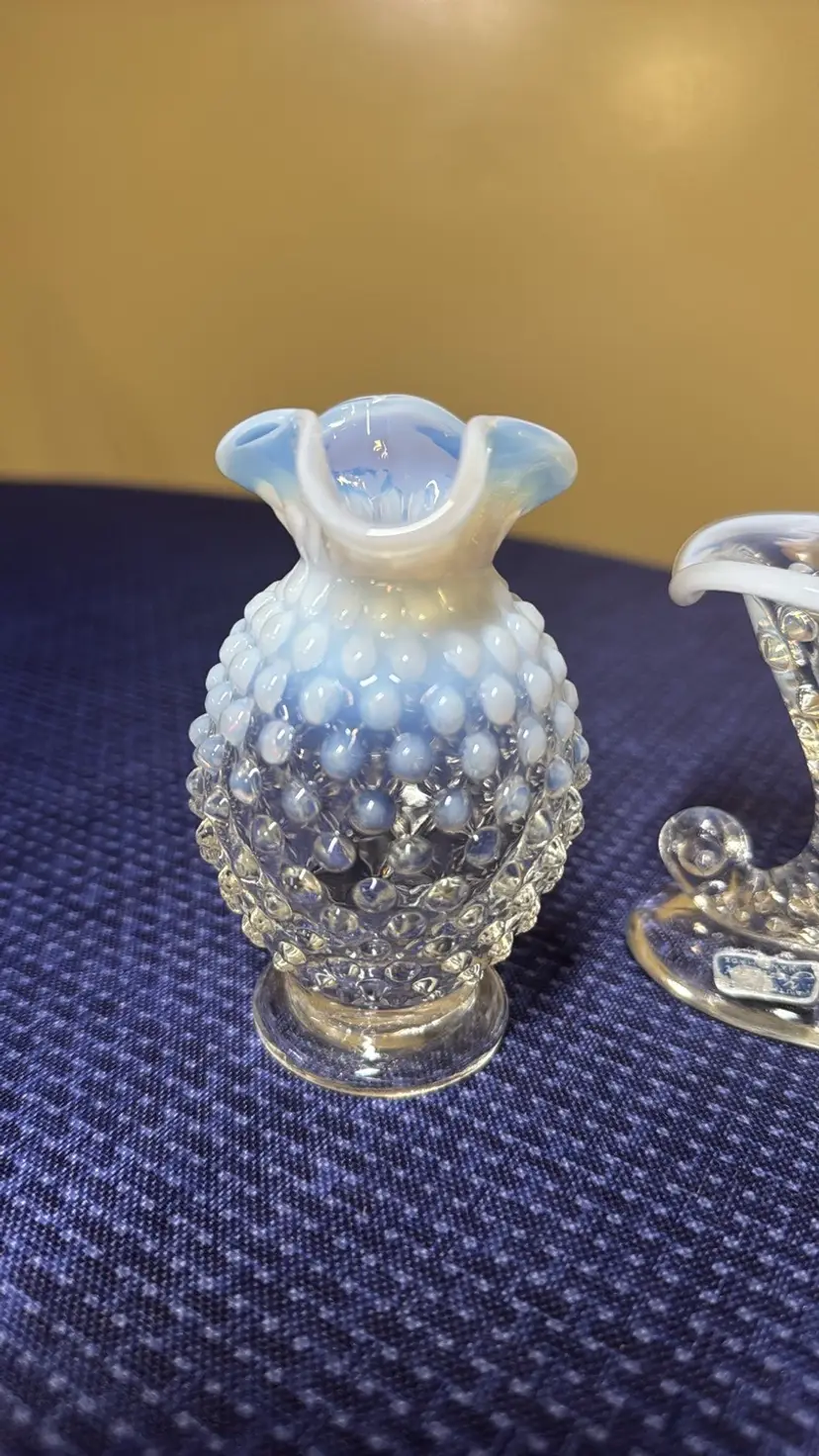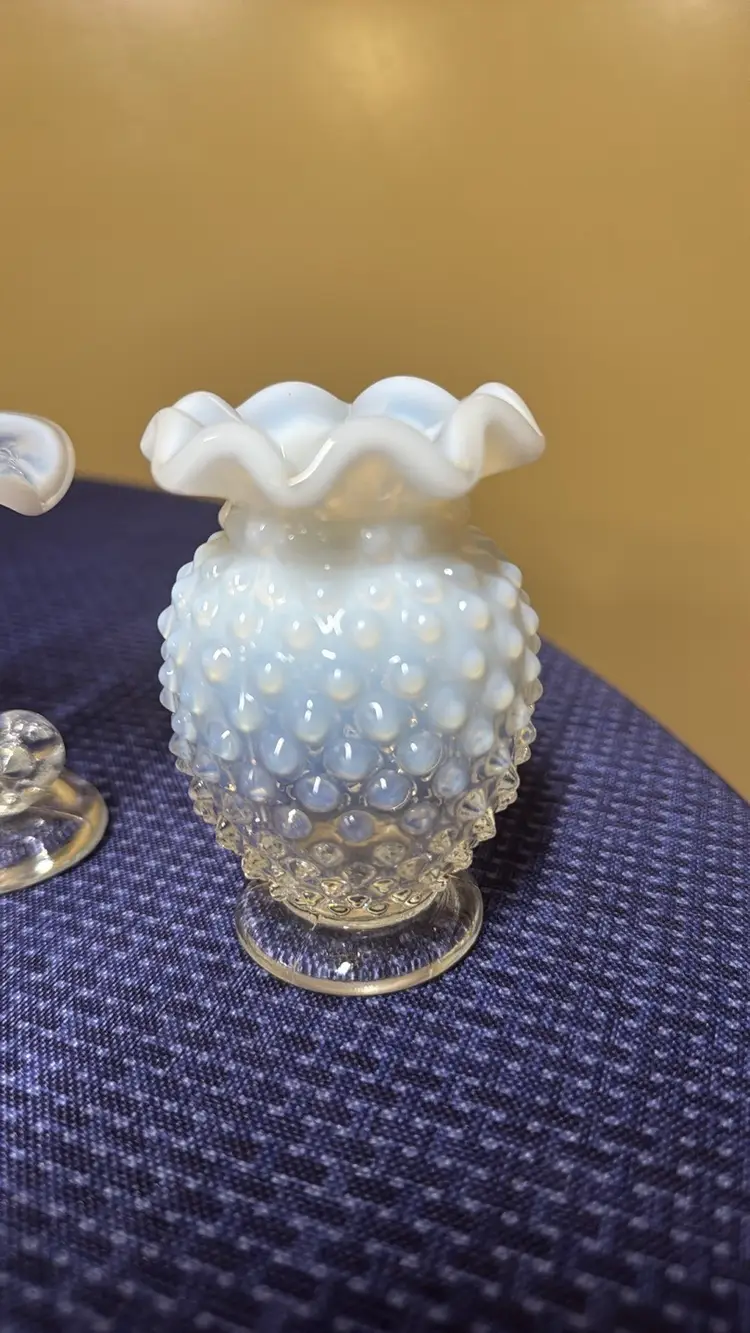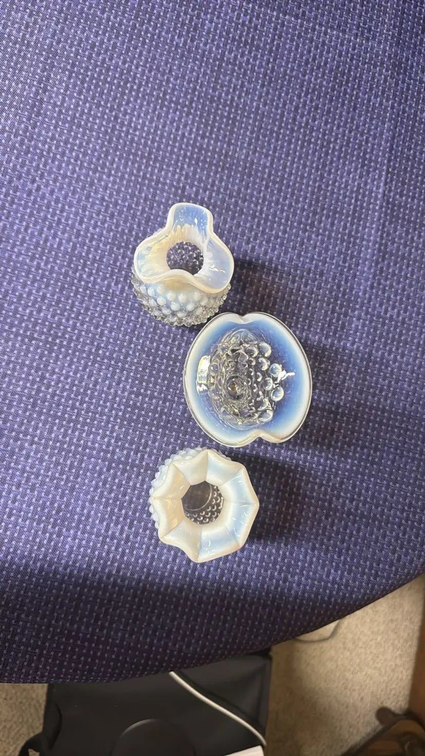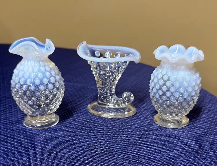 Vintage Fenton opalescent hobnail ruffle top vase opaline moonstone 3 1/2” Tall cases set of 3 One is 4” tall One has it’s original Fenton sticker Enhance your home decor with this elegant white glass vase set. Perfect for adding a touch of sophistication to any room. All are in excellent condition with no breaks or chips (9368282515w2121)