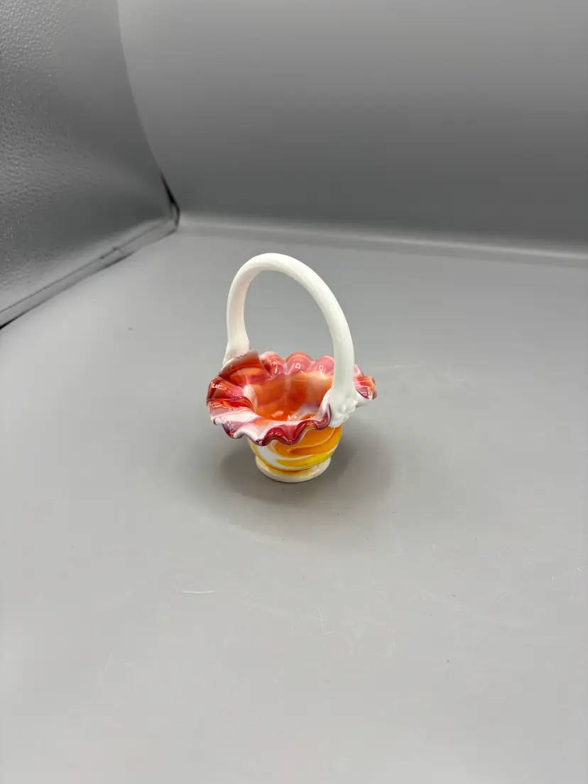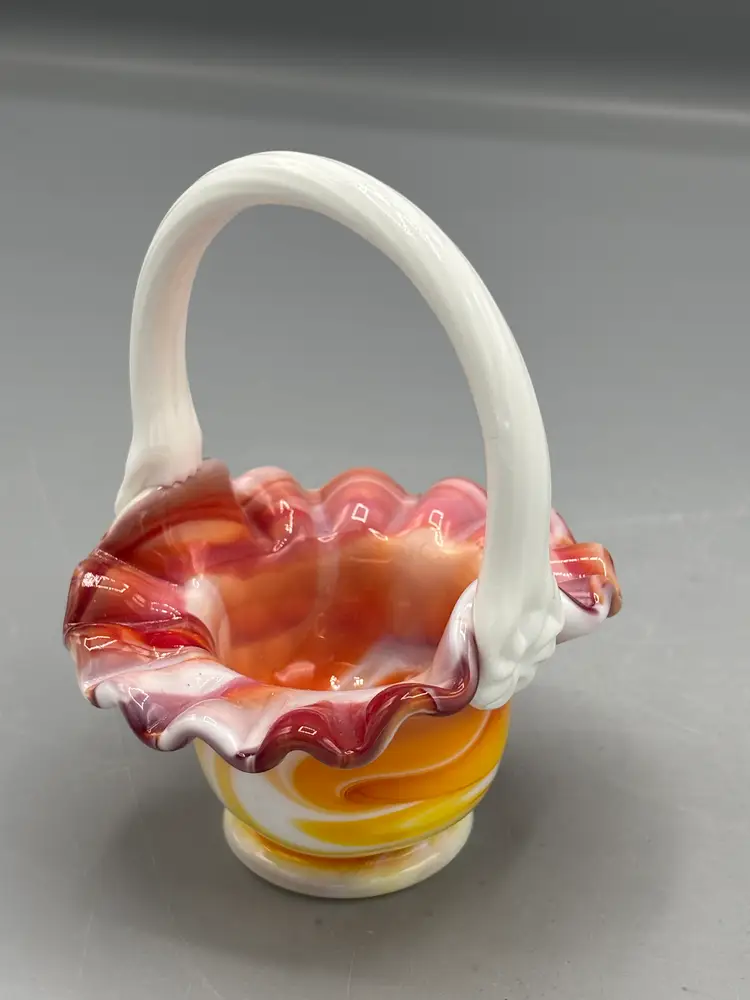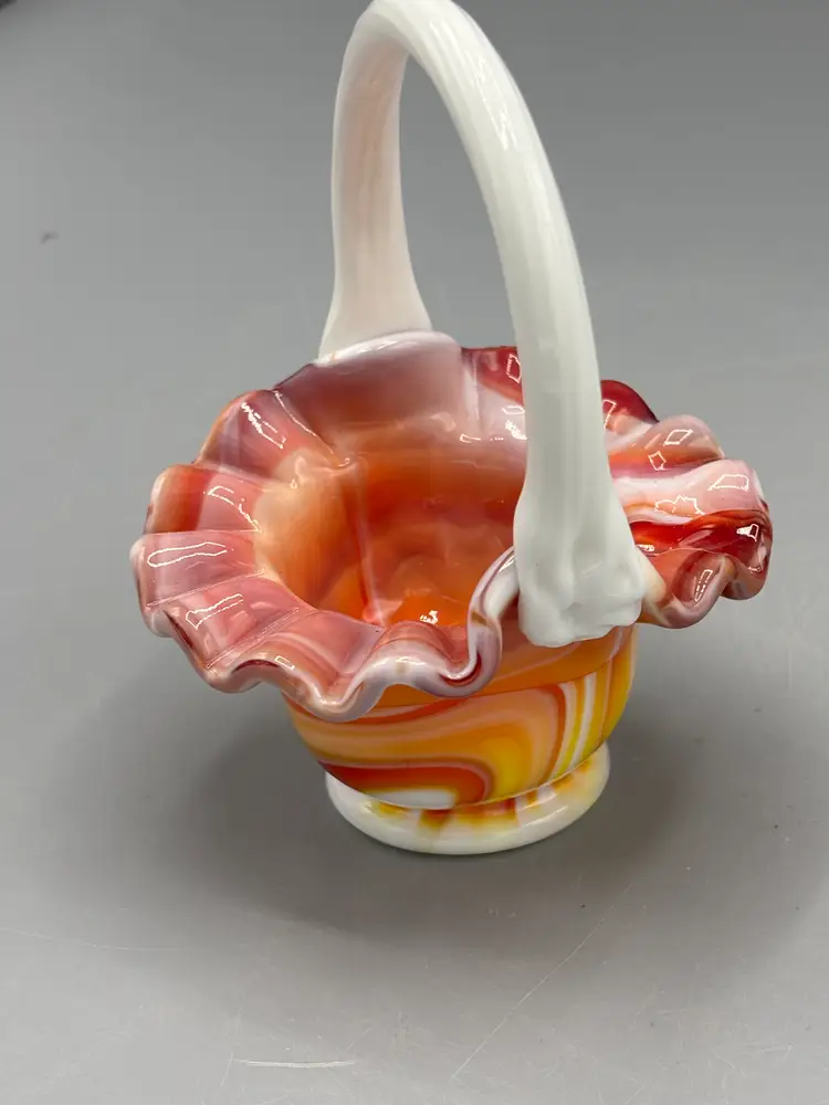 Fenton's Orange Swirl Slag glass basket exemplifies the artistry of mid-century glasswork, featuring the distinctive swirled pattern characteristic of this collectible line. The slag glass construction creates rich depth and visual interest, while the basket form offers both decorative appeal and functional versatility. A prized addition for serious glass collectors and vintage enthusiasts seeking authentic Fenton craftsmanship.