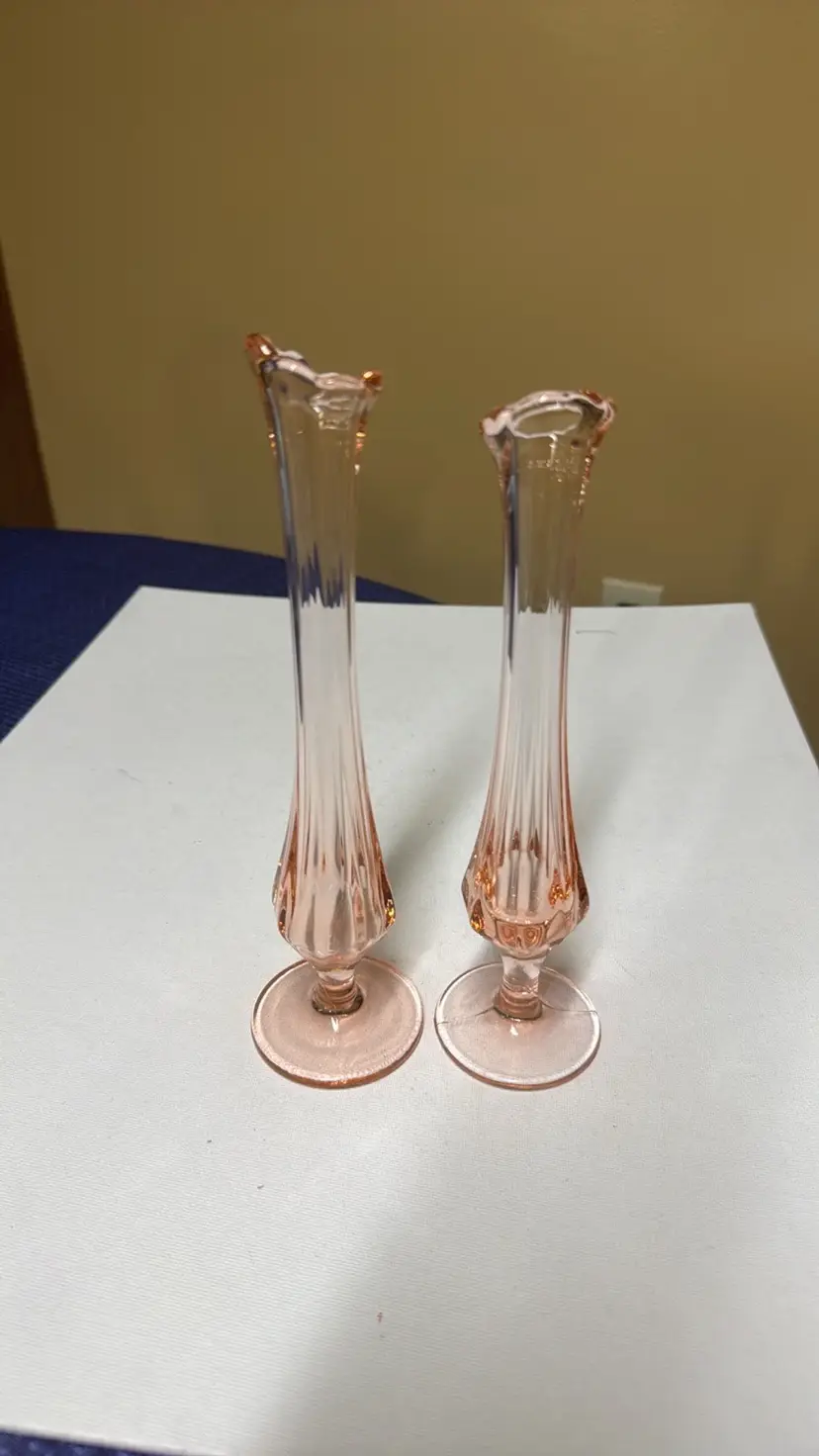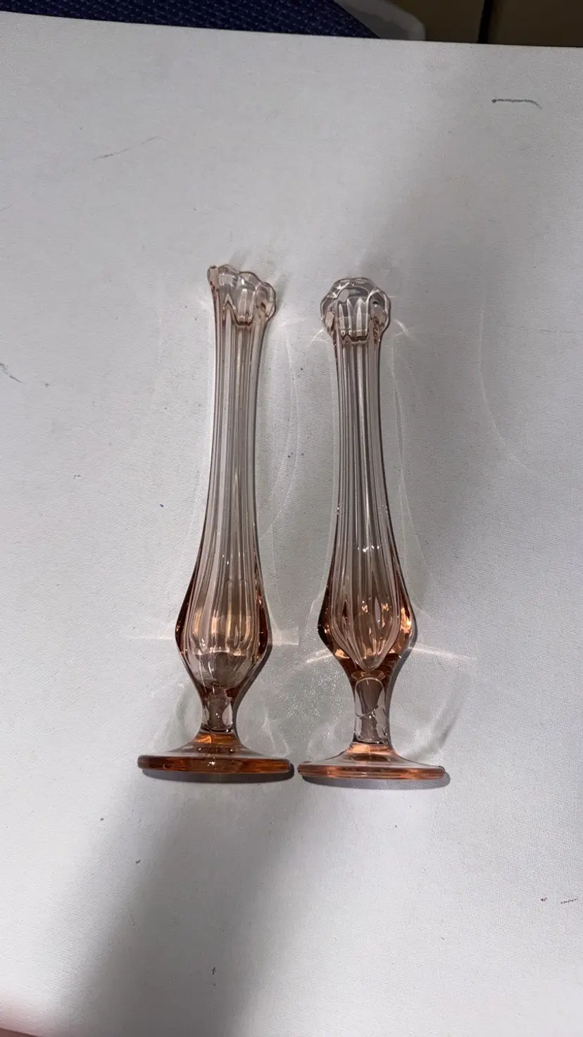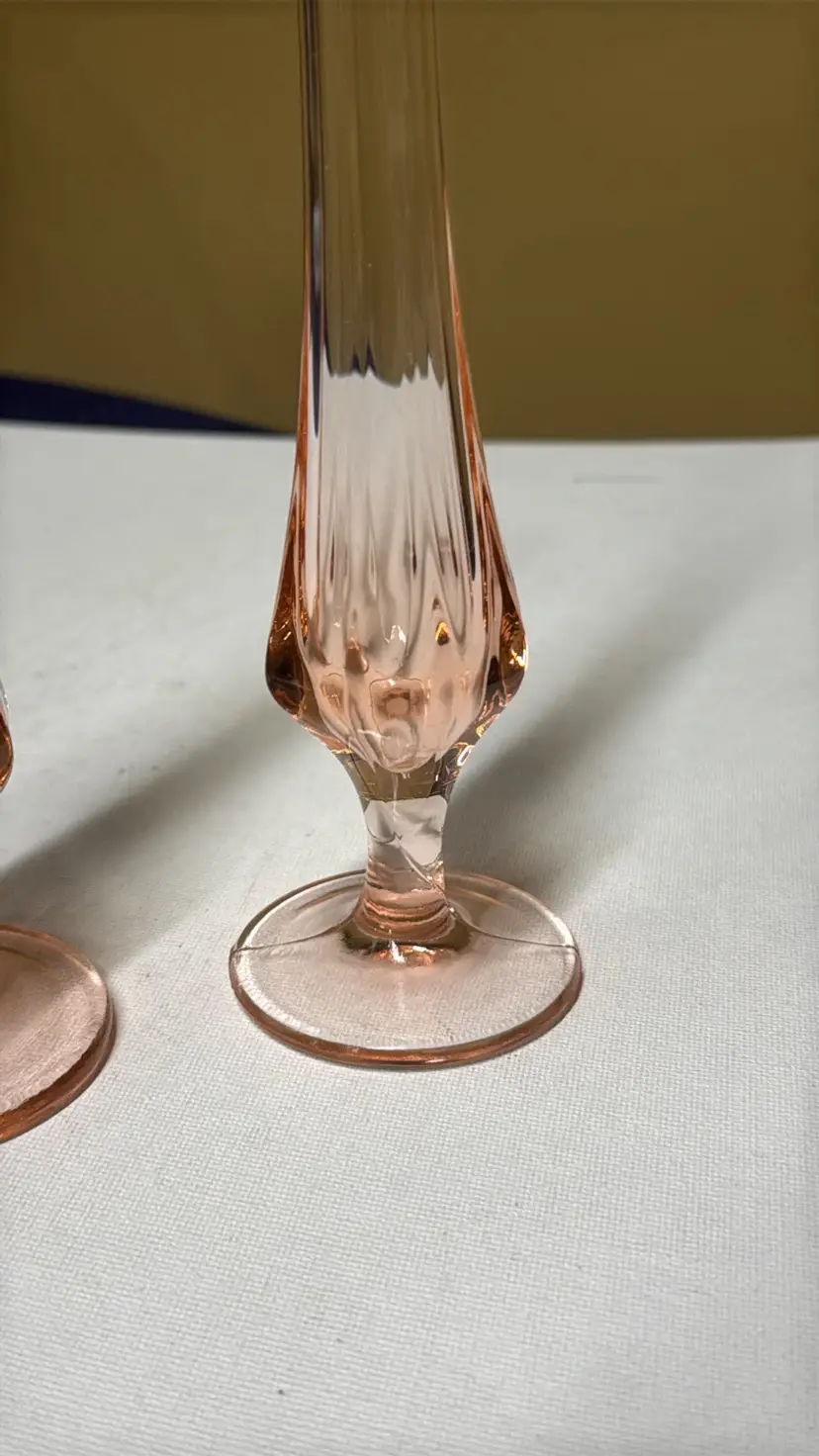Pair of 8.5" and 9” Pink Swung Glass Bud Vases Add a touch of elegance to your home with these beautiful pink glass vases. Perfect for any decor style. Both are in excellent condition with no breaks or chips (8928182525w2121)