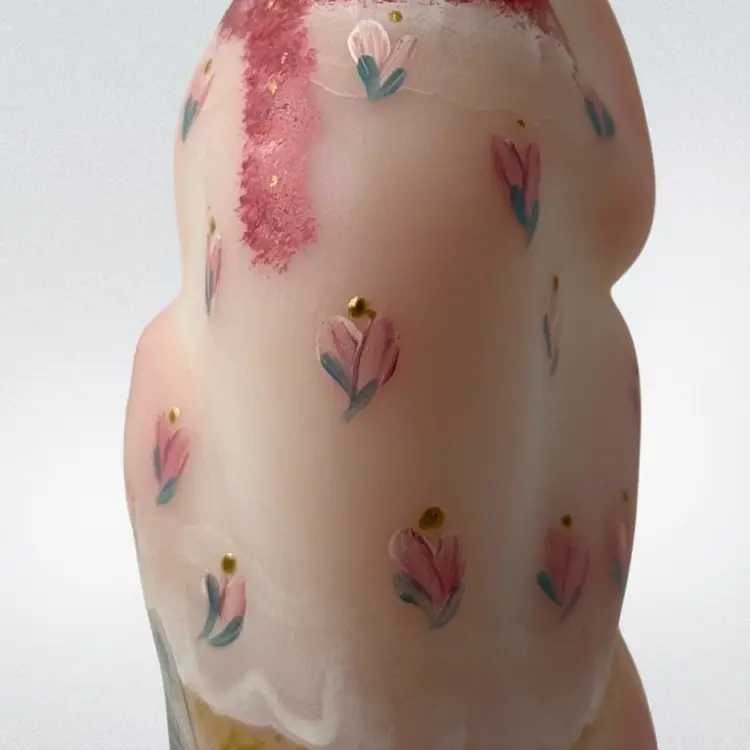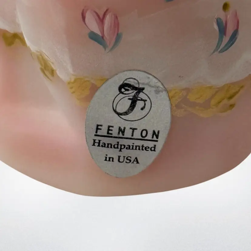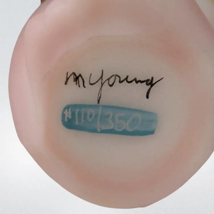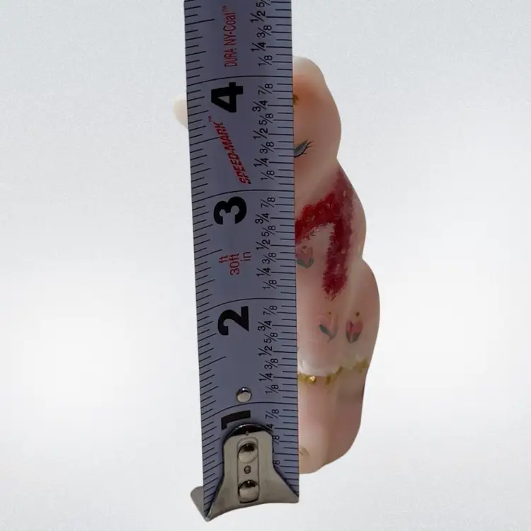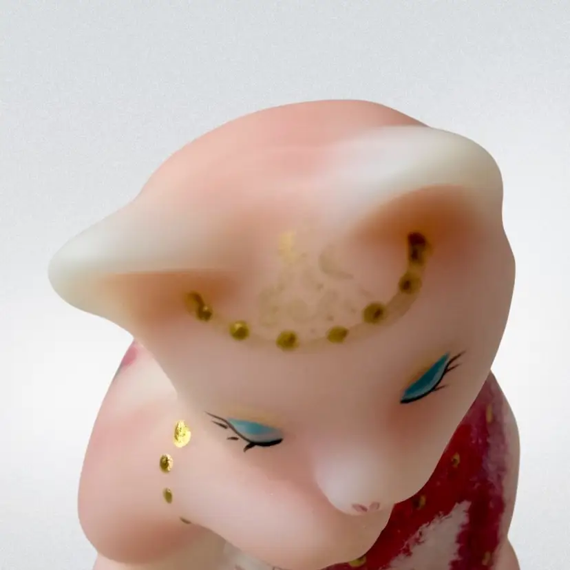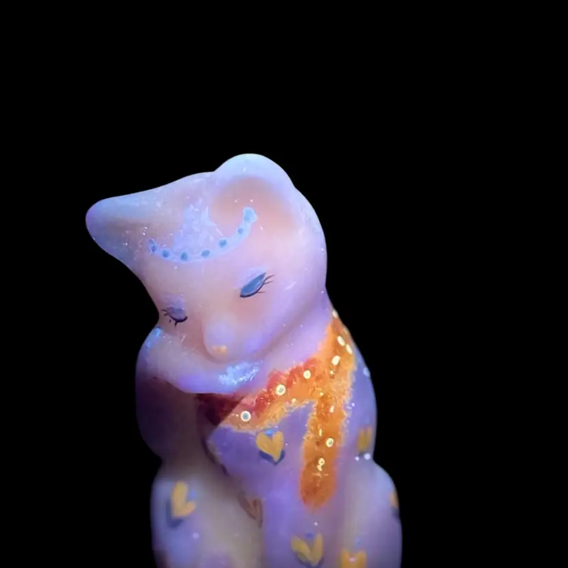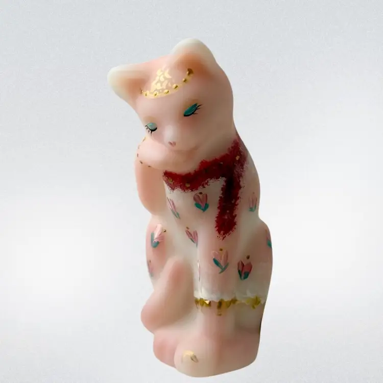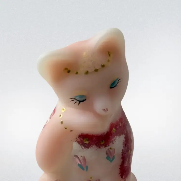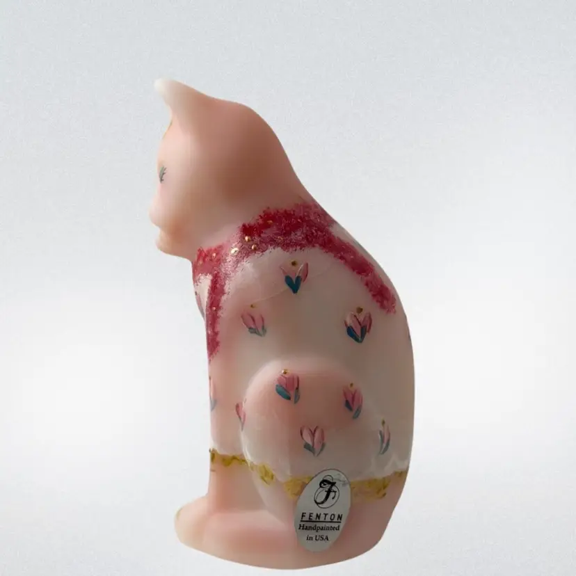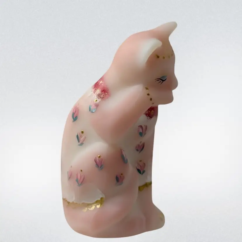 Beautiful Fenton burmese art glass limited edition grooming cat with tiara, scarf, toe ring etc. Some glow with 365 black light.