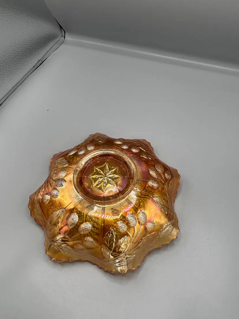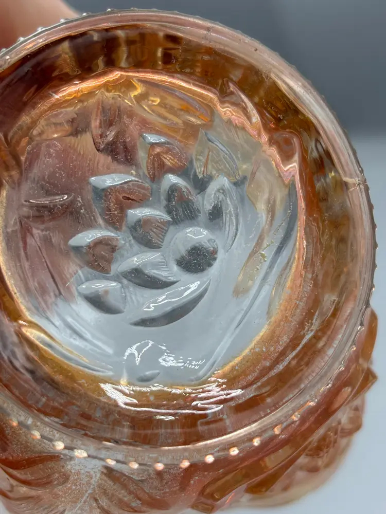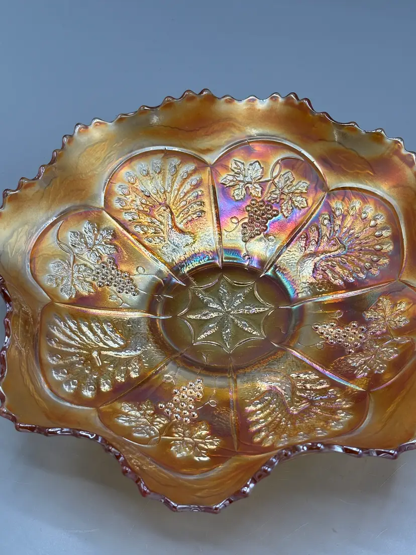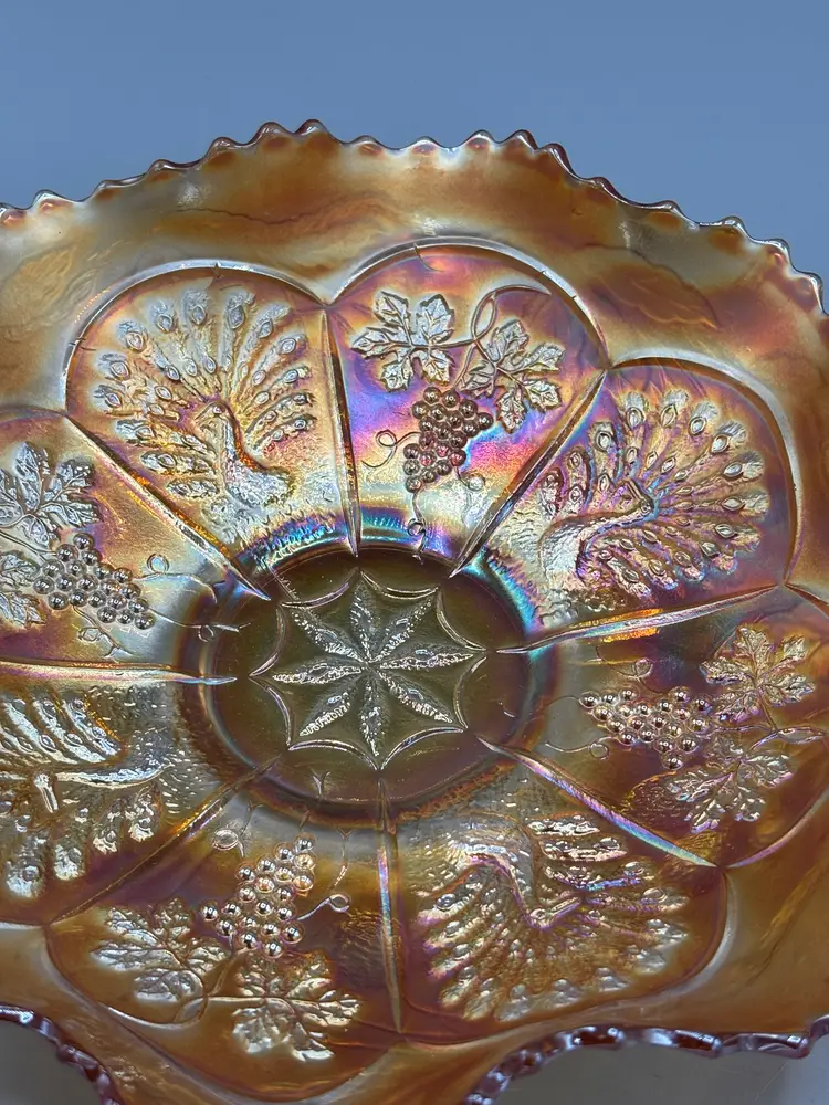 This elegant Fenton piece showcases the iconic Peacock & Grapes pattern with a distinctive ruffled rim. Standing 8 3/4 inches wide and 2 inches tall, it's a refined addition to any vintage glassware collection.
