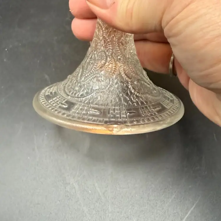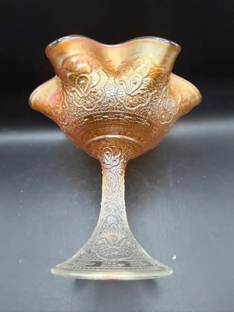 Carnival glass, known for its iridescent shimmer, was produced primarily from the early 1900s to the 1930s, with Fenton Art Glass being one of its most prolific and well-regarded manufacturers. Fenton's "Peacock Feather" pattern, also known as "Stream of Hearts" or "Persian Medallion," is a popular design in marigold carnival glass. This pattern typically features a central motif of peacock feathers or flowing hearts, surrounded by other decorative elements. This has a small chip on the base.