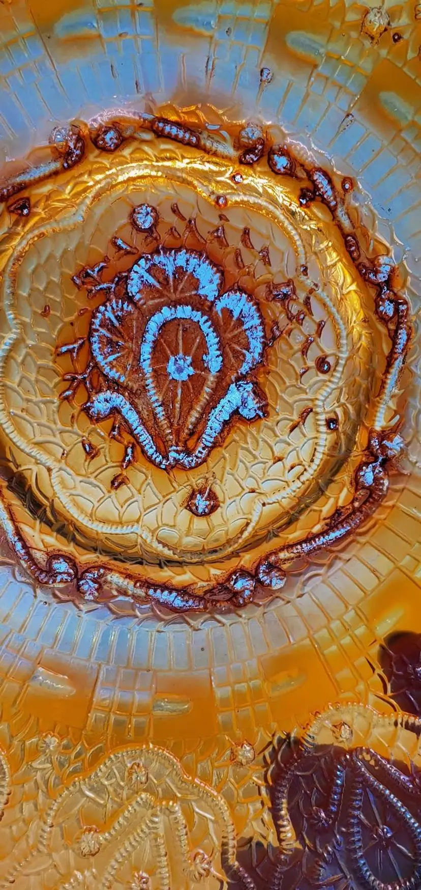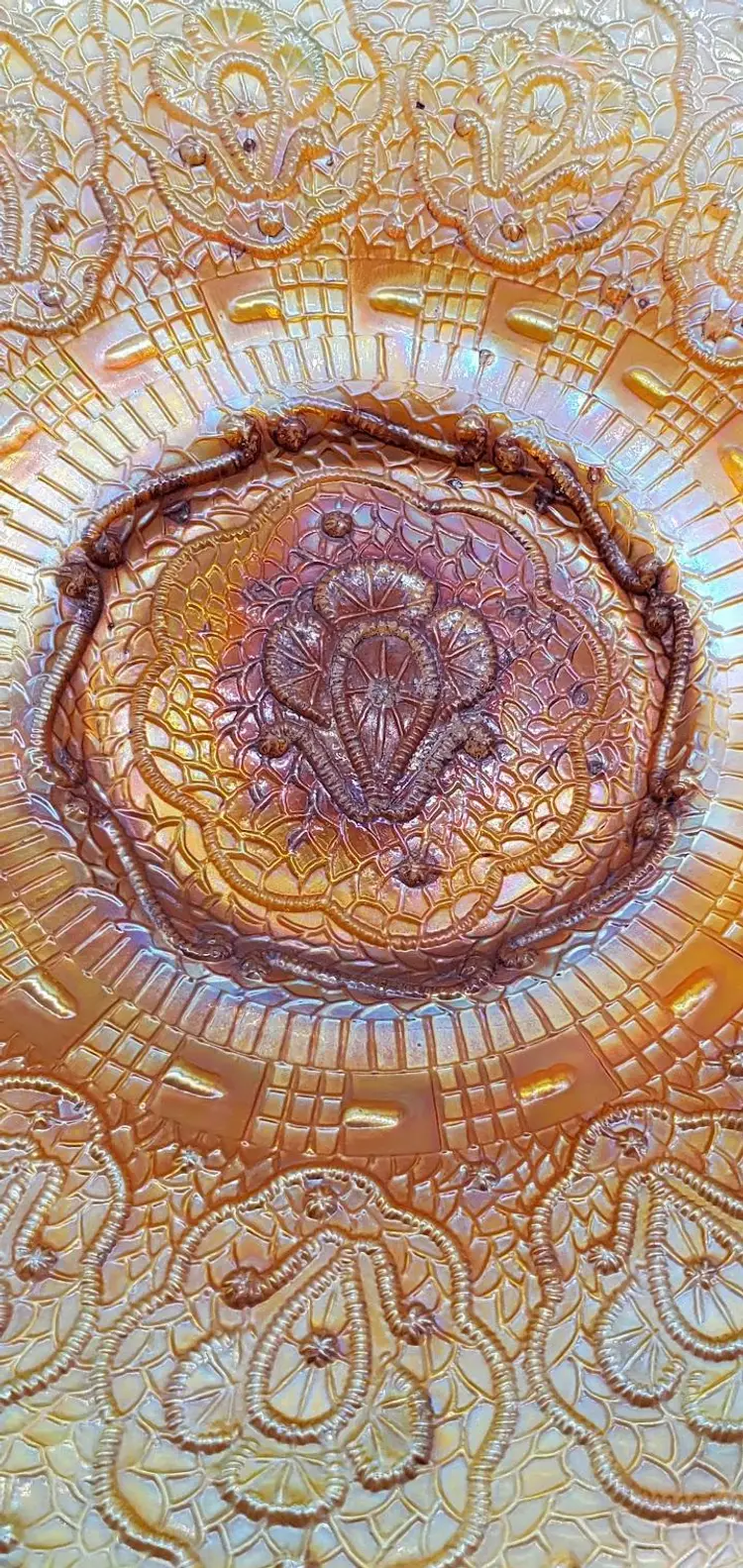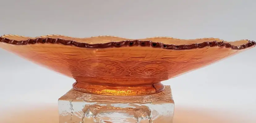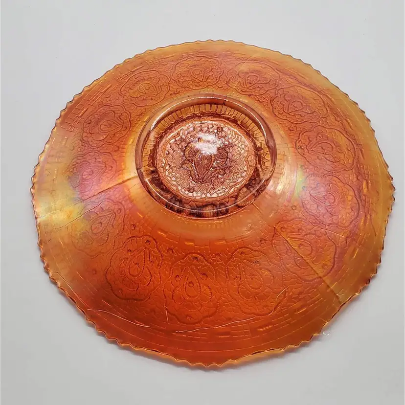 This lovely dish was made by Fenton for their Persian Medallion line. It measures 9" in diameter and 1" high.