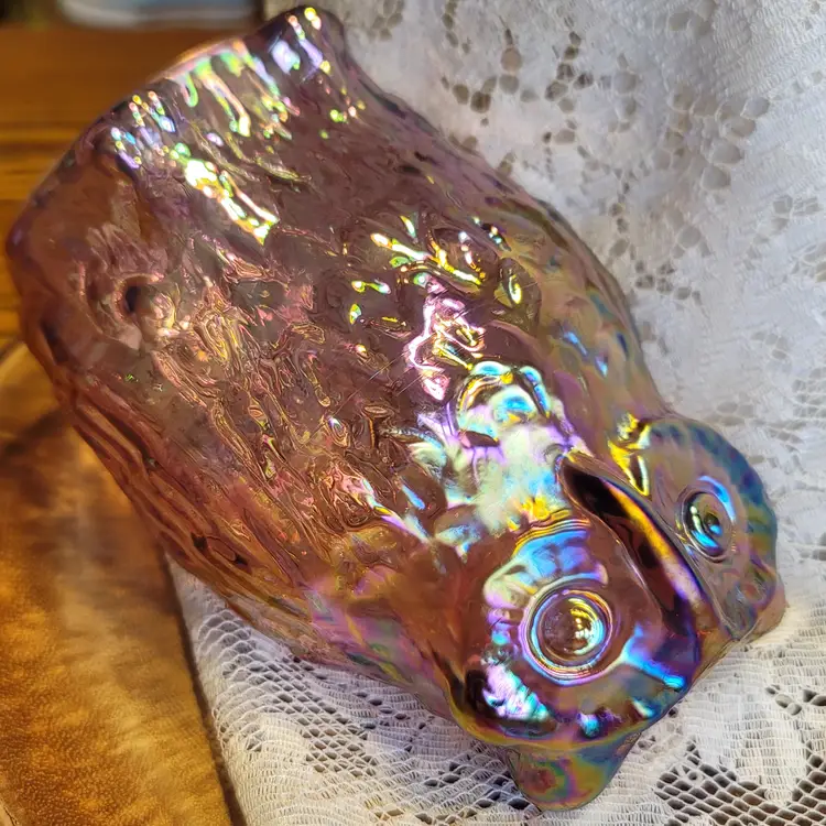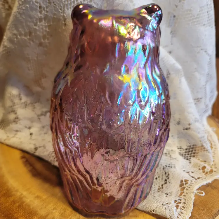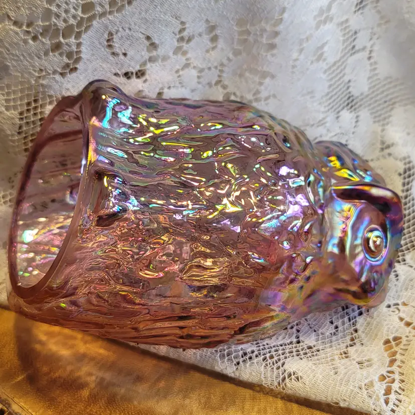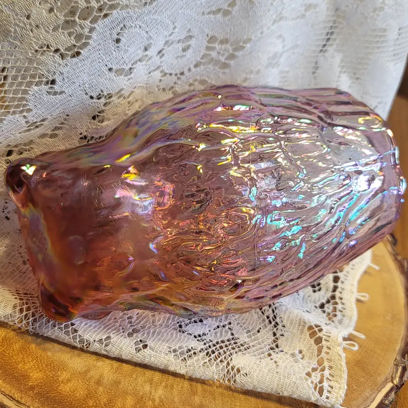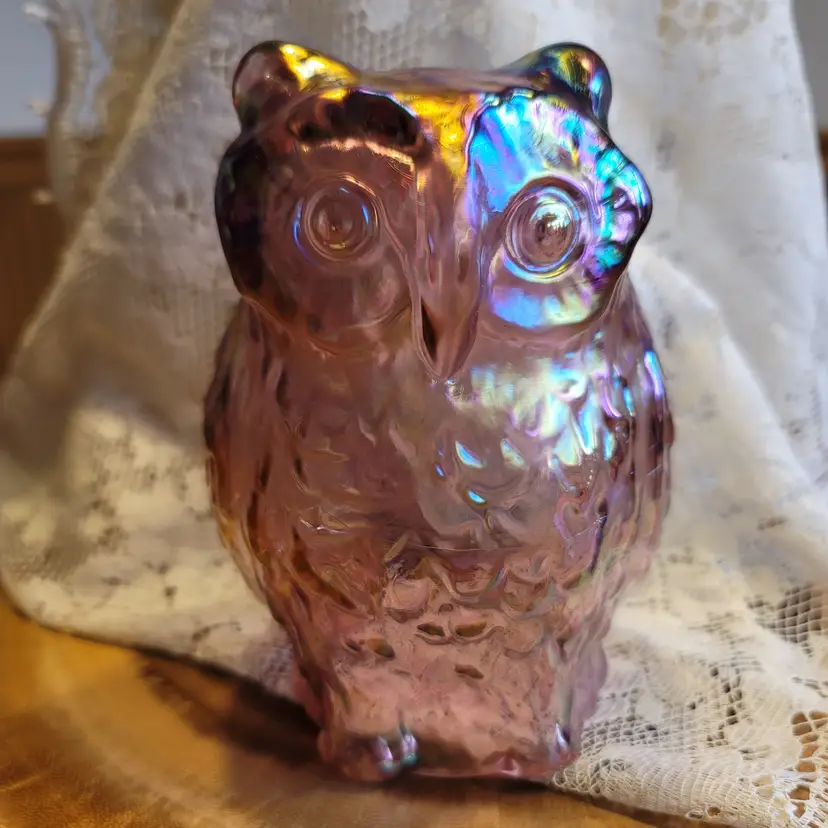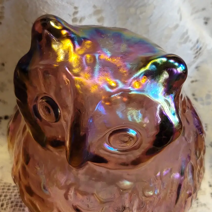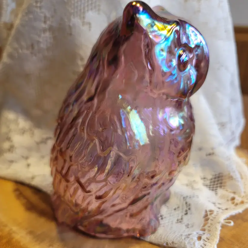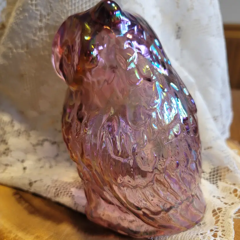 Gorgeous pink iridescent carnival glass owl Hollow (not solid glass) Dimensions: approx. 6.5" H by 4" W