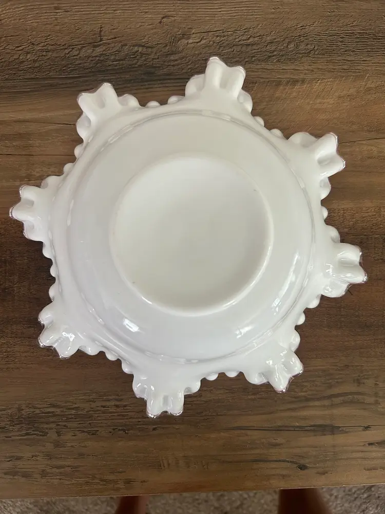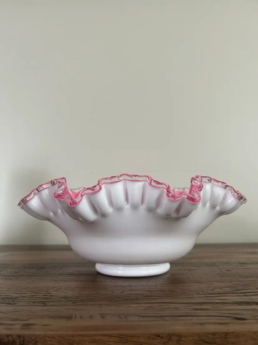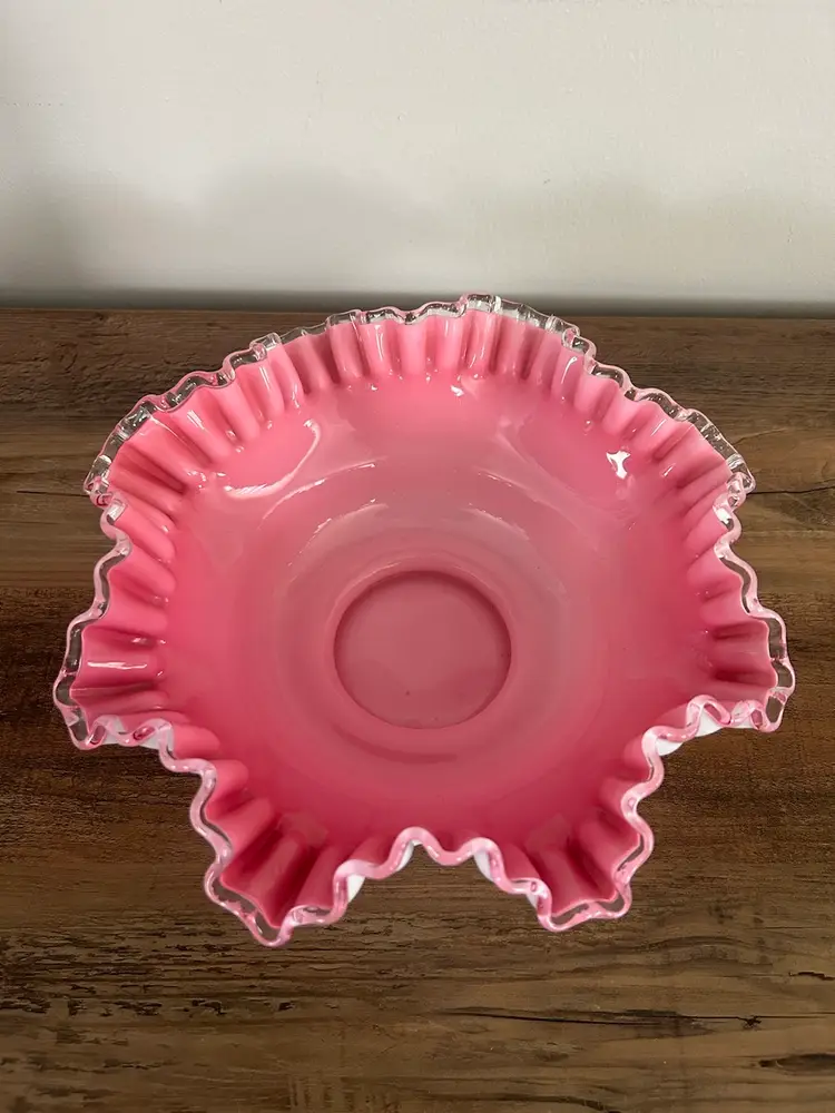 Excellent pre-owned condition! Fenton pink crest bowl measures 10” x 4” deep. Comes with clear flower frog.