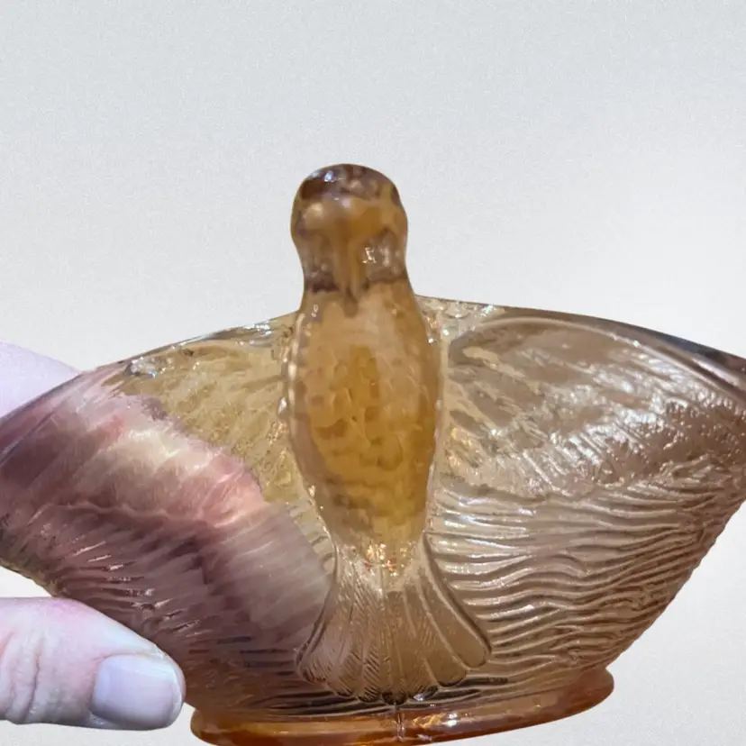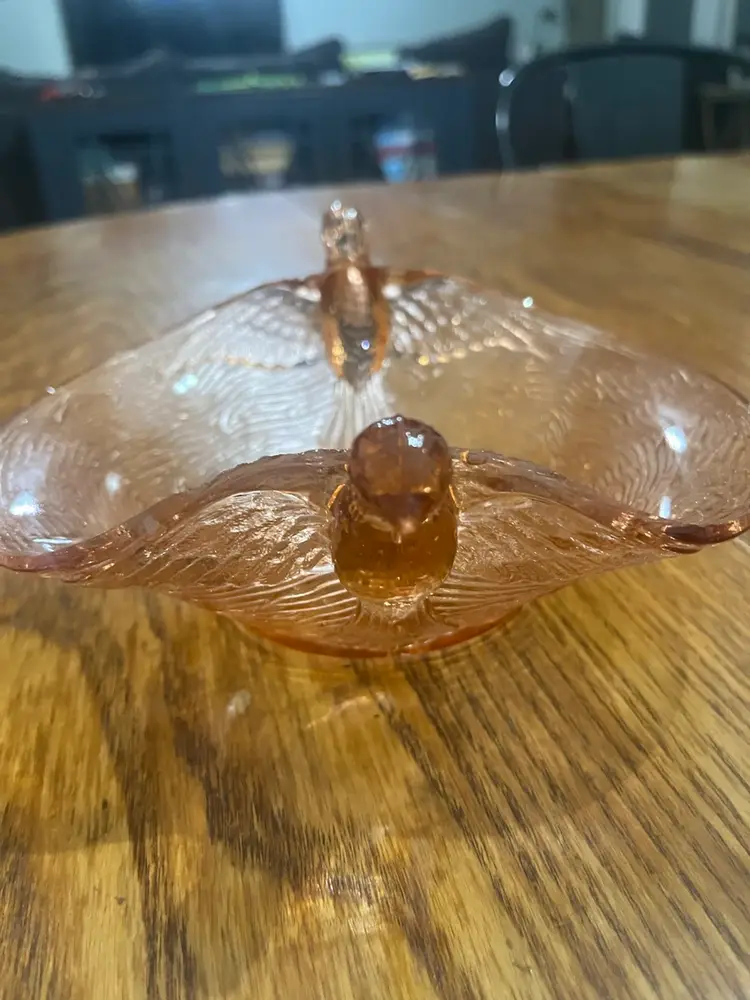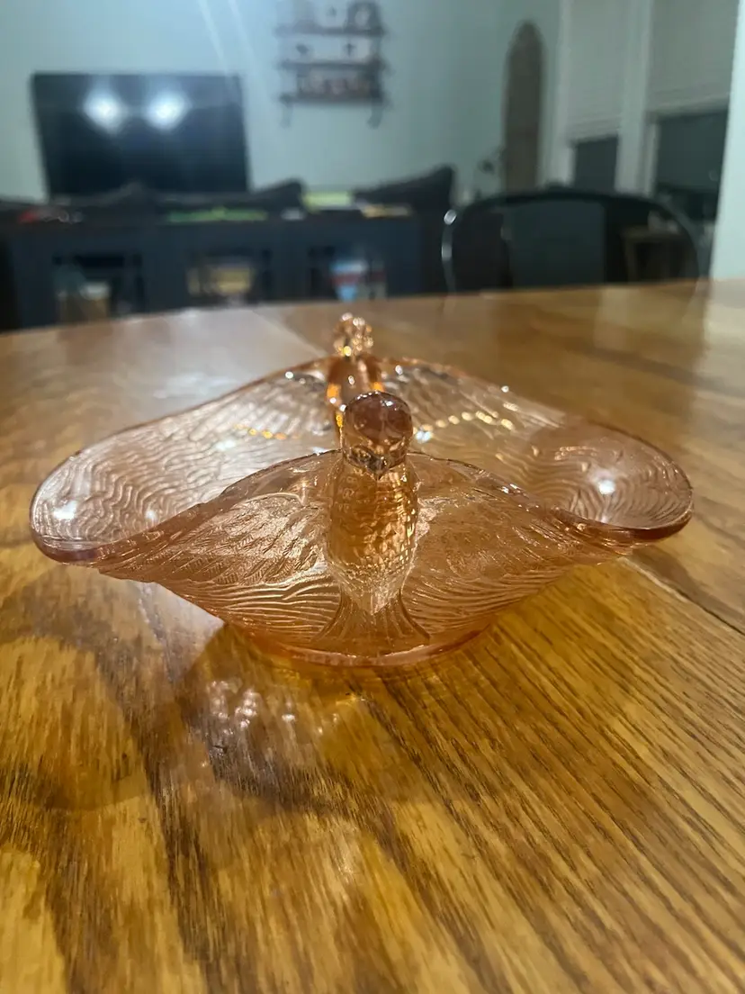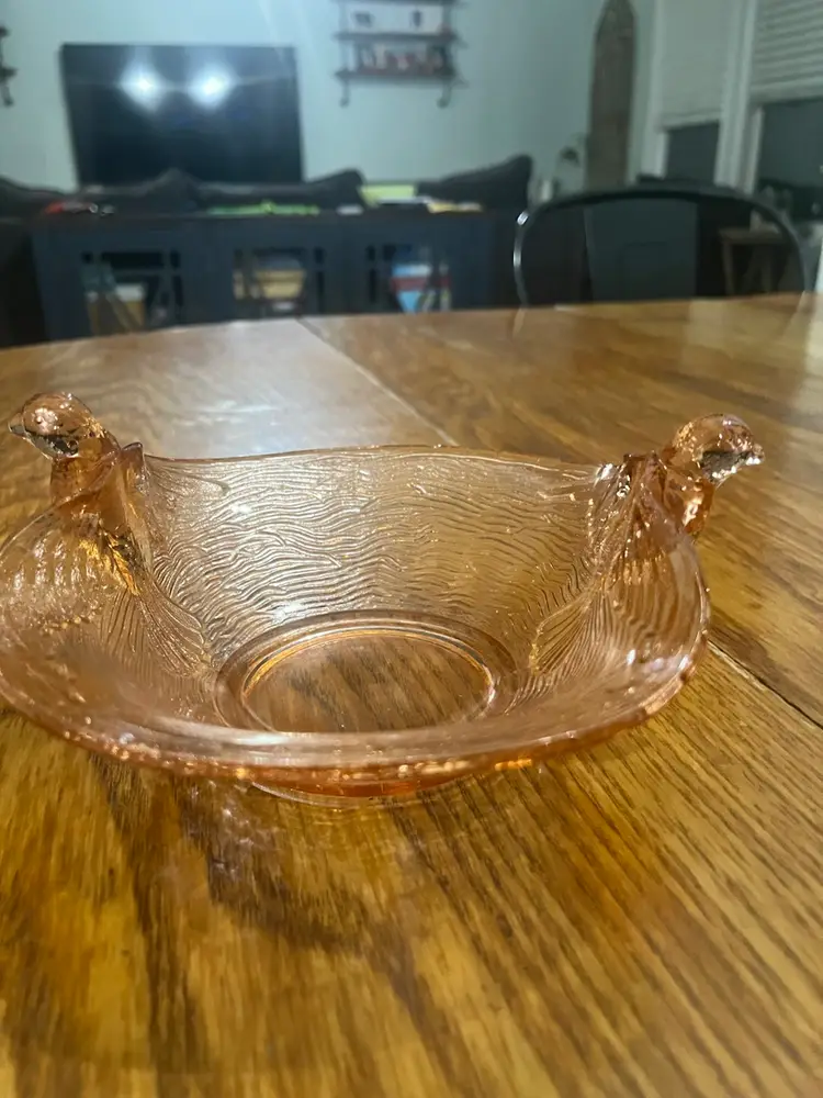 This particular 'Bird's Nest' pattern, often produced in pink, is a classic example of Fenton's Depression glass output from the 1940s. The design, featuring flying birds as handles and a textured bowl, evokes a sense of whimsy and elegance, making it a popular item for collectors of vintage tableware and decorative art glass.