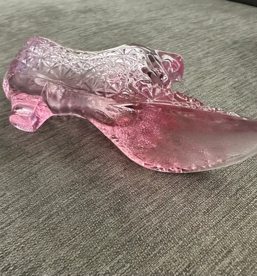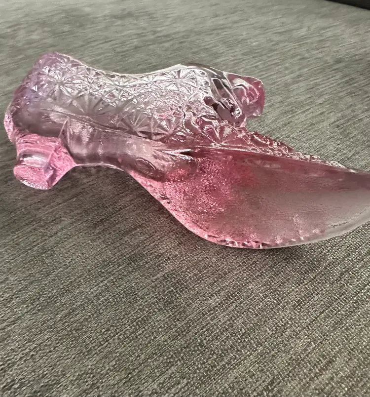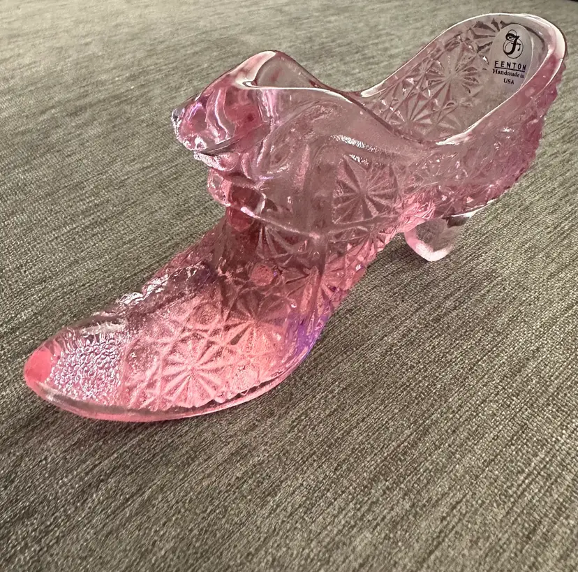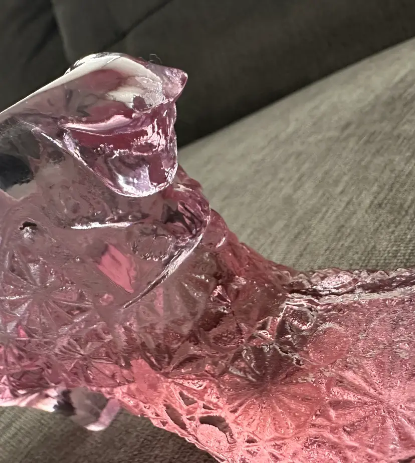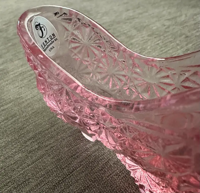 Just under 6” long in the pink daisy button pattern with the cat head! Excellent condition. Label included, but also marked with the Fenton mark on the bottom.