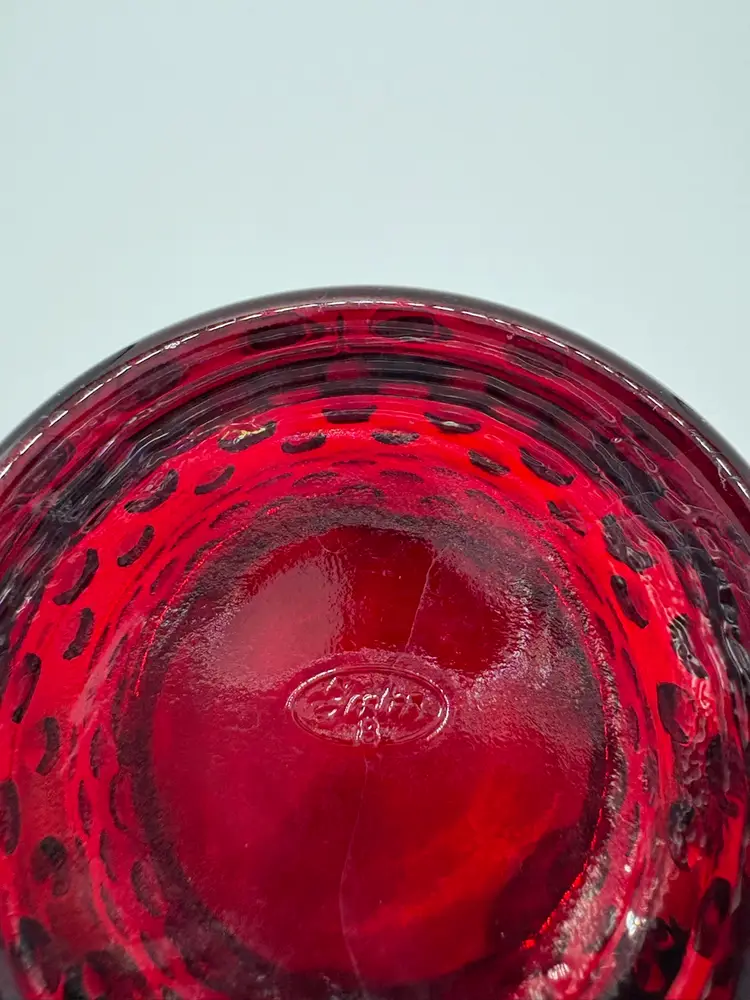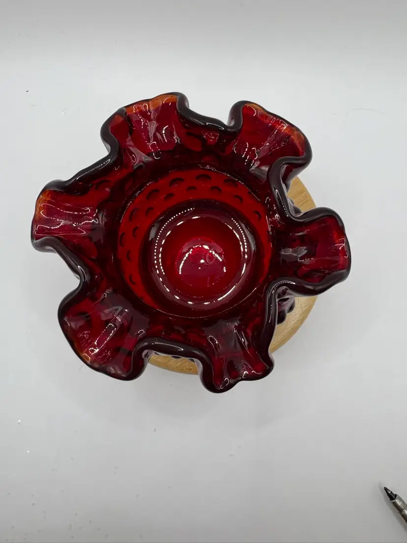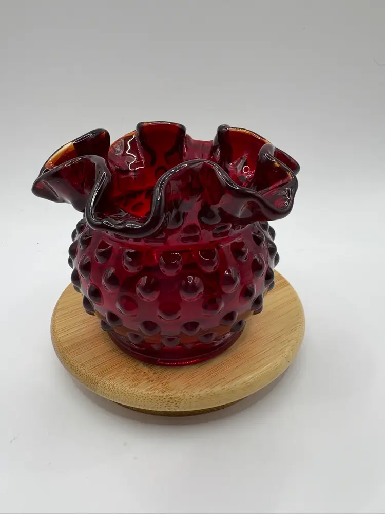 Fenton Red Hobnail Ruffled Edge Measures 3 inches tall and 3 1/2 inches at widest No chips or cracks.. in excellent condition