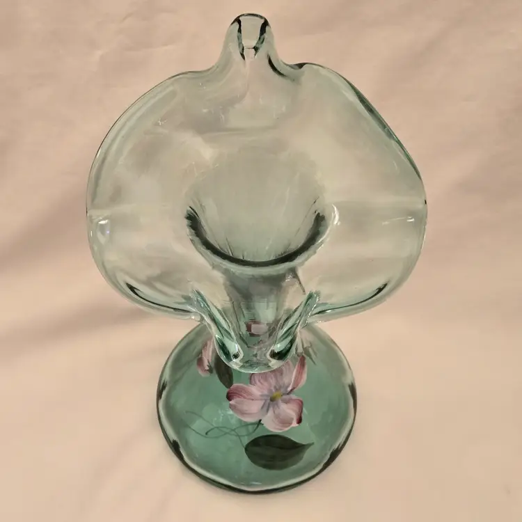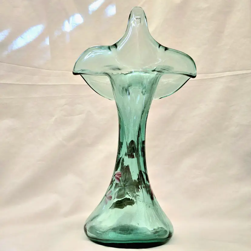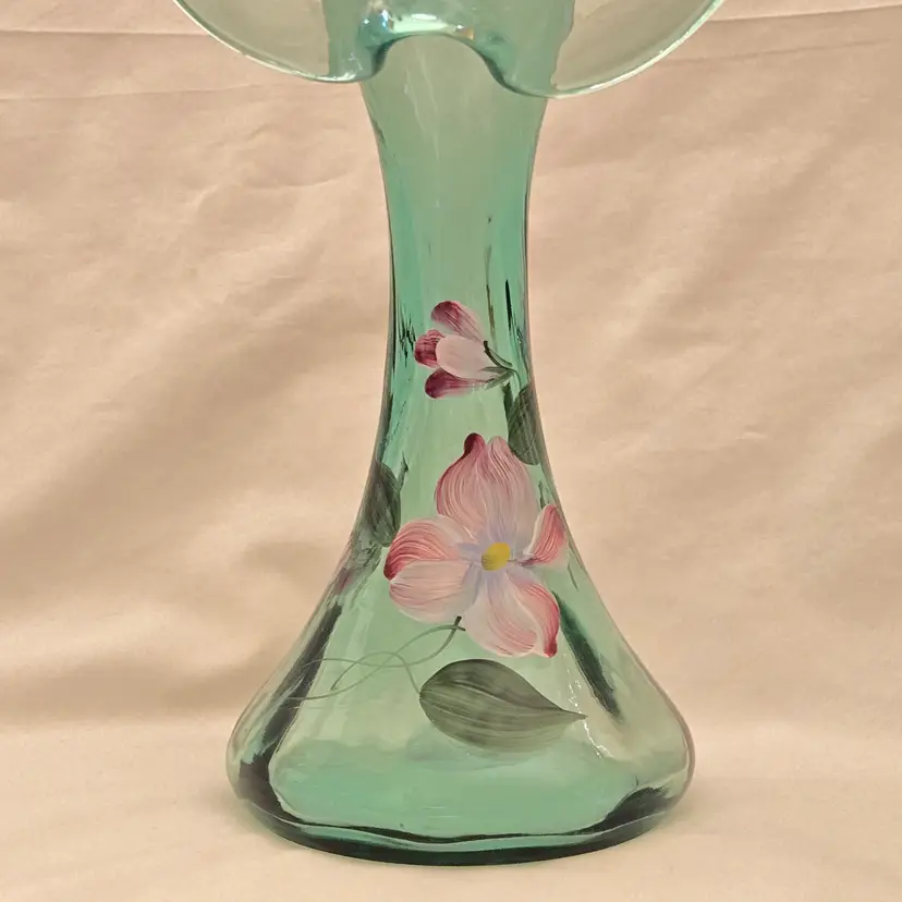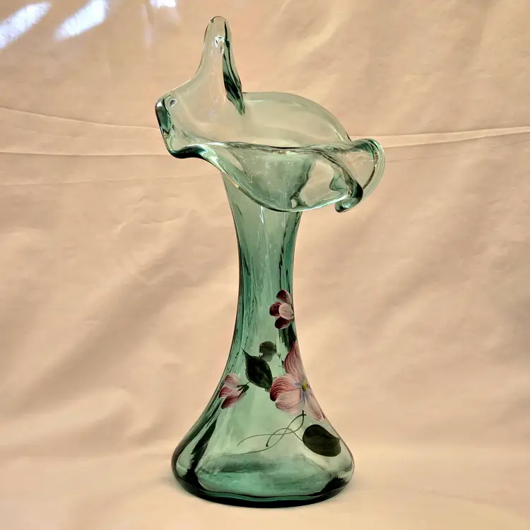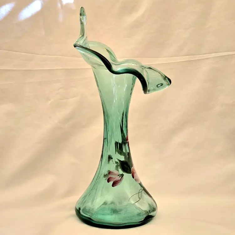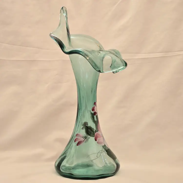 FENTON Ribbed Sea Mist Tulip Vase Jack In Pulpit Hand Painted Signed D Barbour. Used condition with some dust inside, dirt and manufacturer flaws. Please view all the photos and please ask any questions prior to purchase when possible.