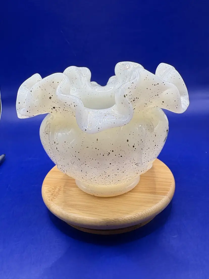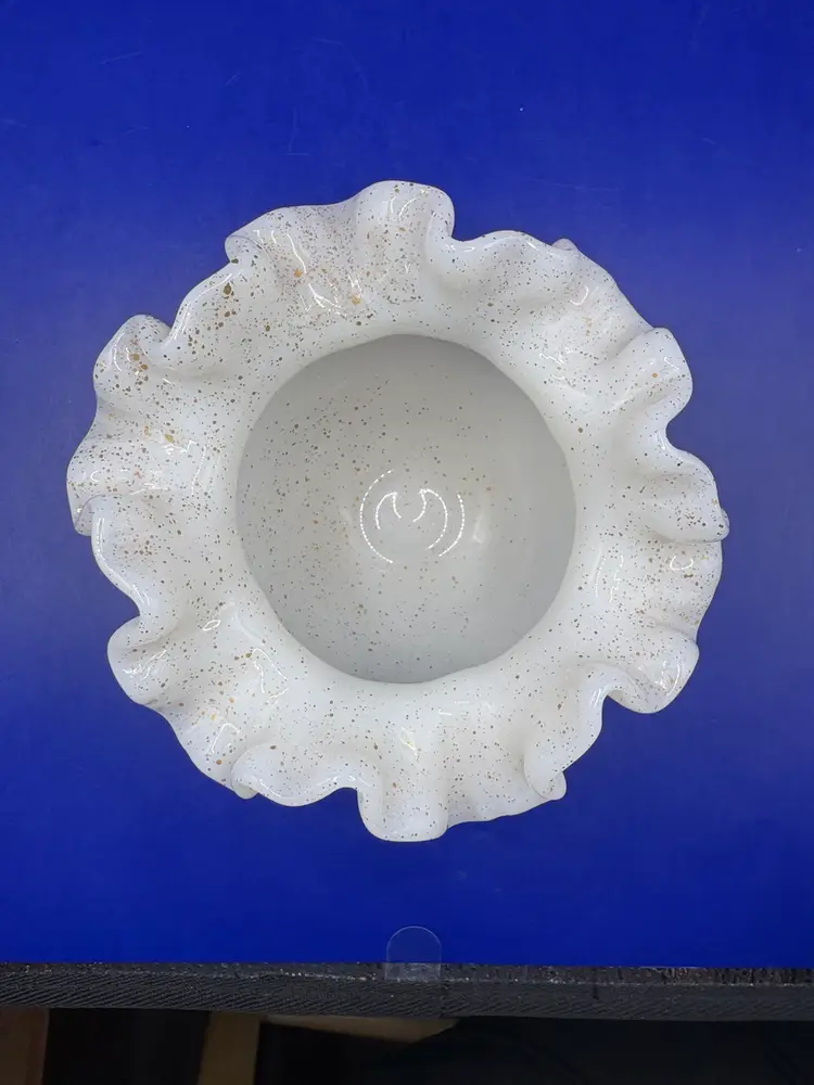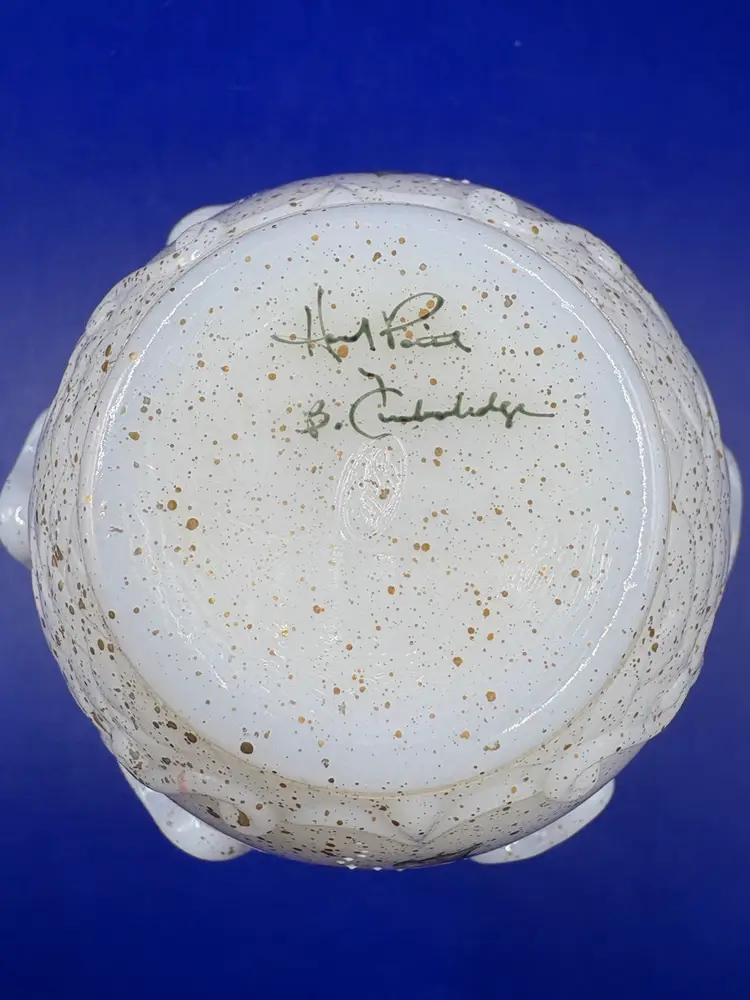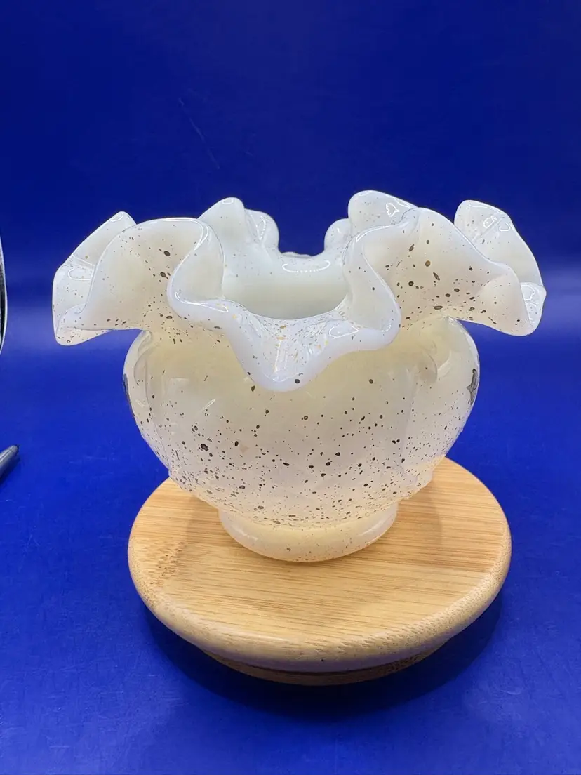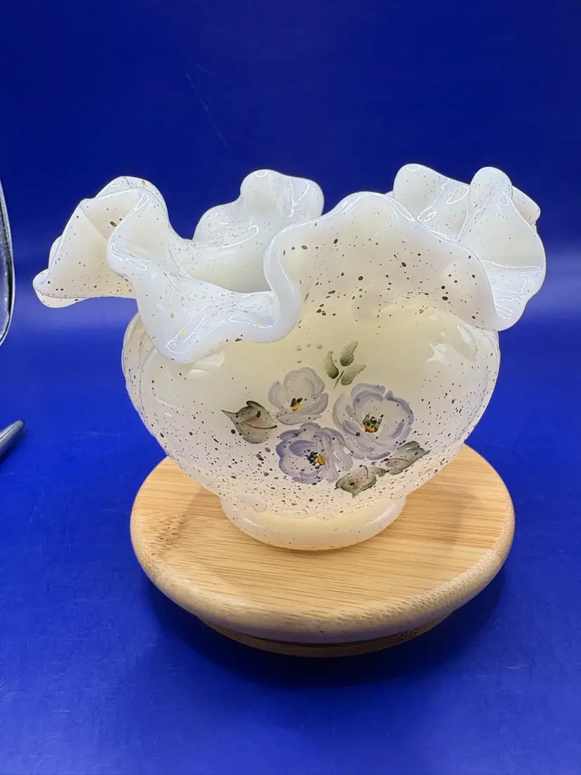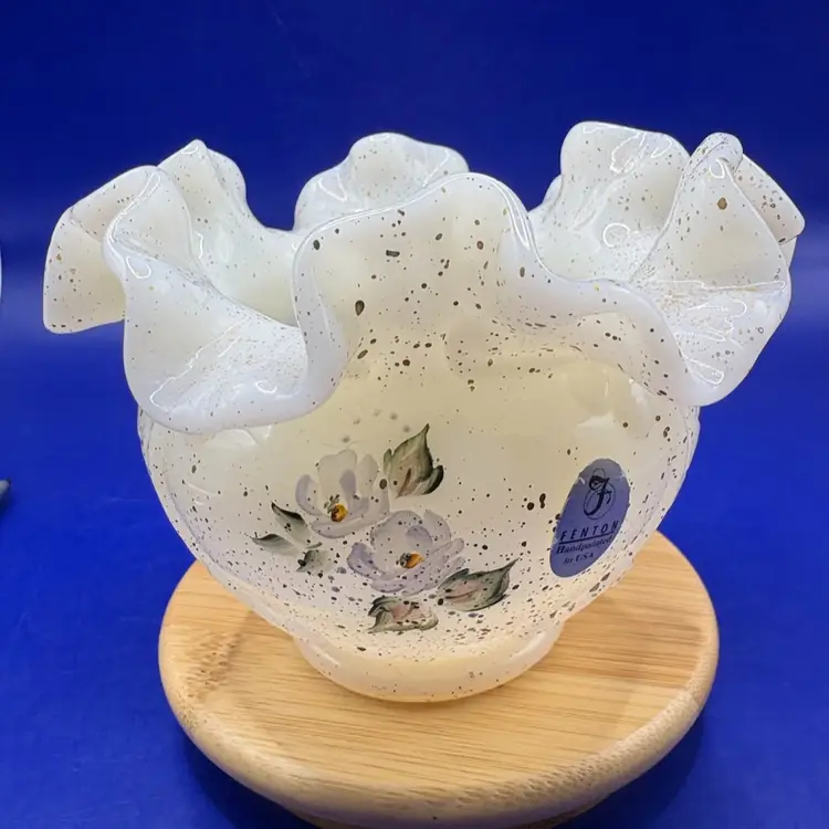 Fenton Romance Collection Ruffled Edge Bowl Bowl is off Whitley with gold flecks Features white roses Signed by Beverly Cumberledge 1990s Measures 3 1/2 inches tall by 4 3/4 inches at widest point In excellent condition no chips or cracks