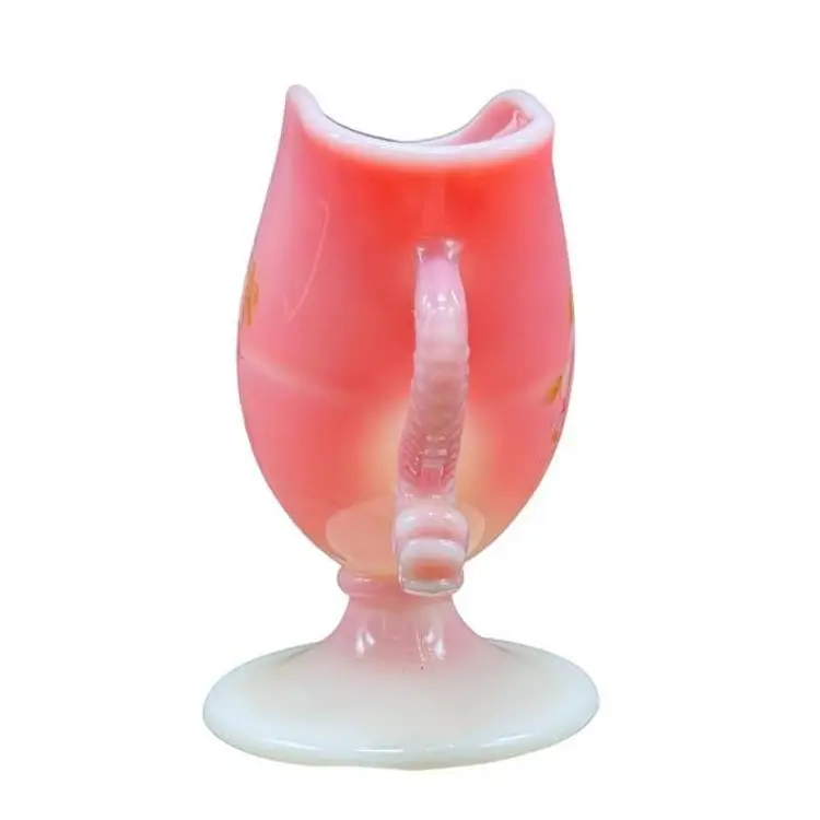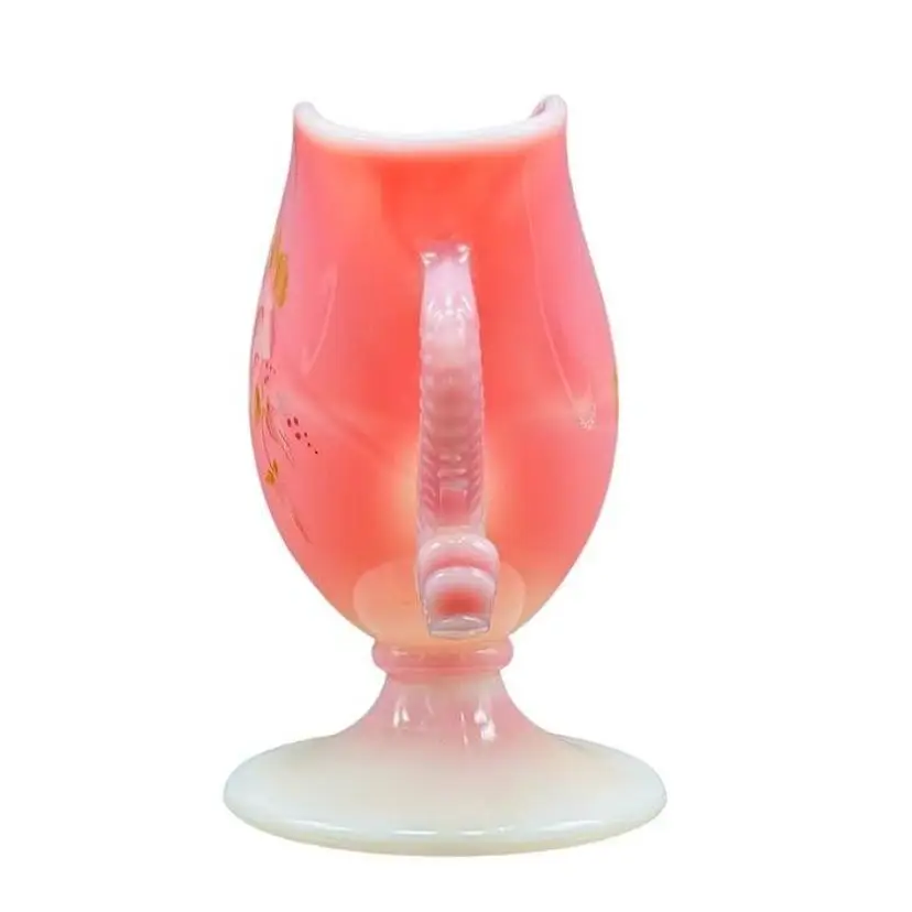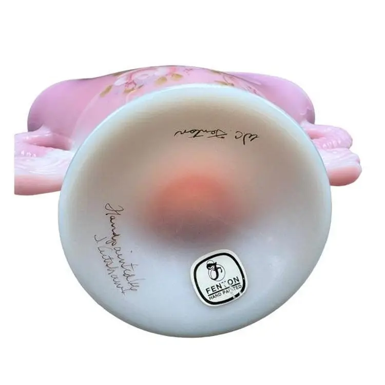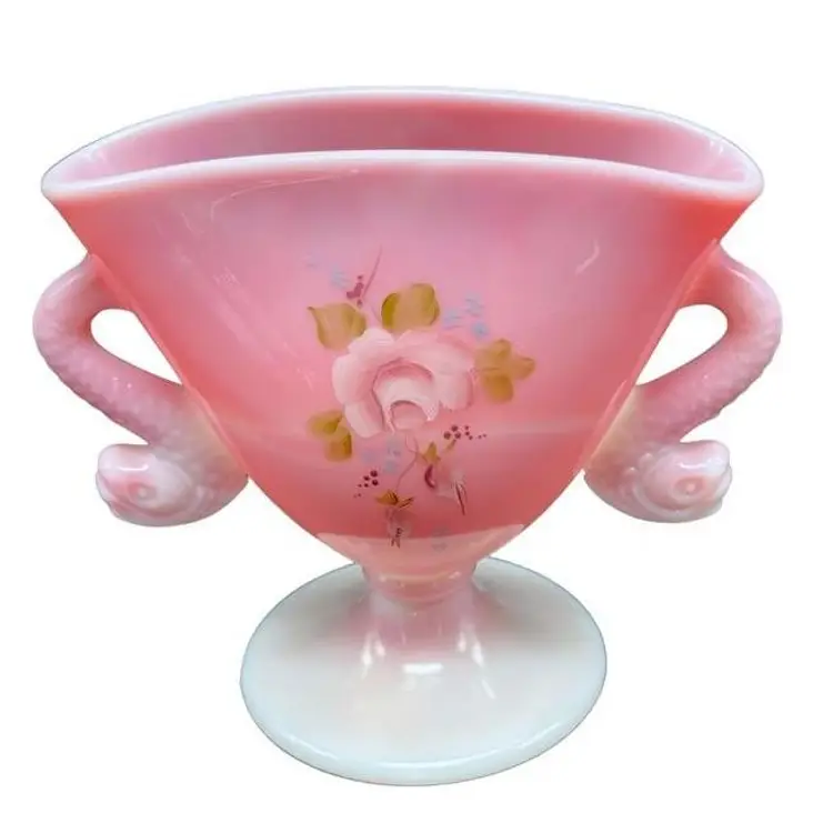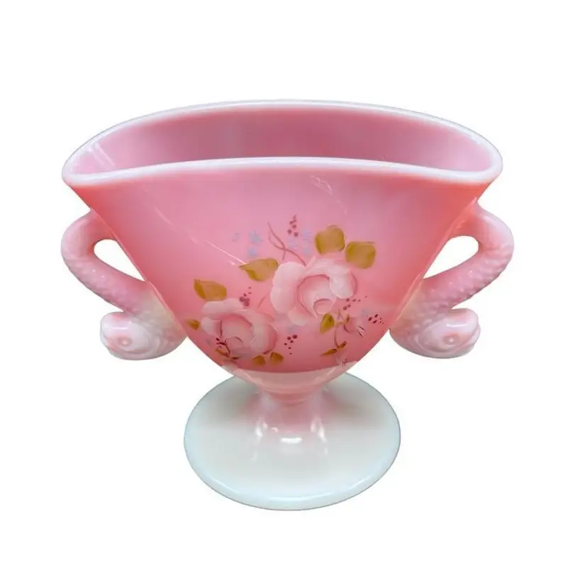 A beautiful vintage piece by Fenton Glass, this Rosalene pink and white slag glass features elegant double handles shaped like dolphins. Ideal for collectors and decor enthusiasts. Good vintage condition, no chips or cracks.