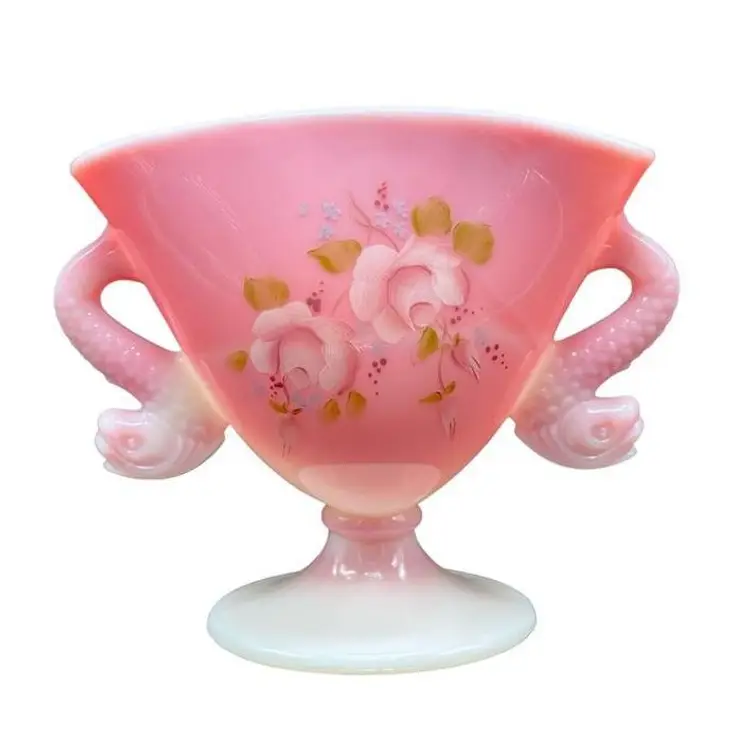 • Vintage Fenton Rosalene glass • Double handle dolphin design • Pink slag glass • Ornate floral detailing • • 7"W x 4"D x 6"H