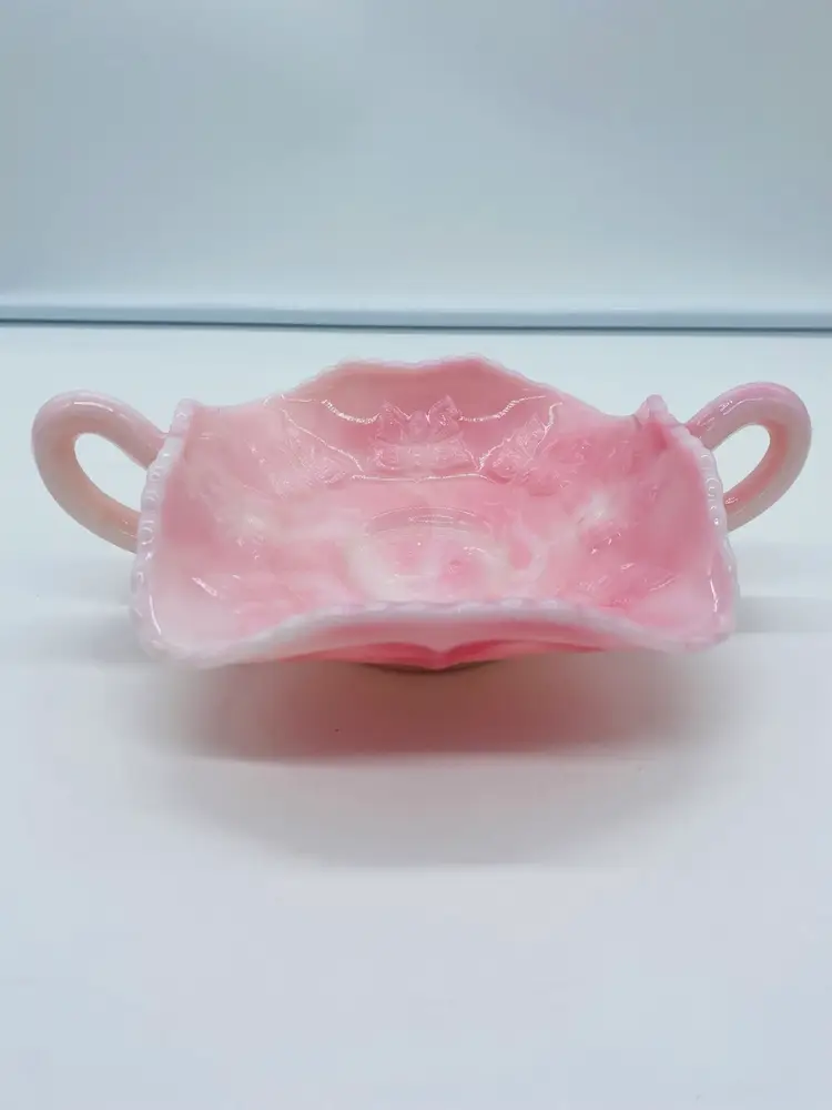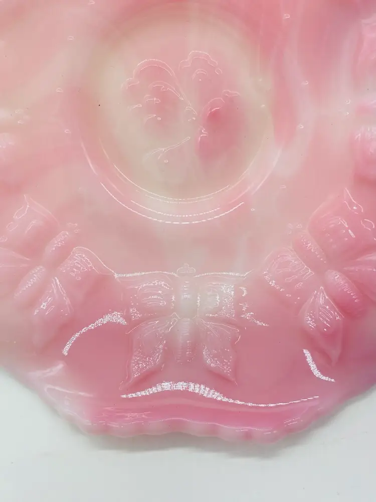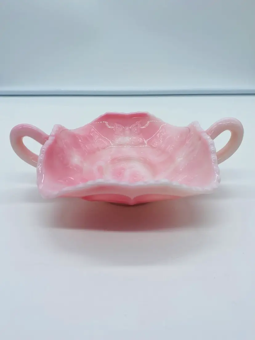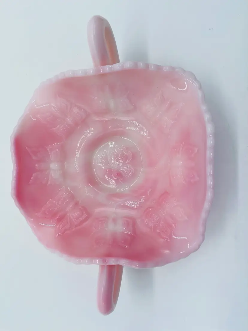 This is in excellent condition. There are no chips or cracks. It is a beautiful Pink color with Butterflies. It has two curved handles. The dish is 6" square and 2" tall. It measures 8-1/4" from handle to handle.