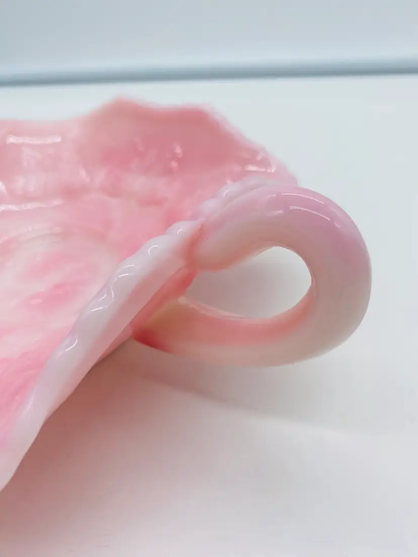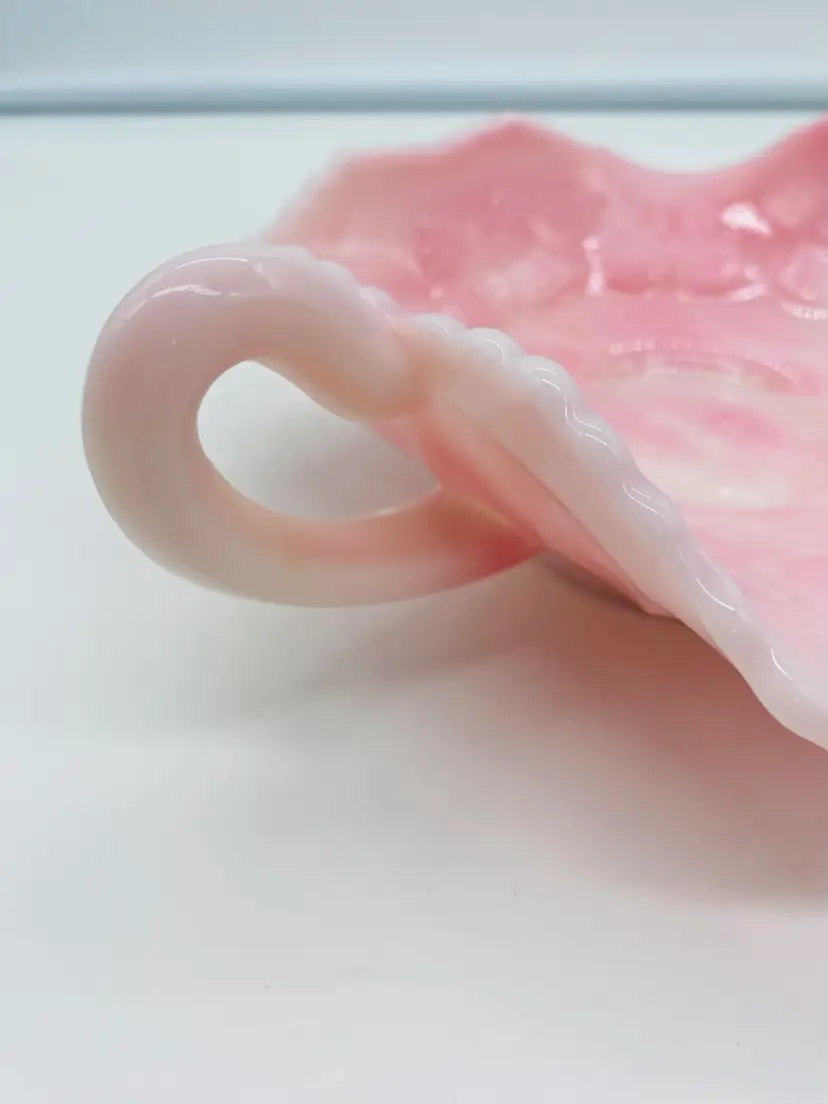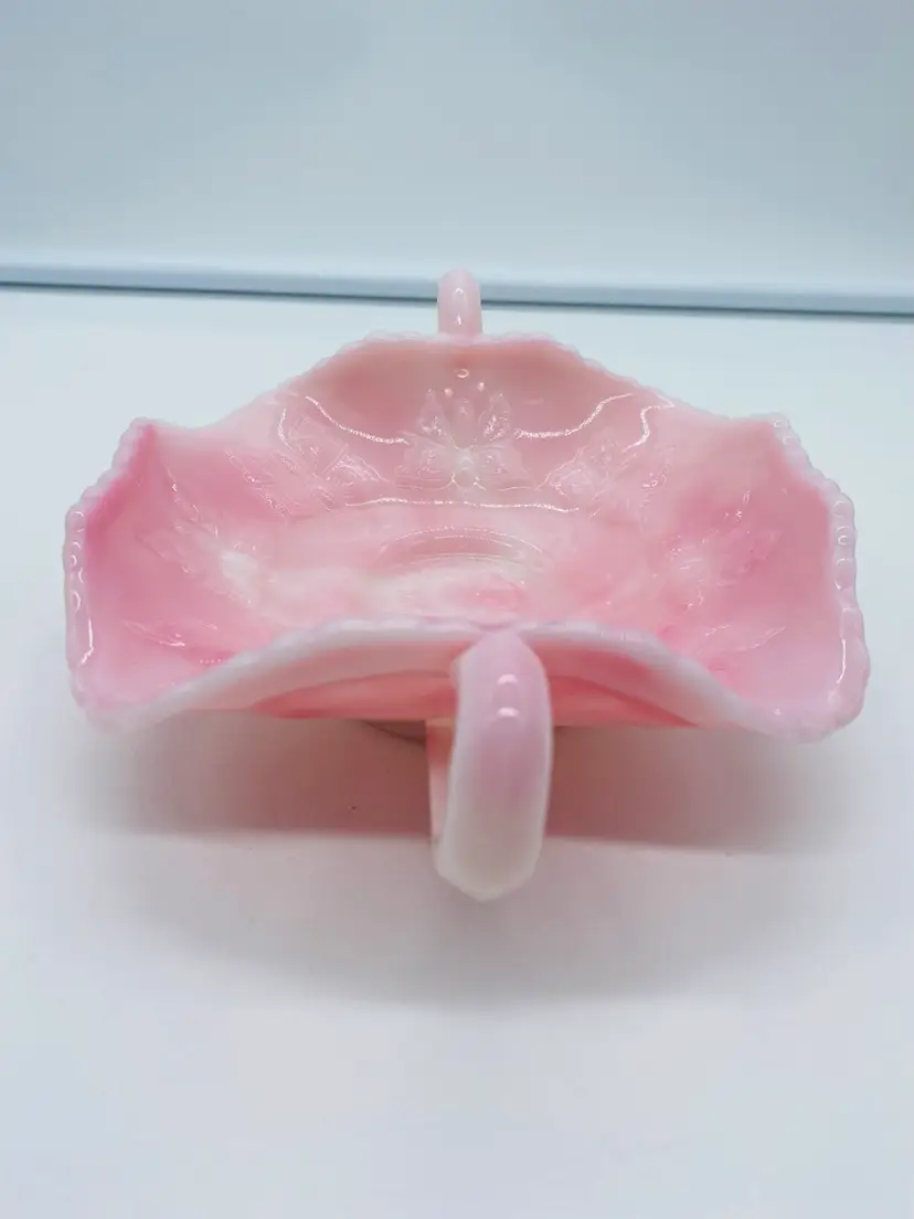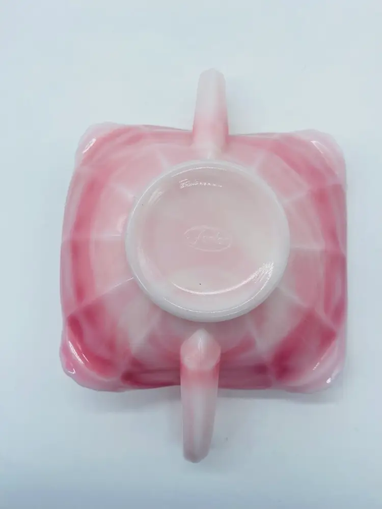 This is in excellent condition. There are no chips or cracks. It is a beautiful Pink color with Butterflies. It has two curved handles. The dish is 6" square and 2" tall. It measures 8-1/4" from handle to handle.
