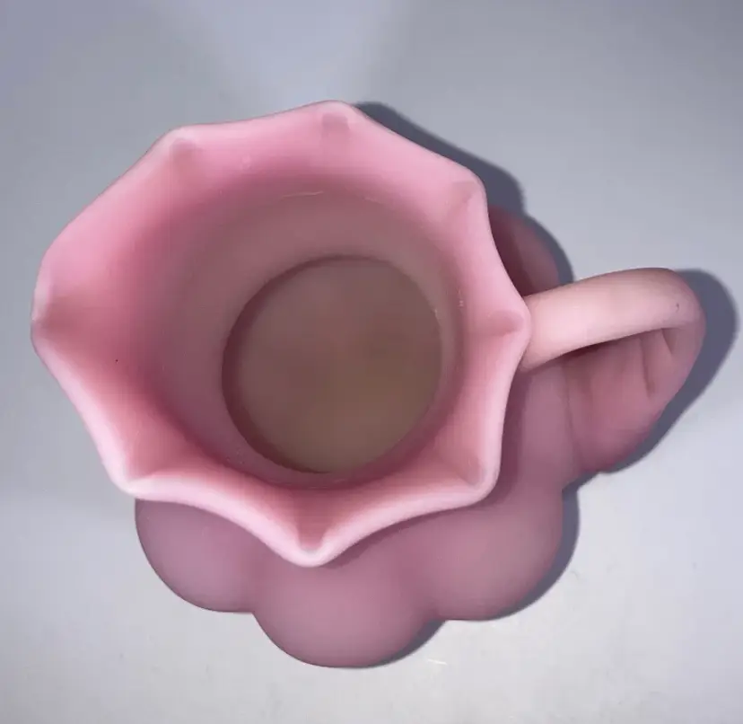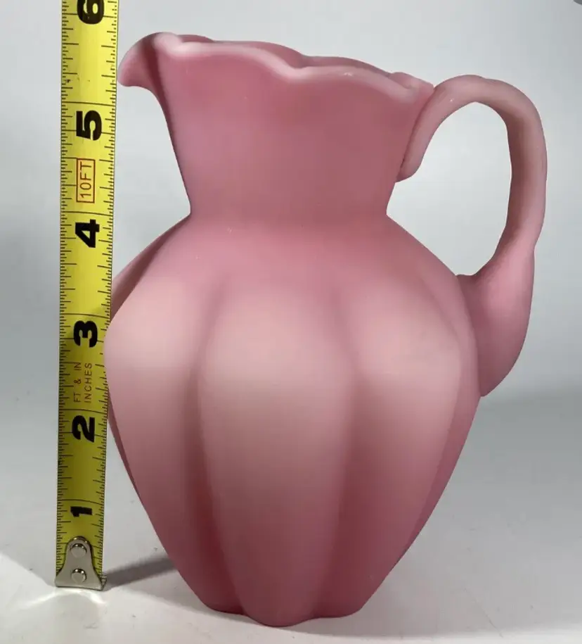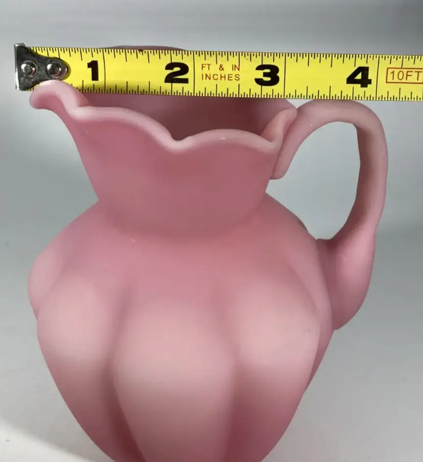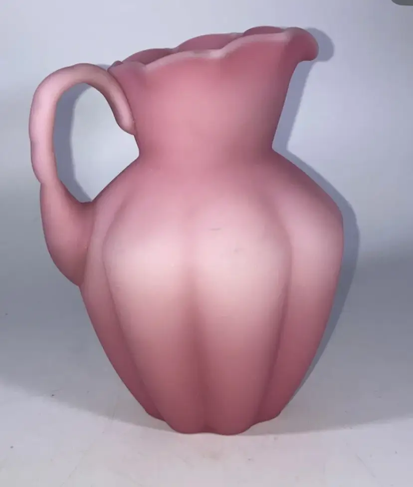 Fenton Rose Pink Satin Syrup Pitcher Creamer Melon Rib Ruffle Edge. Measures approximately 5.5” tall and 44” spout to handle. No chips cracks or repairs. Please look at all pictures carefully as they are part of my descriptions.