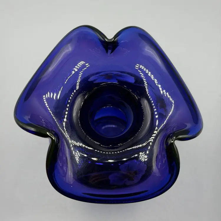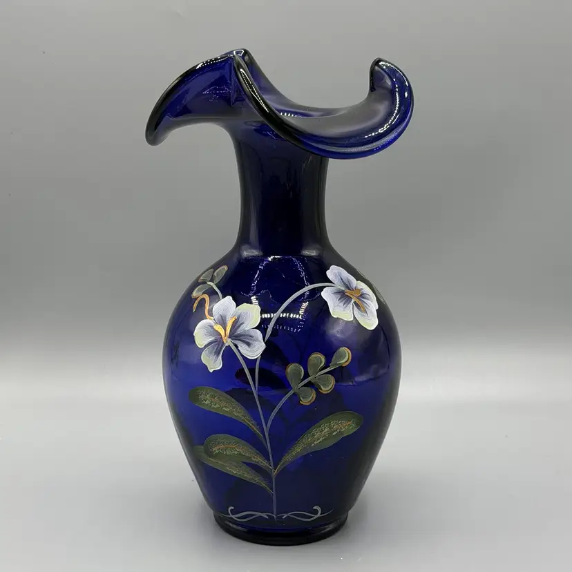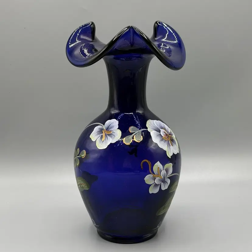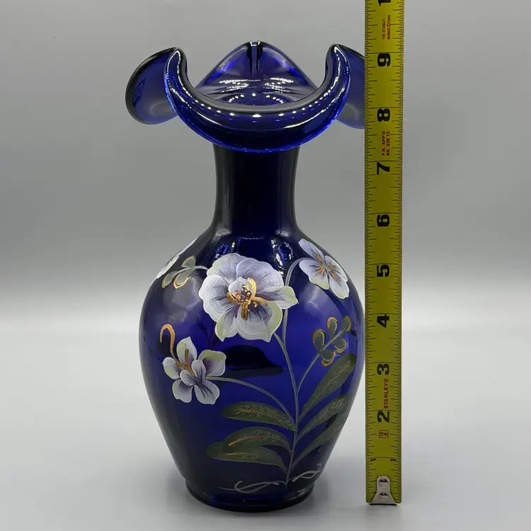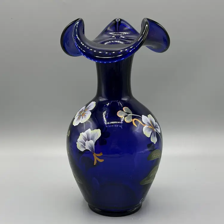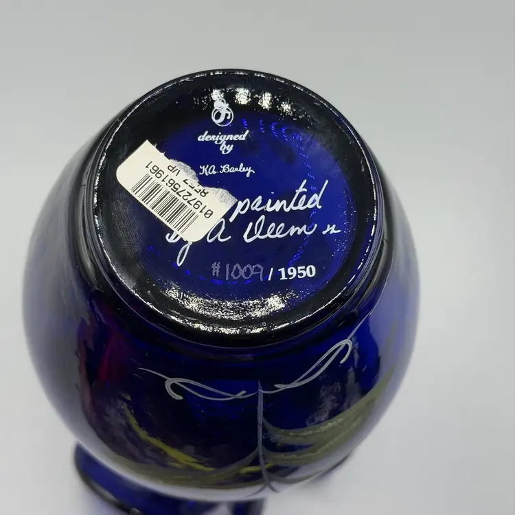 This striking vase is a deep purple that seems blue in certain light. The hand painted flowers are accented in gold. There are no chips or cracks. The original label is present but has some damage. It is signed by the decorator and is about 9-1/8 inches tall.