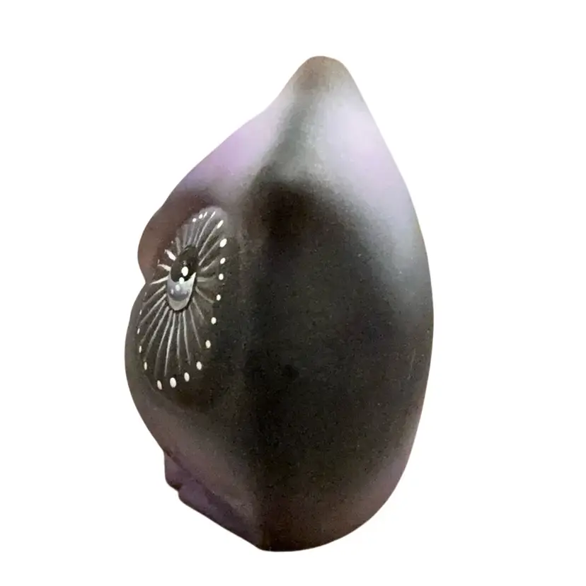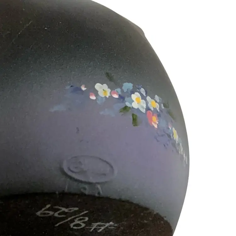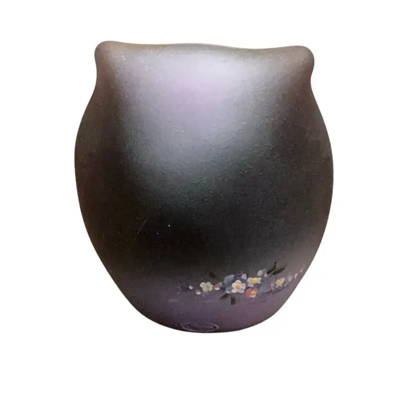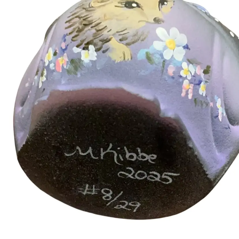 Adorable little hand painted hedgehog smelling flowers on a purple satin owlet figurine. The owlet’s expressive eyes are looking up as if to ask “how did this hedgehog get on my belly?” There is an iridescent sheen to the overall piece. Artist signed. No original Fenton sticker in place but the stamped Fenton logo is on the back.