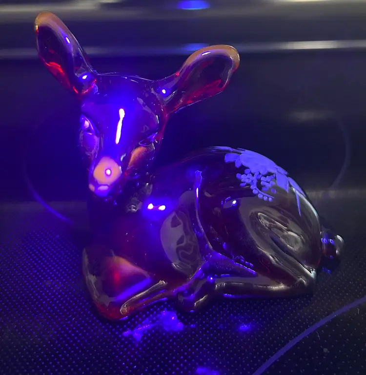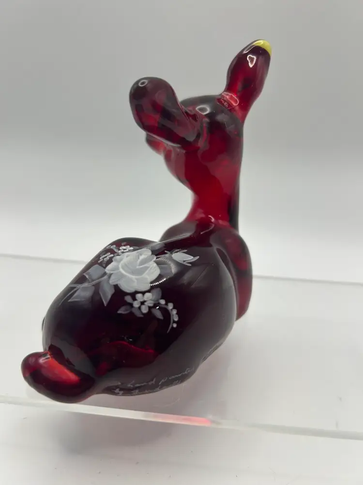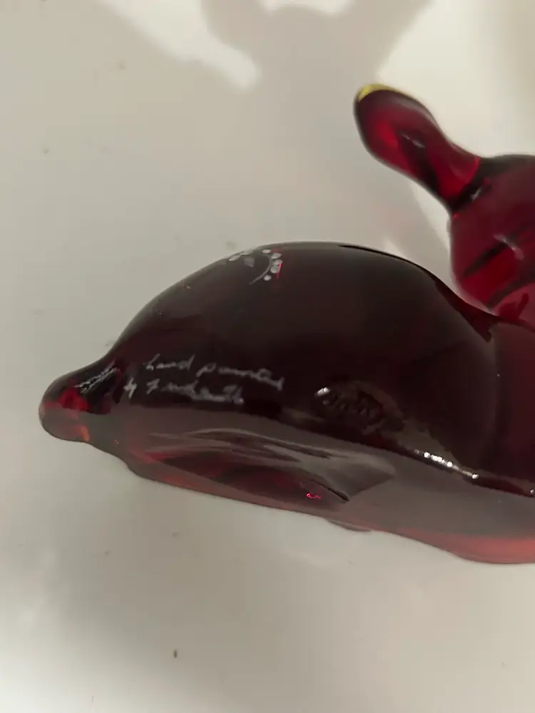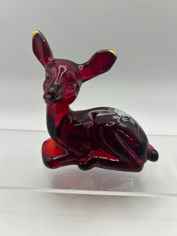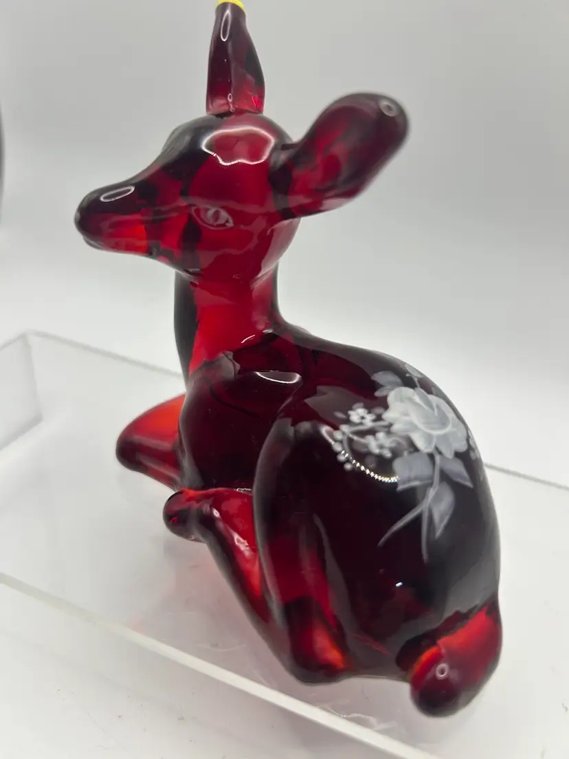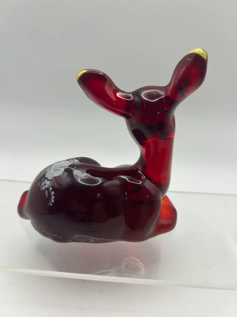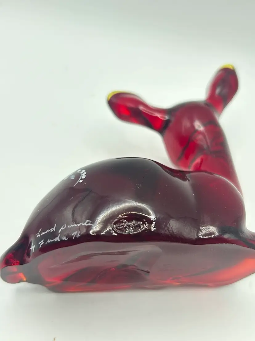 Beautiful Fenton, hand painted and signed. Laying fawn deer is in mint condition, no chips, cracks or repairs. She measures approximately 4” long and 3 1/2” tall. I took the black light to it and am pretty sure the tips of ears and nose glow as you can see in the photo.