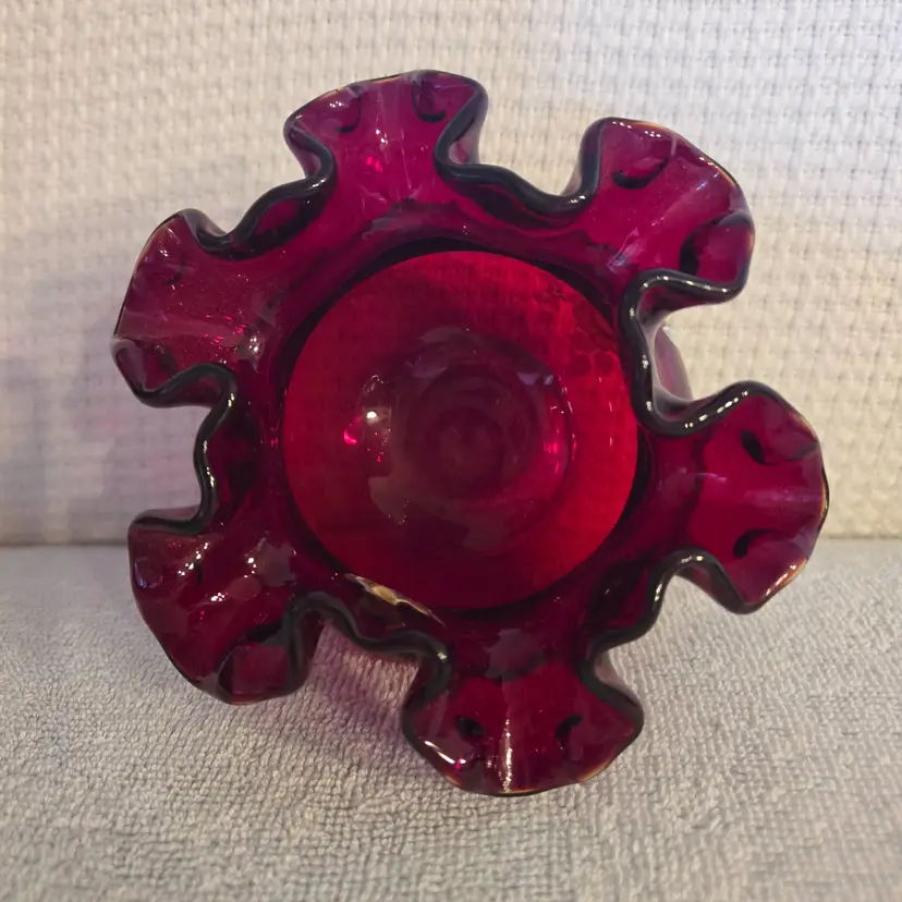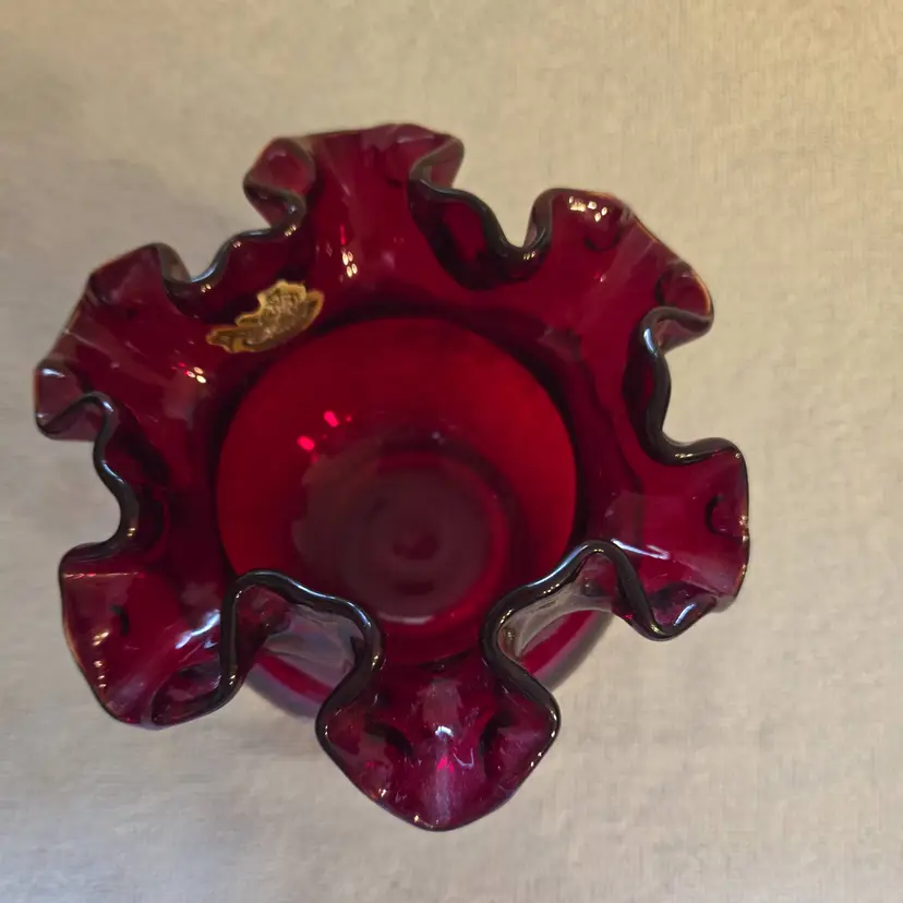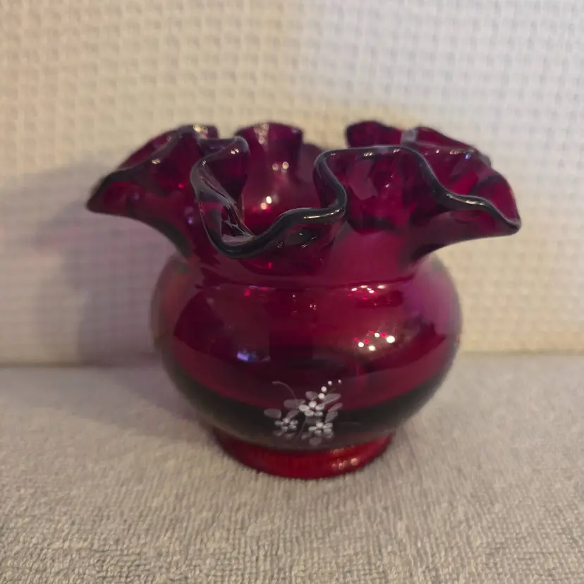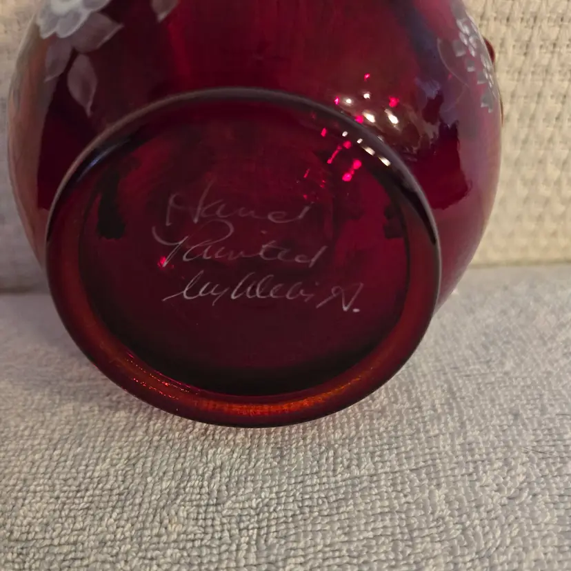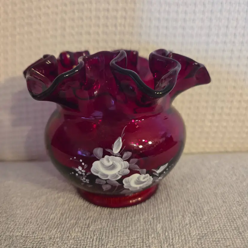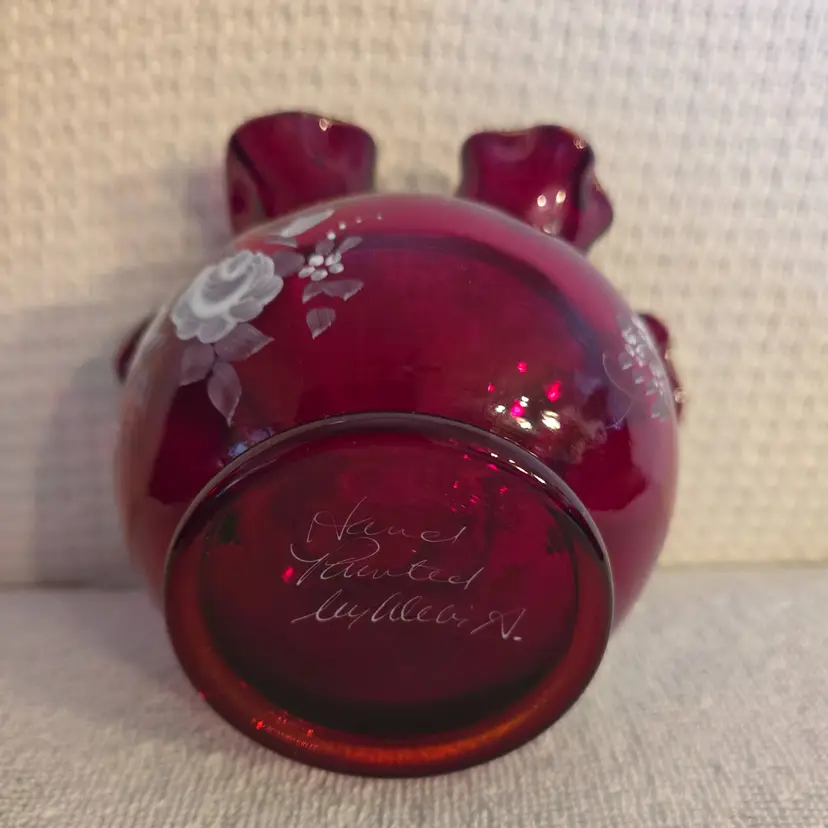 Beautiful vibrant red bowl with hand painted white rose decorations. Signed by the artist. Has an original sticker. Measures 3 1/2" tall, and 5" wide. In excellent condition. No chips, cracks, or repairs.